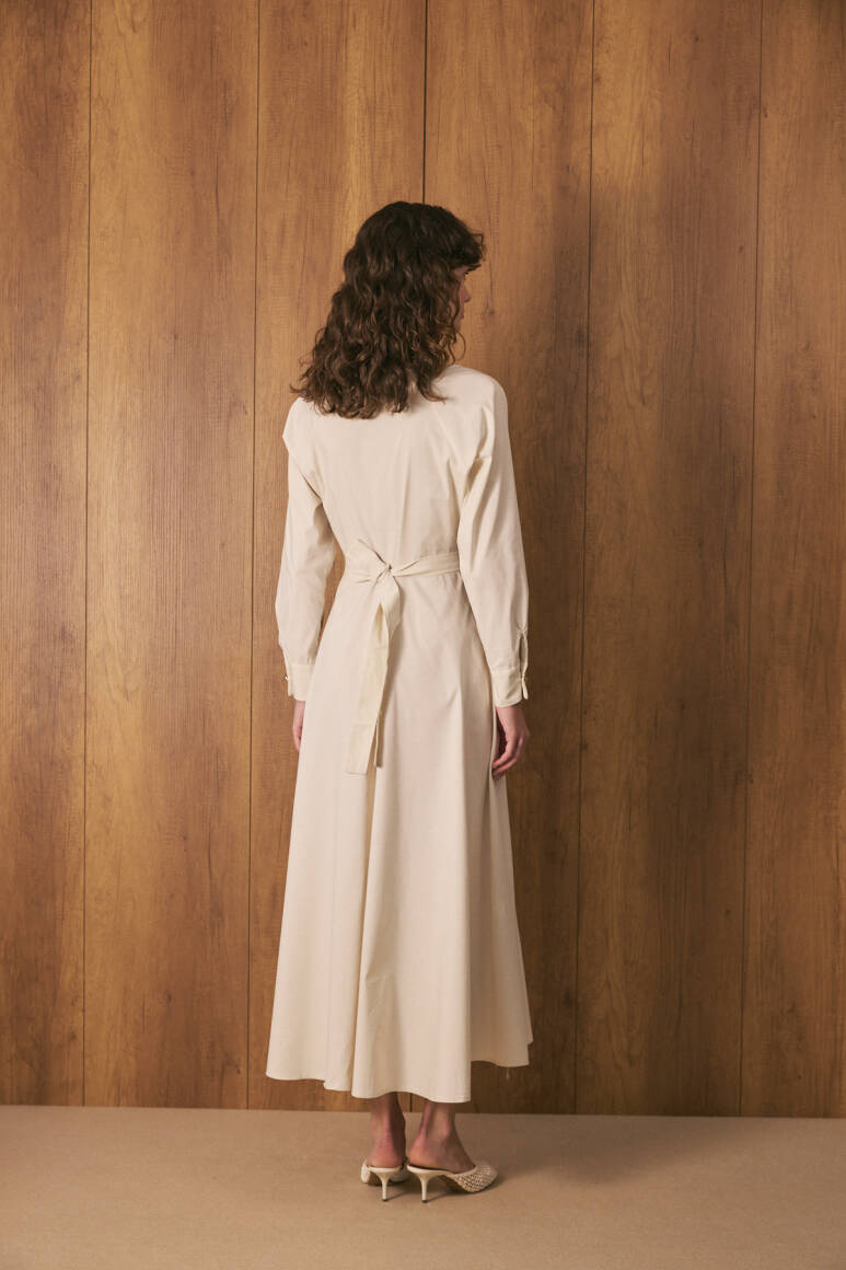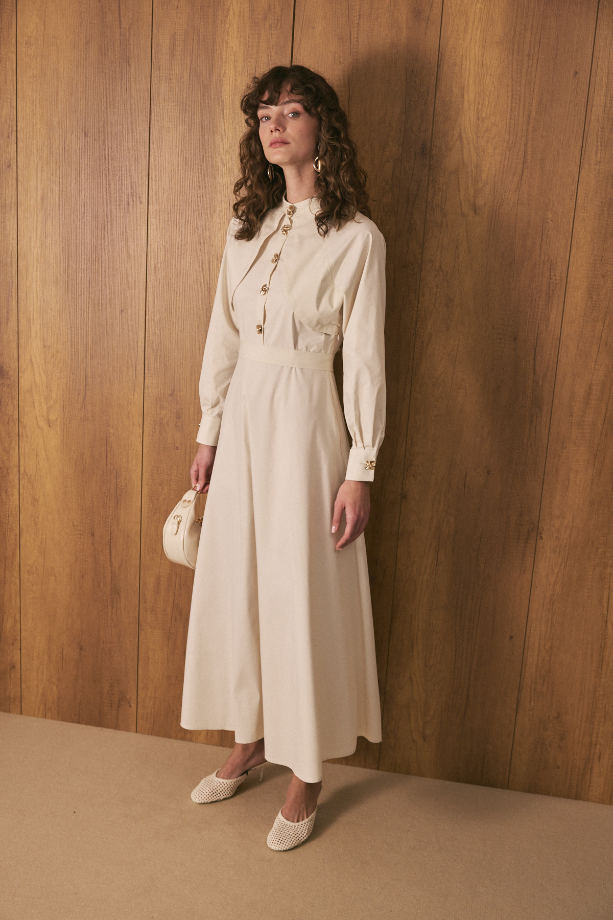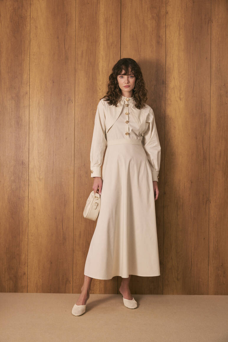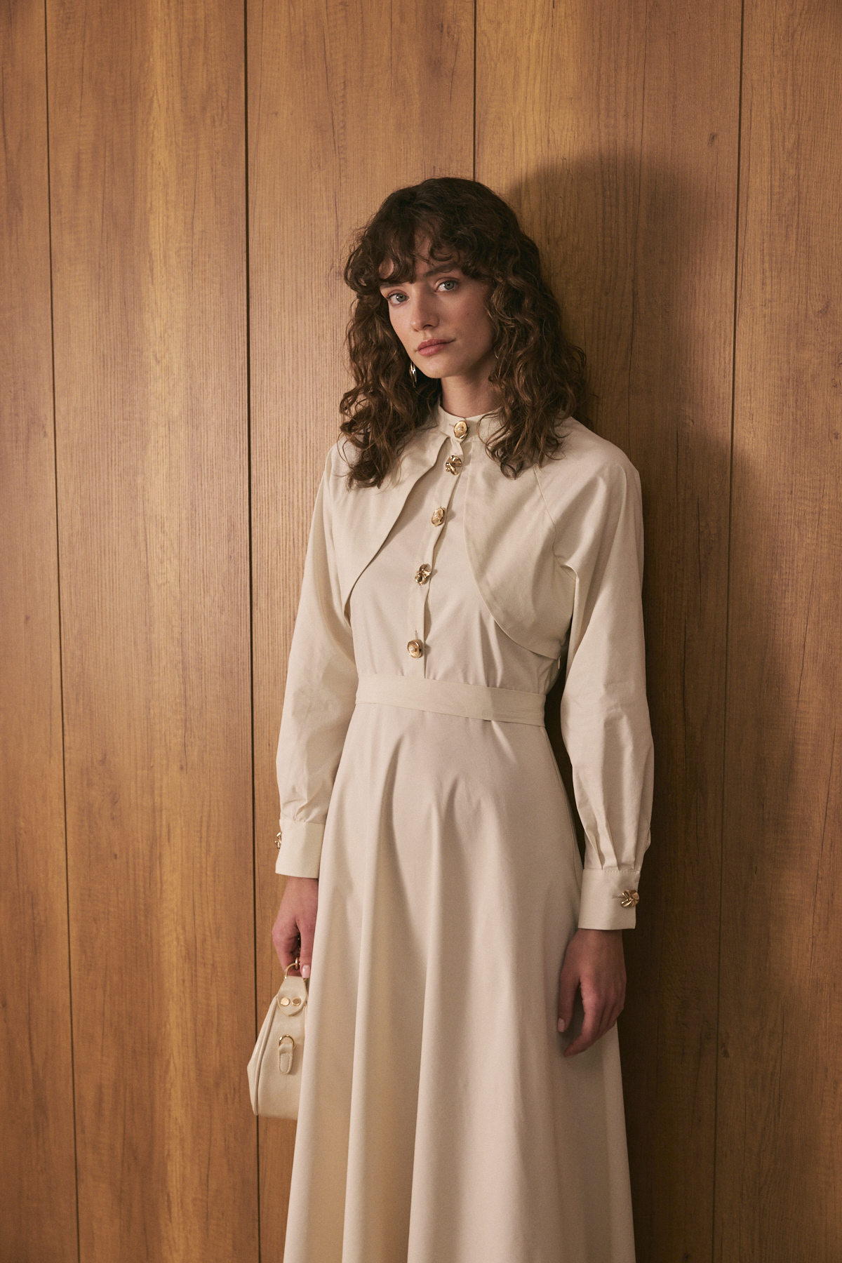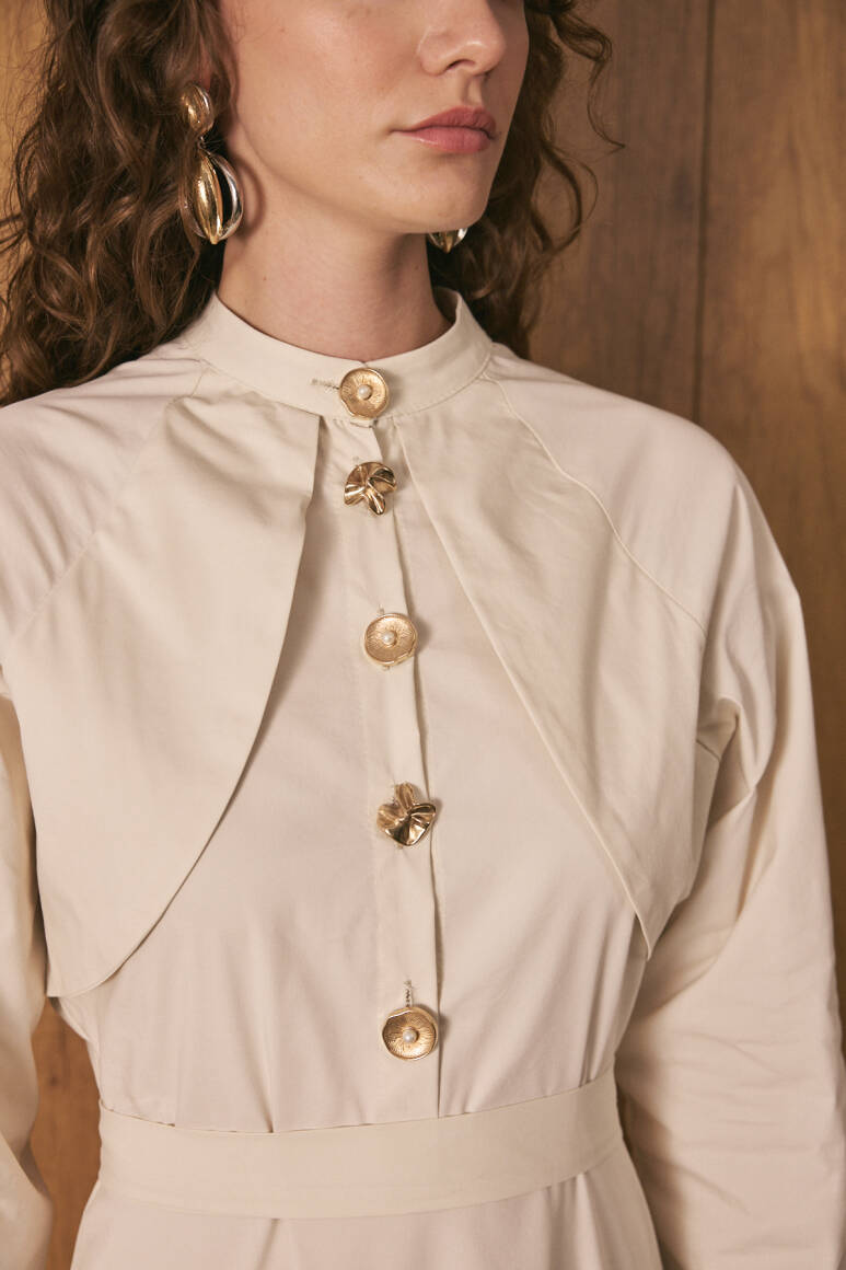 Bilek kısmında manşet ve düğme detayı, ön kısmında kapama detaylı dekoratif düğmeler, dik yaka, uzun kollu
