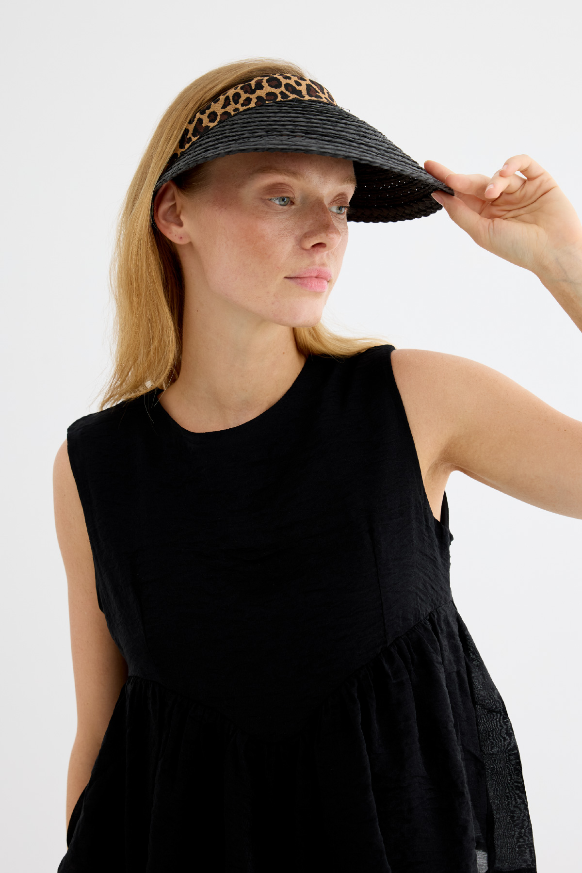 Hasırdan üretilmiş vizör, leopar desenli bandıyla modern ve cesur bir dokunuş sunuyor. Hem plajda hem de şehirde şıklığından ödün vermeden korunmanı sağlayar