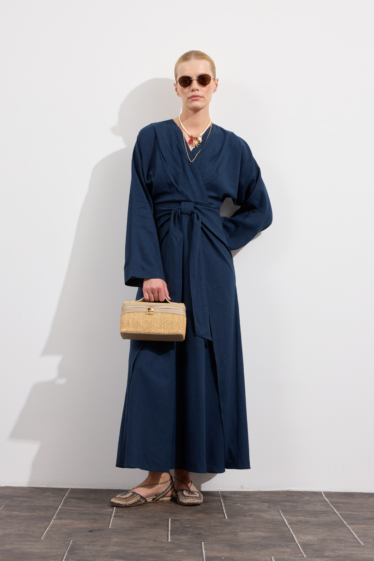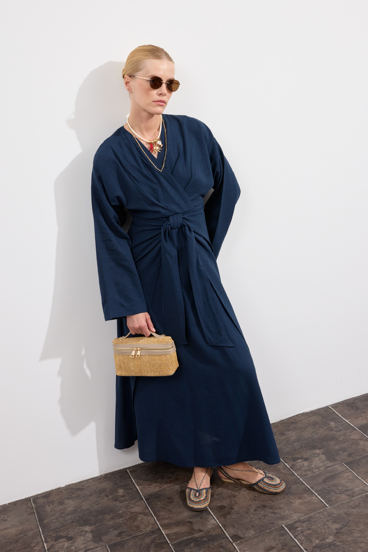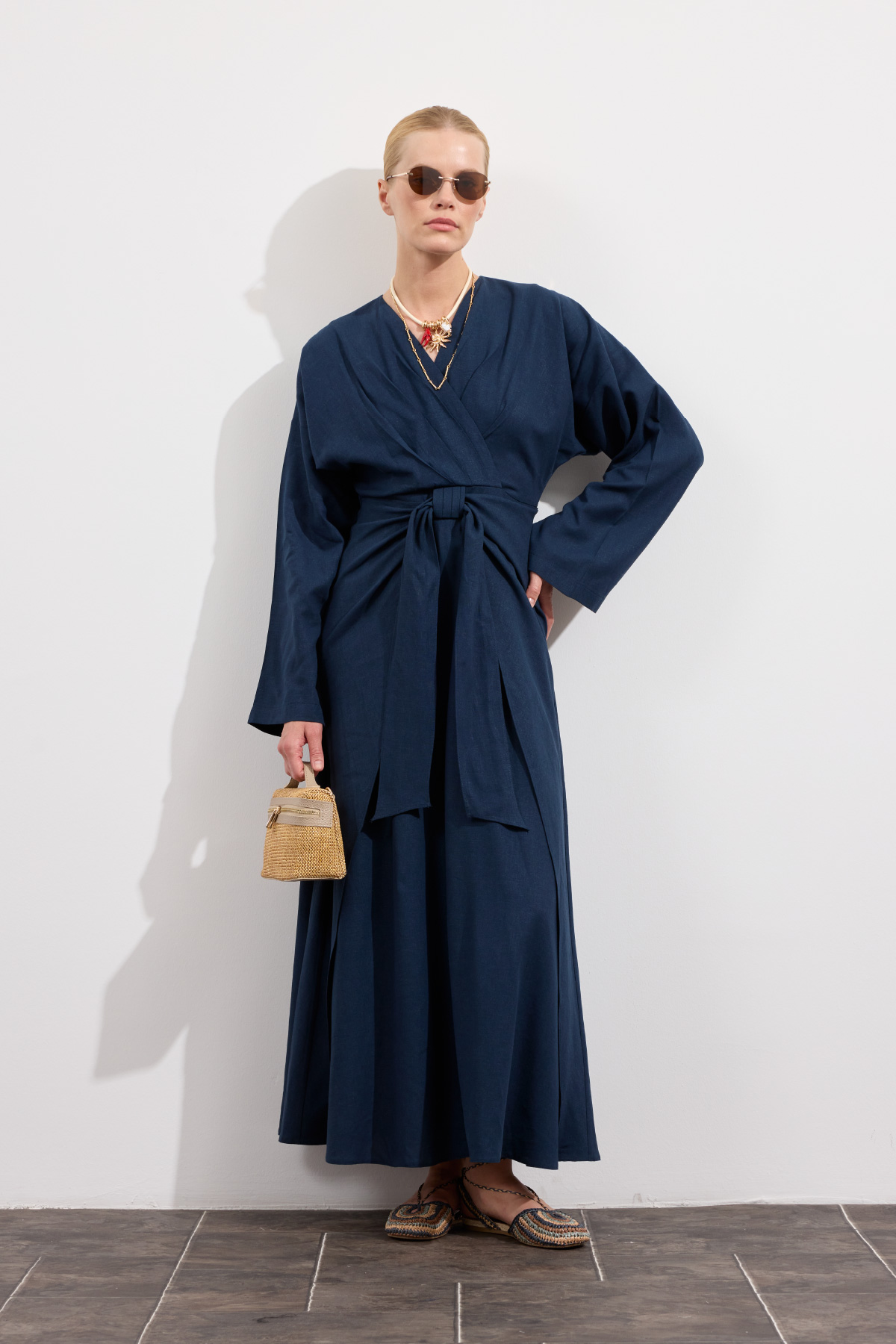 Mirella Kruvaze Bağlamalı Keten Elbise Lacivert