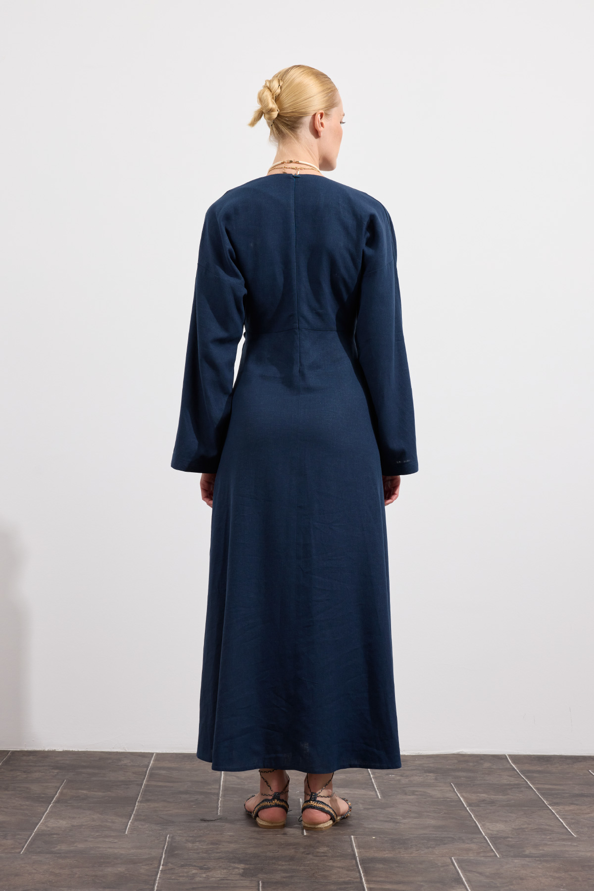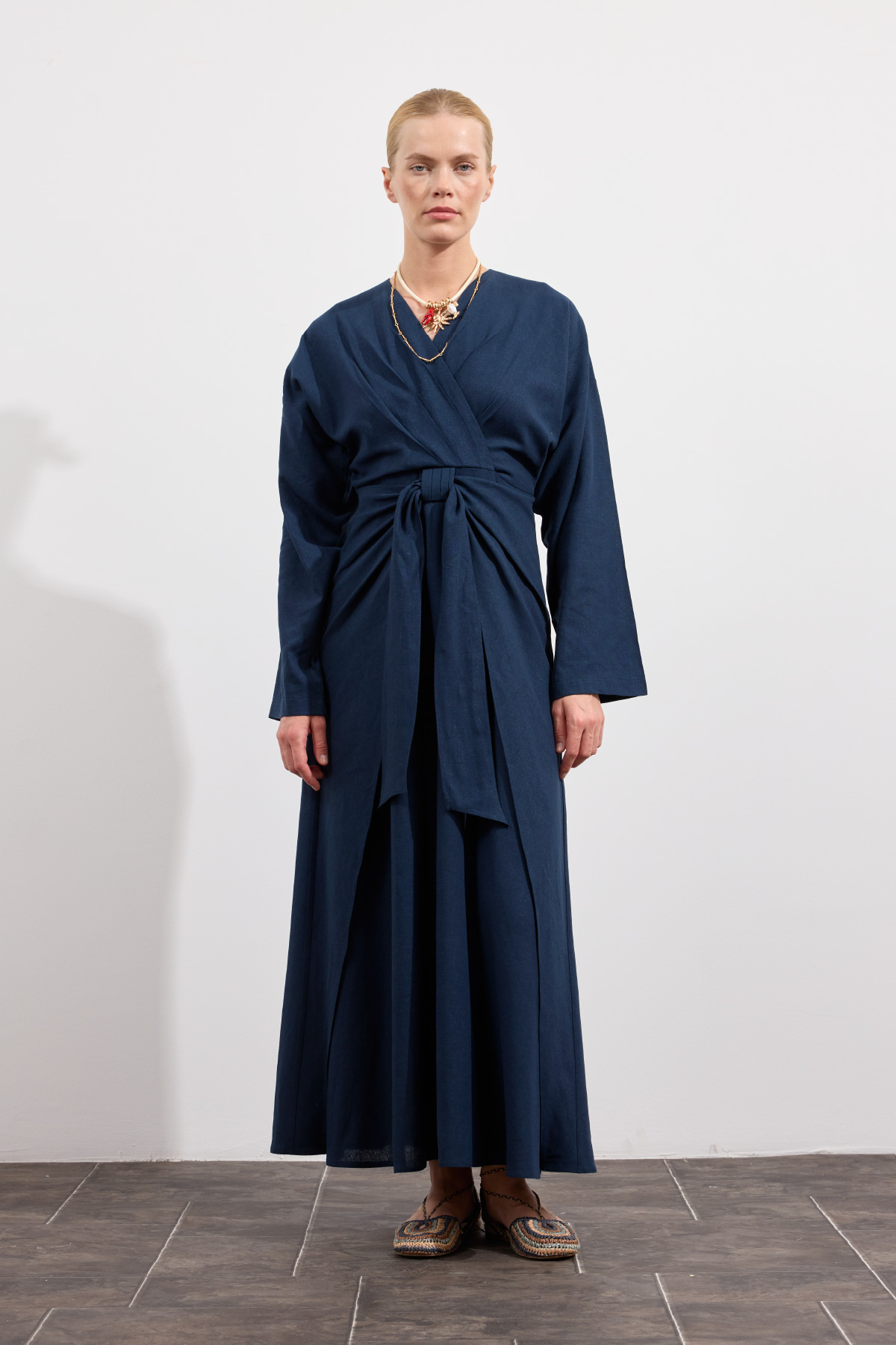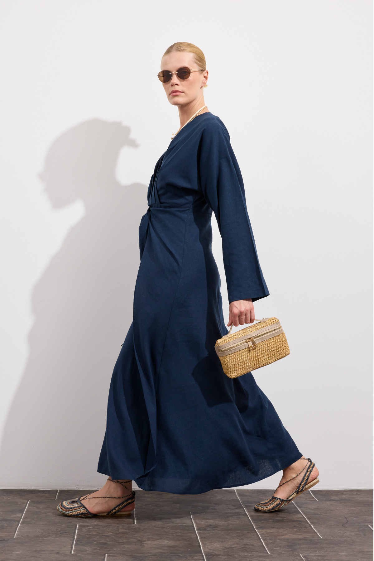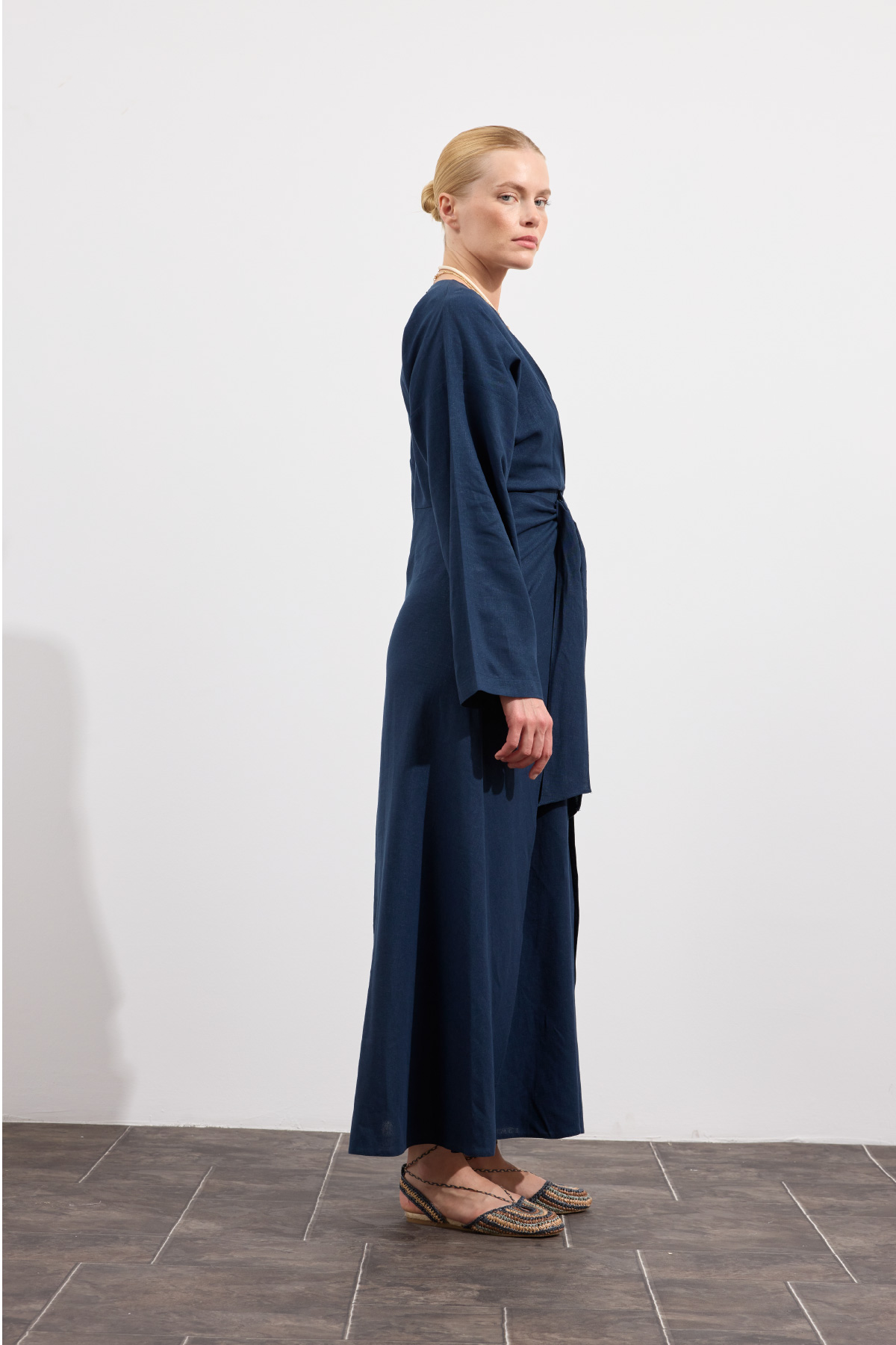 Mirella Kruvaze Bağlamalı Keten Elbise Lacivert