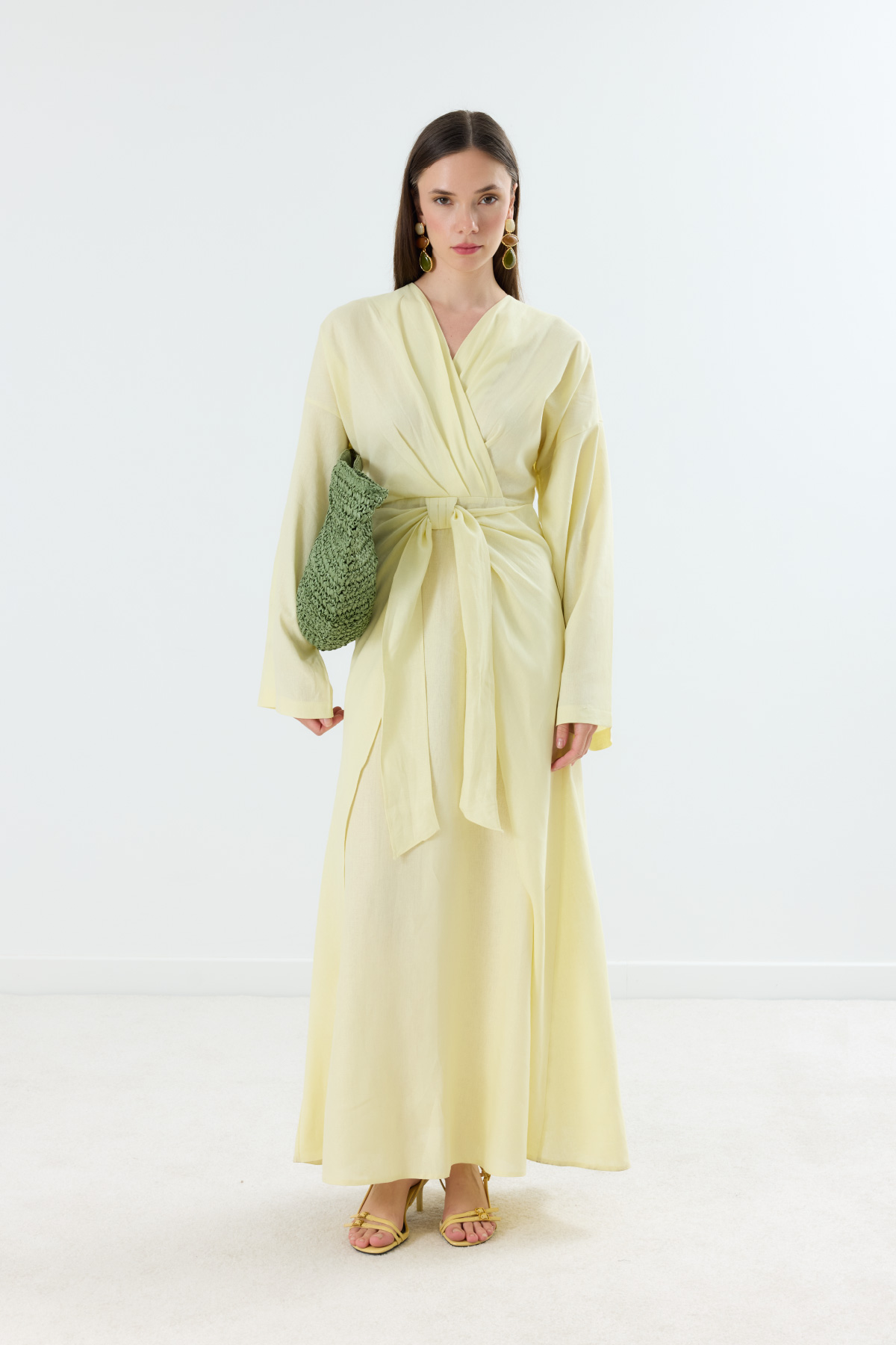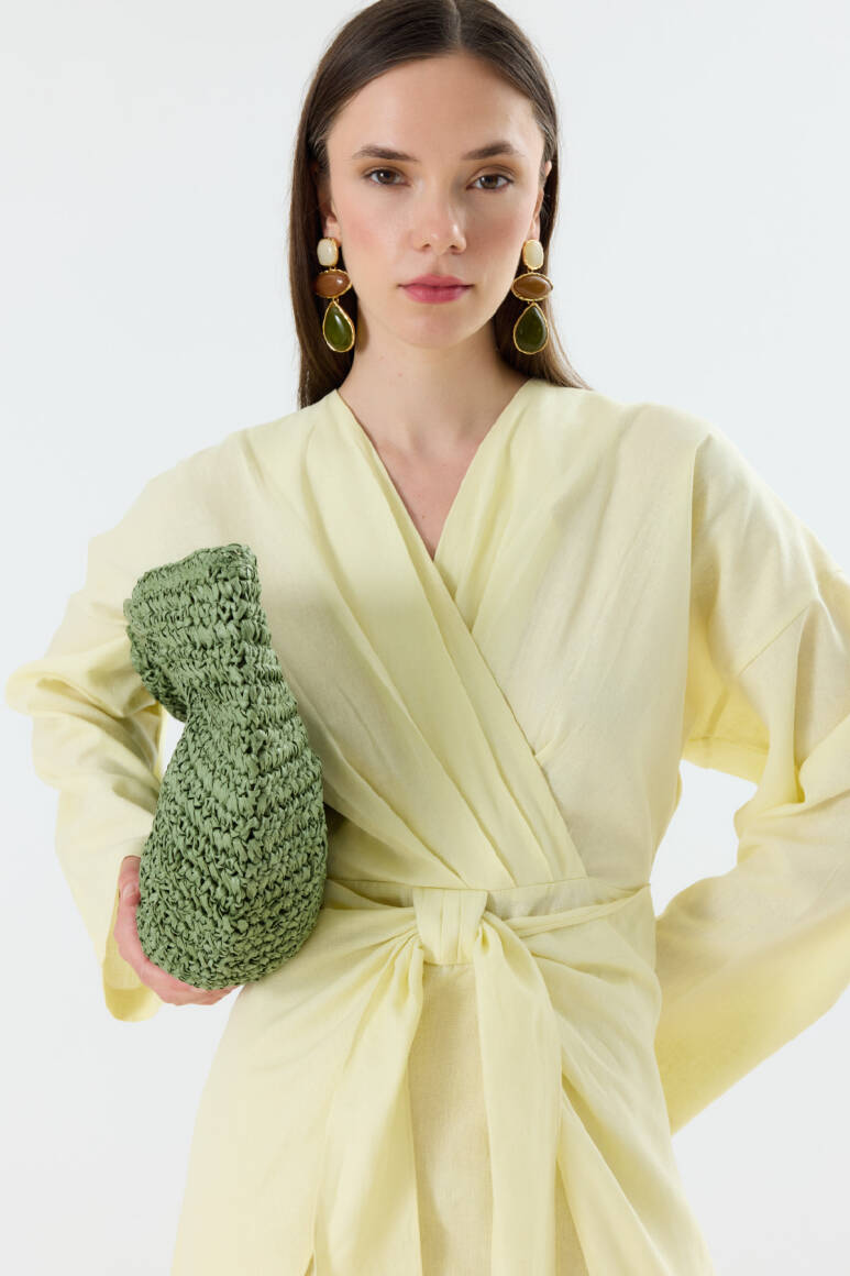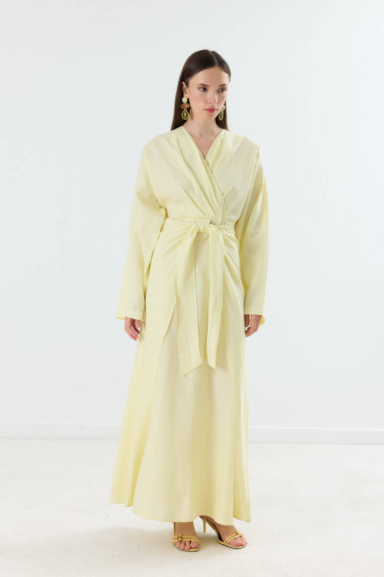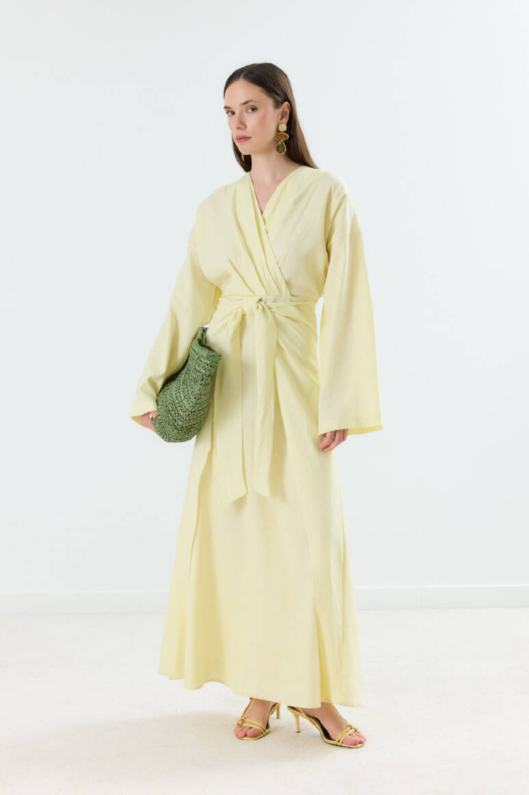 Mirella Kruvaze Bağlamalı Keten Elbise Sarı