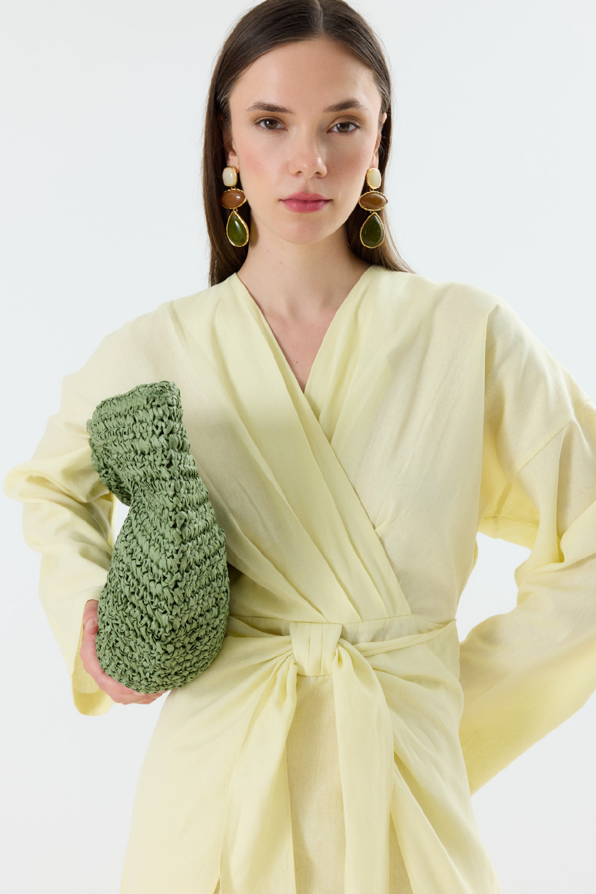 Modern ve zarif bir görünüm sunan kruvaze bağlamalı keten elbise, geniş kesimli kolları ve belde bağlamalı kuşağı ile dikkat çeker.% 100 Keten hafif kumaşı sayesinde rahat ve şık bir kullanım sunar. Hem günlük hem özel anlarda stilinize eşlik eder.