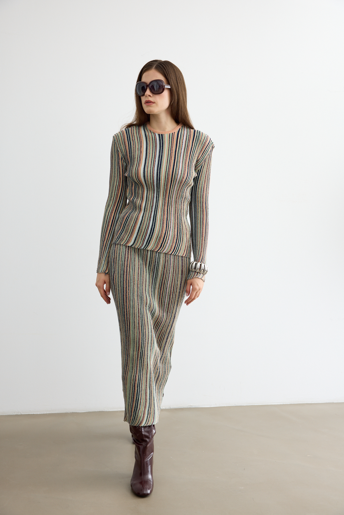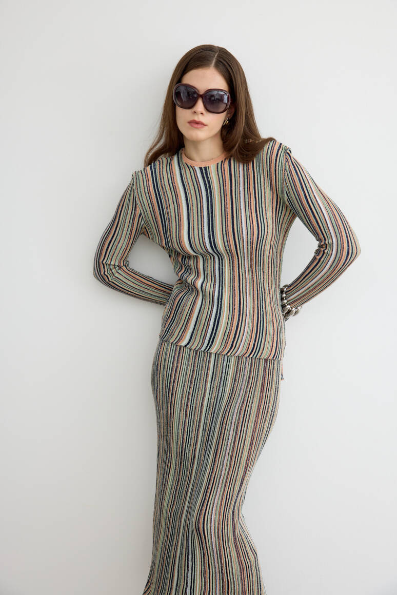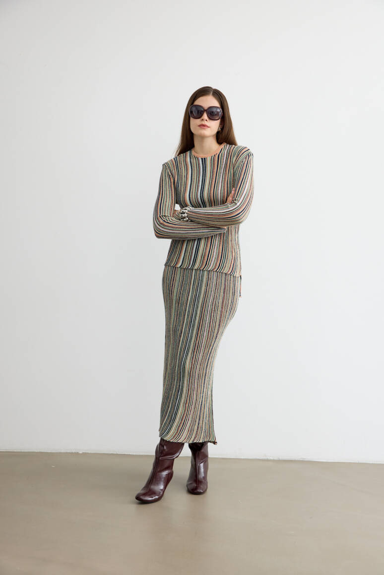 Hafif sim ışıltısıyla öne çıkan bu etekli triko takım, zarif kesimi ve modern duruşuyla sofistike bir stil sunuyor. Yumuşak dokusu ve rahat formu, hem günlük hem özel kombinlerde şıklığı konforla buluşturuyor.