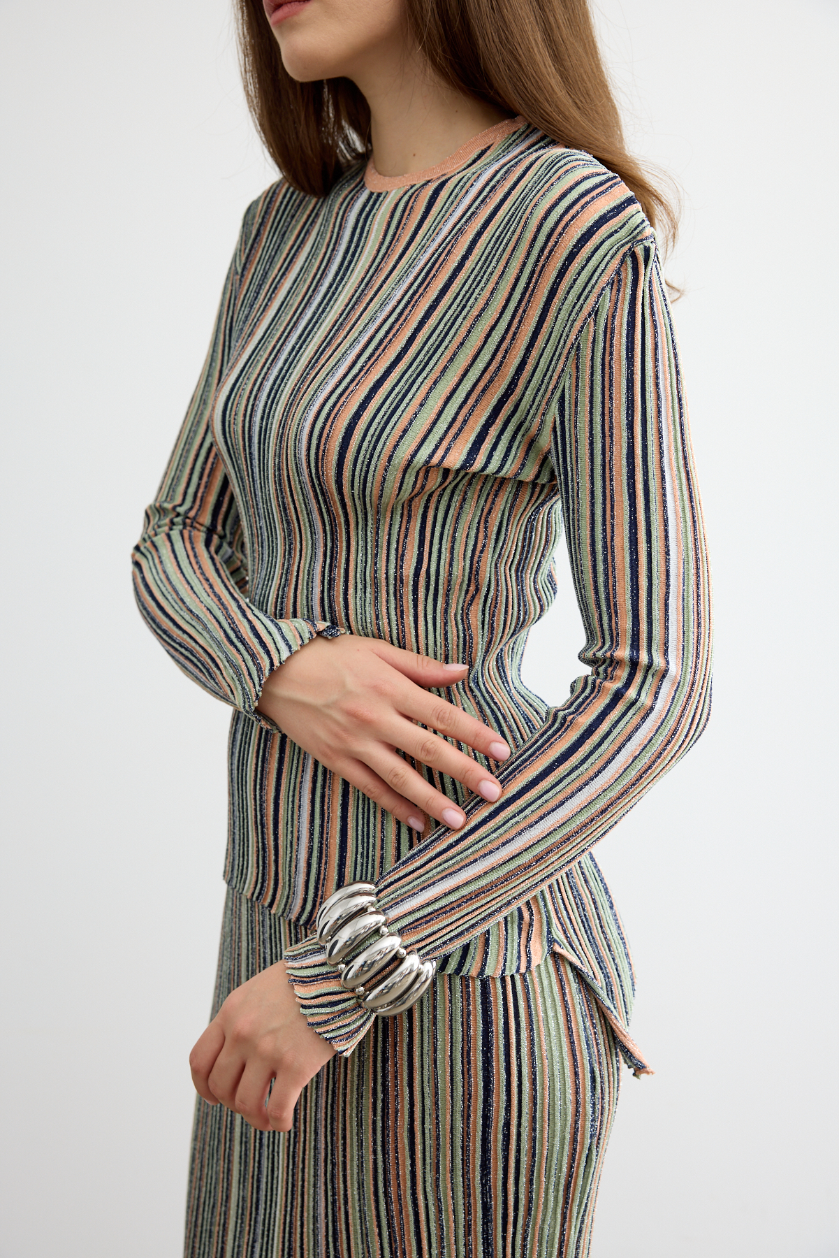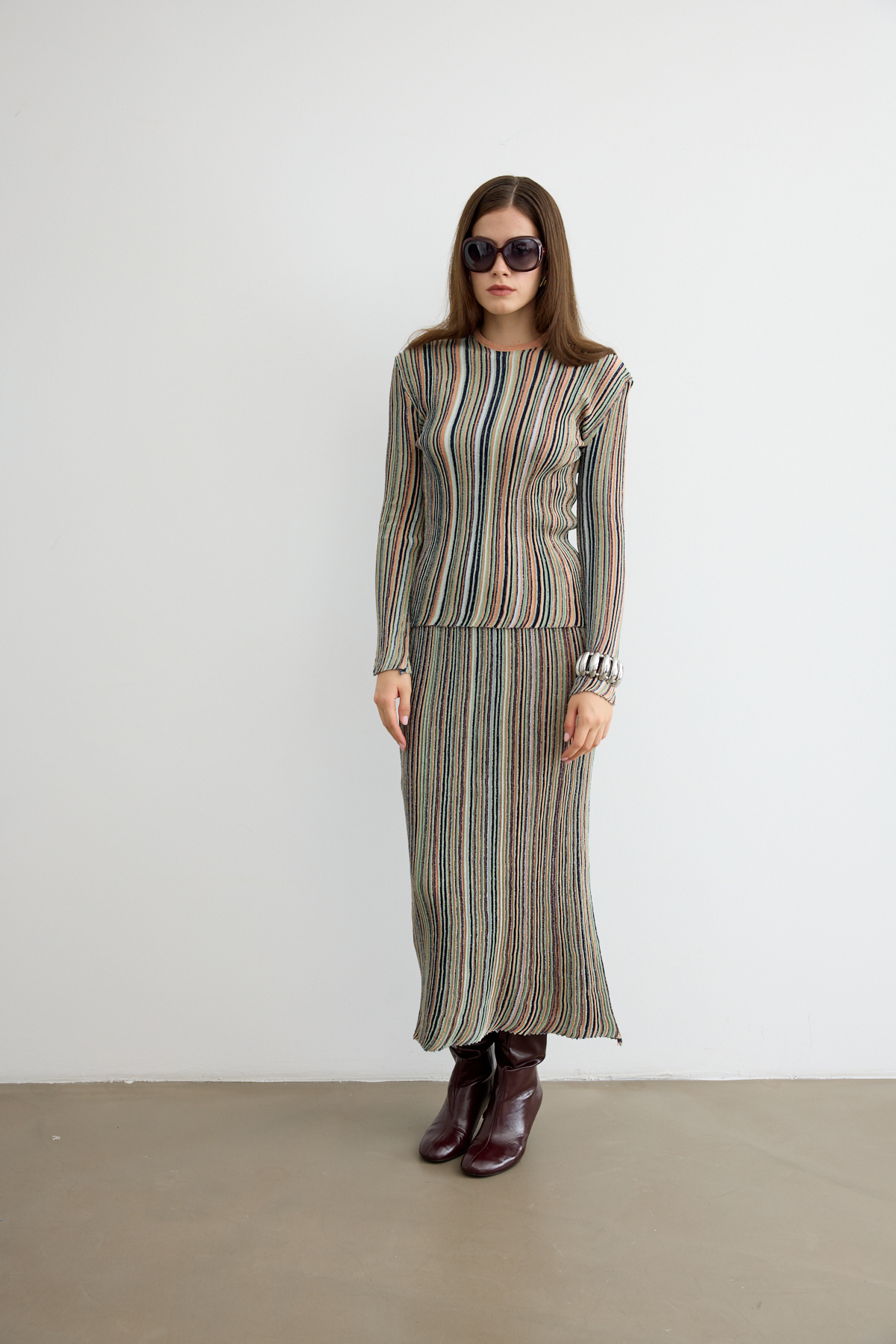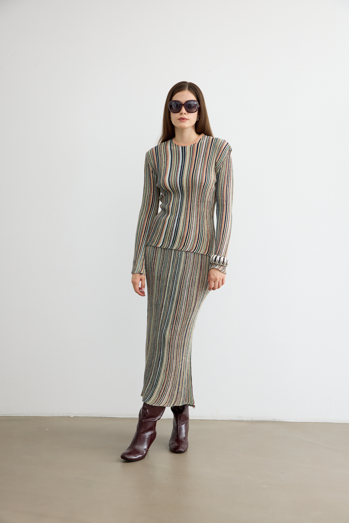 Hafif sim ışıltısıyla öne çıkan bu etekli triko takım, zarif kesimi ve modern duruşuyla sofistike bir stil sunuyor. Yumuşak dokusu ve rahat formu, hem günlük hem özel kombinlerde şıklığı konforla buluşturuyor.