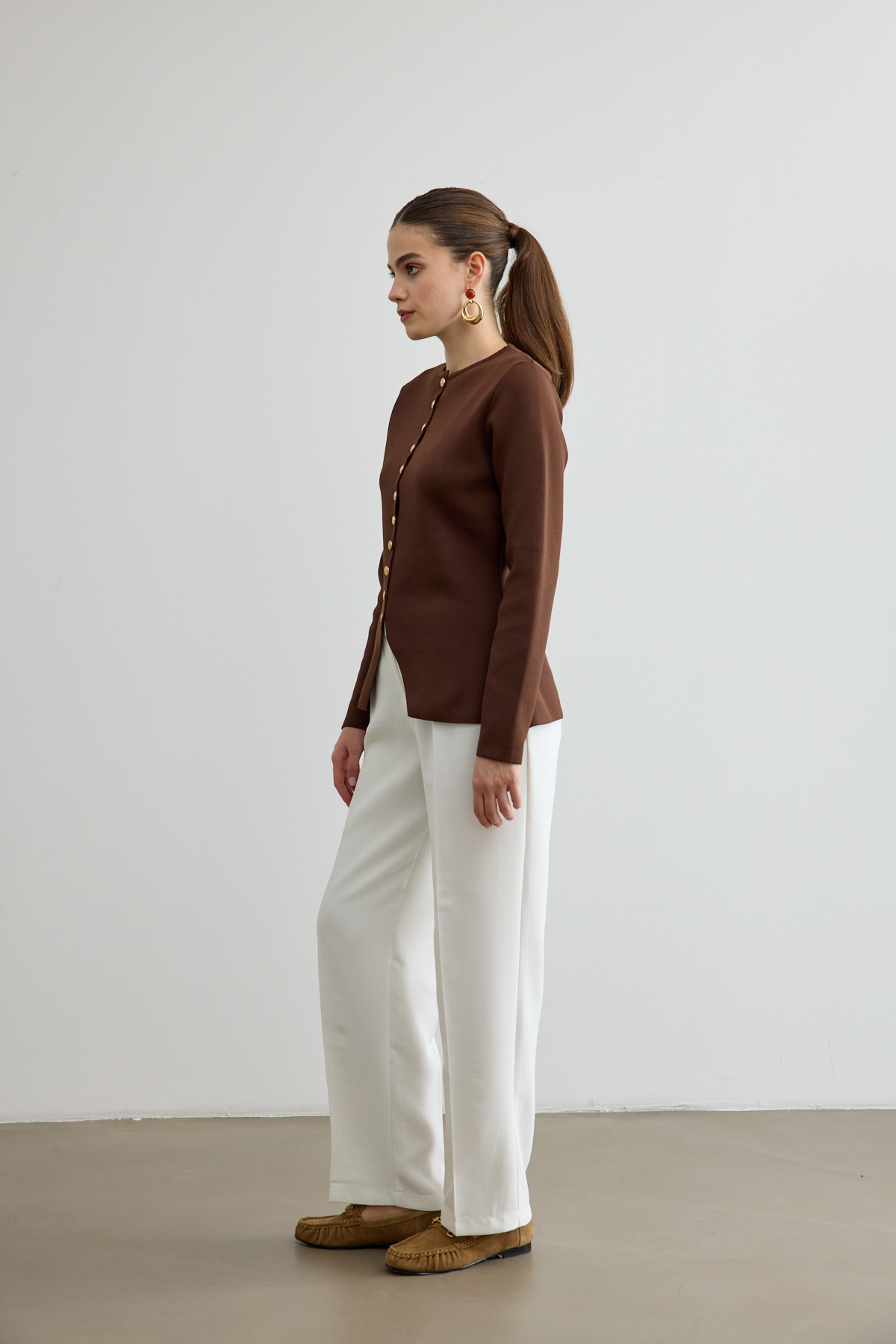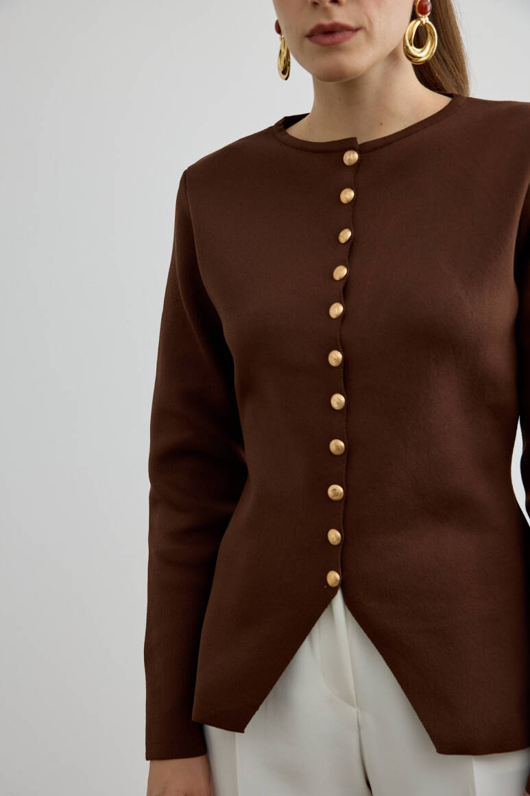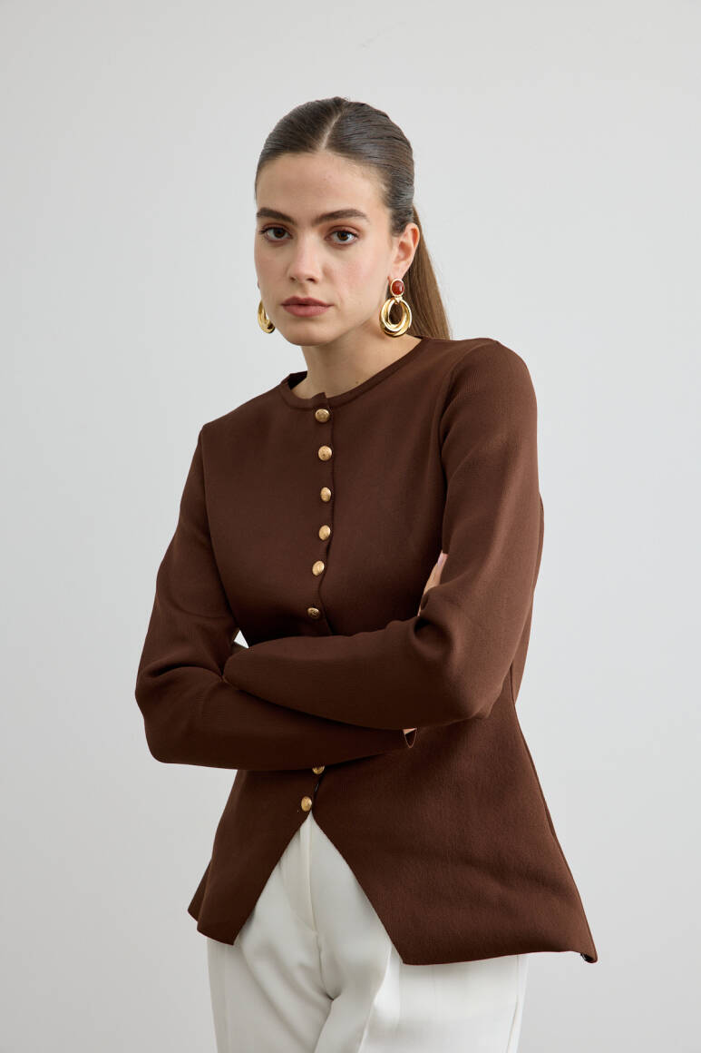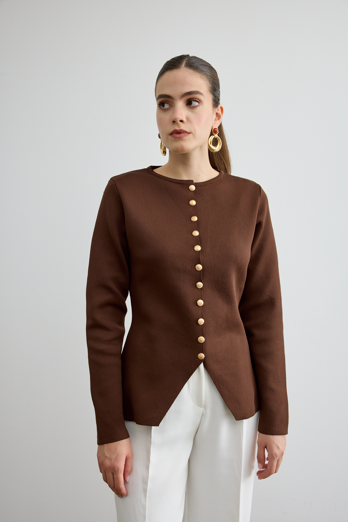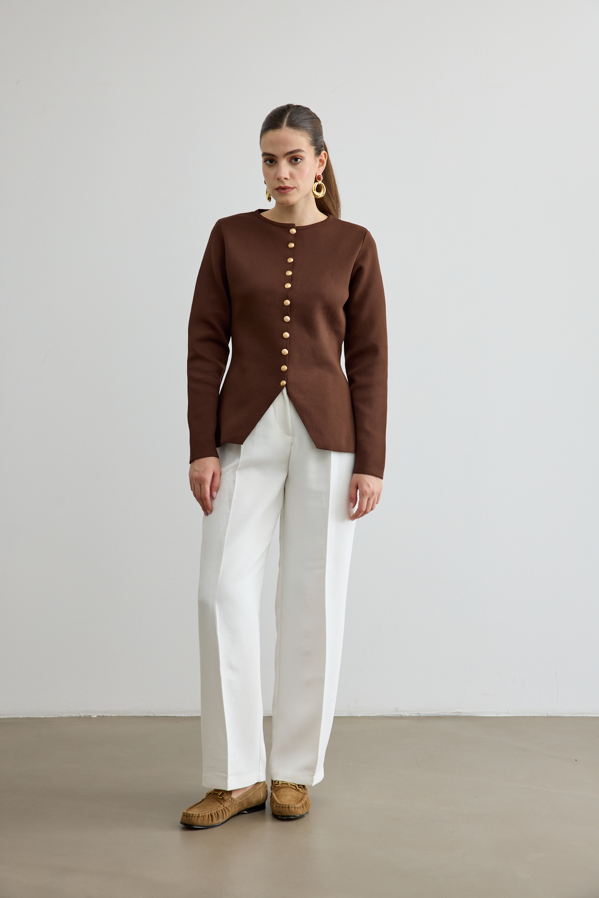 Belden oturtmalı kesimiyle feminen bir siluet sunan bu hırka, gold düğme detaylarıyla modern ve sofistike bir ışıltı katıyor. Yumuşak dokusu ve zarif duruşuyla gündelik kombinlere şıklık kazandırıyor.