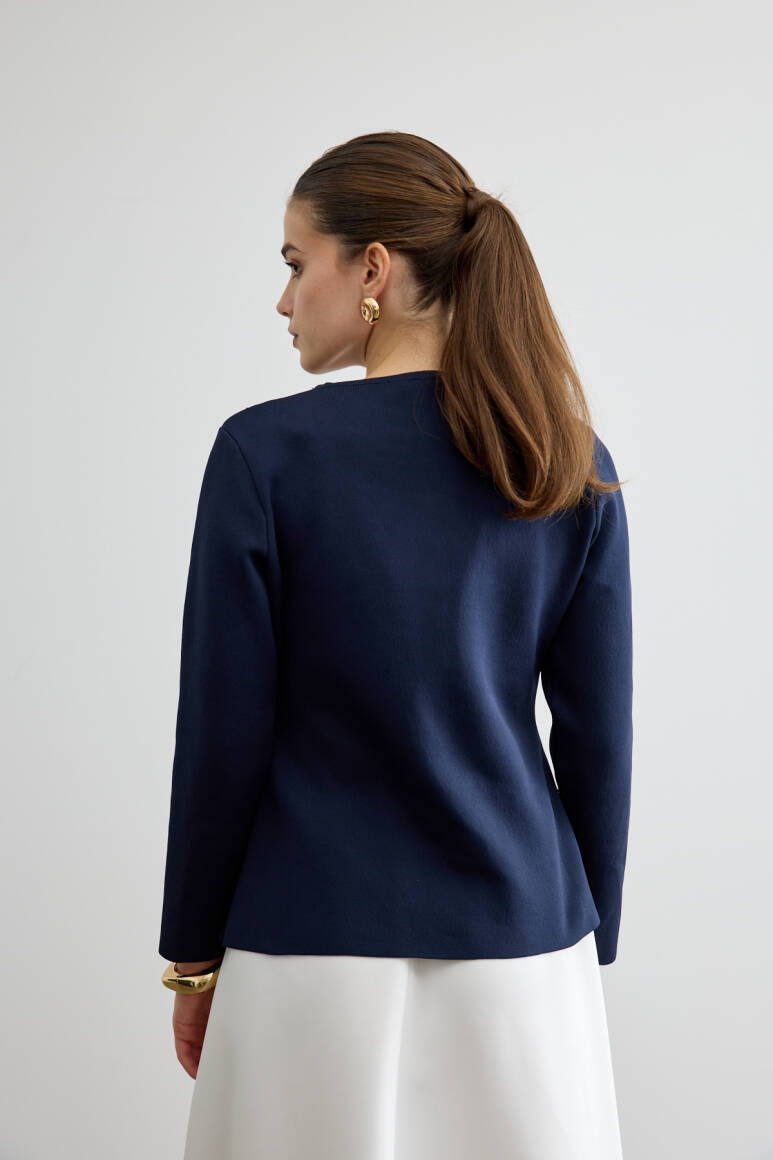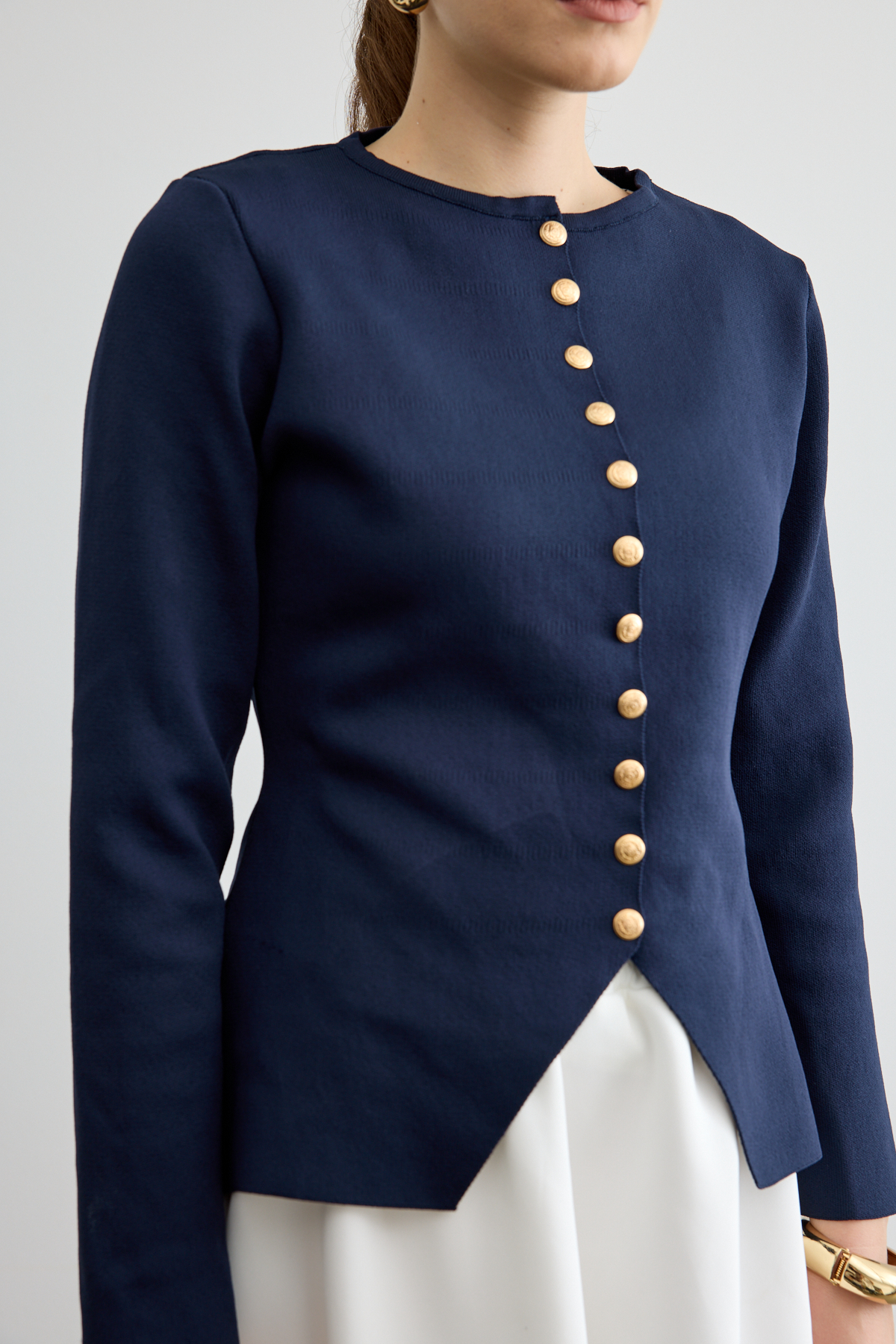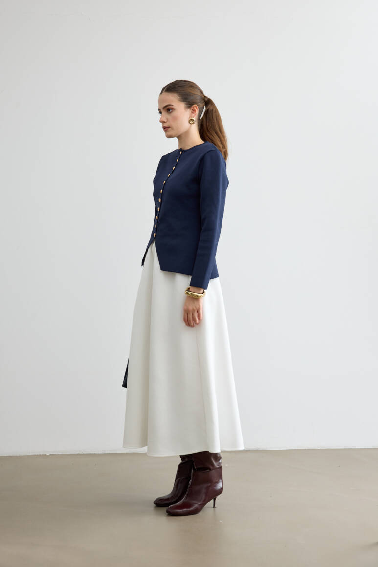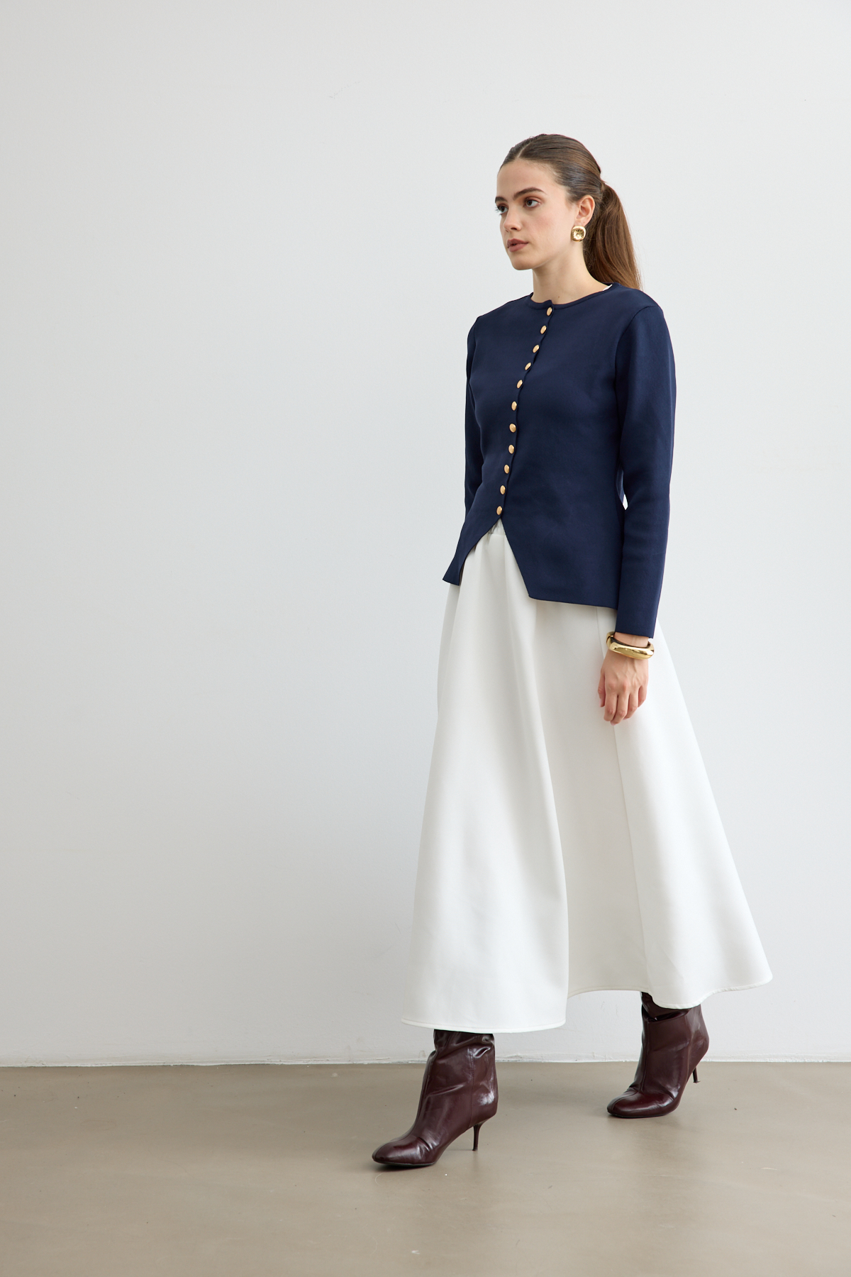 Belden oturtmalı kesimiyle feminen bir siluet sunan bu hırka, gold düğme detaylarıyla modern ve sofistike bir ışıltı katıyor. Yumuşak dokusu ve zarif duruşuyla gündelik kombinlere şıklık kazandırıyor.