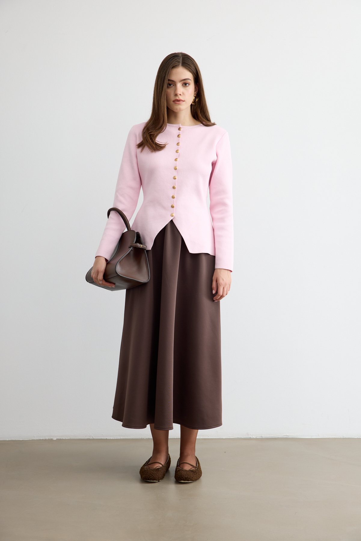 Belden oturtmalı kesimiyle feminen bir siluet sunan bu hırka, gold düğme detaylarıyla modern ve sofistike bir ışıltı katıyor. Yumuşak dokusu ve zarif duruşuyla gündelik kombinlere şıklık kazandırıyor.