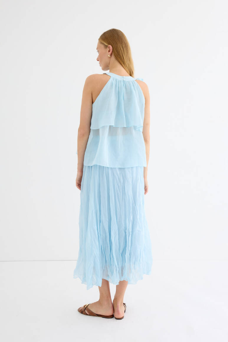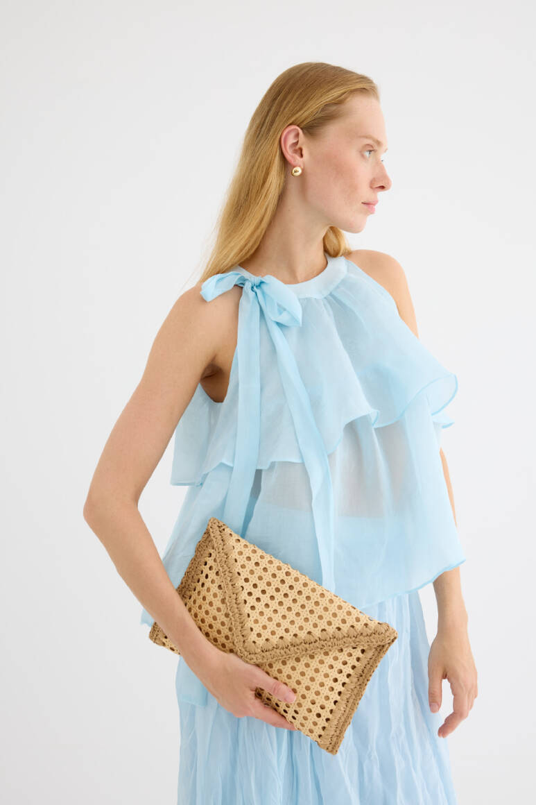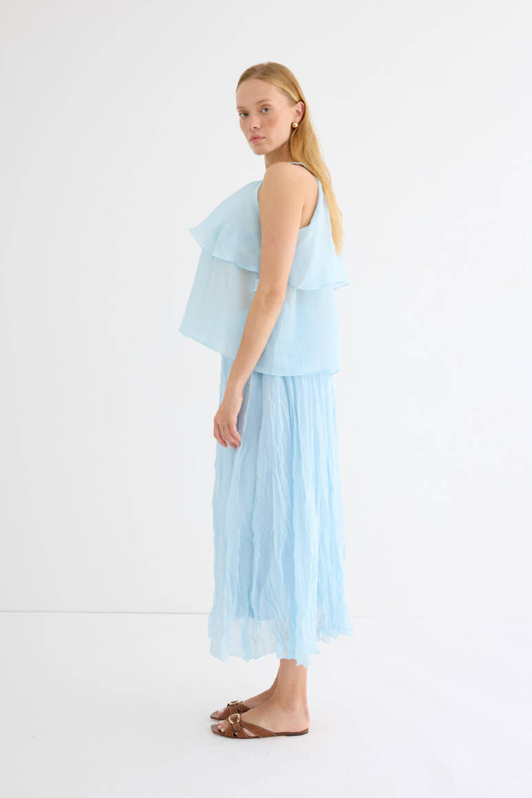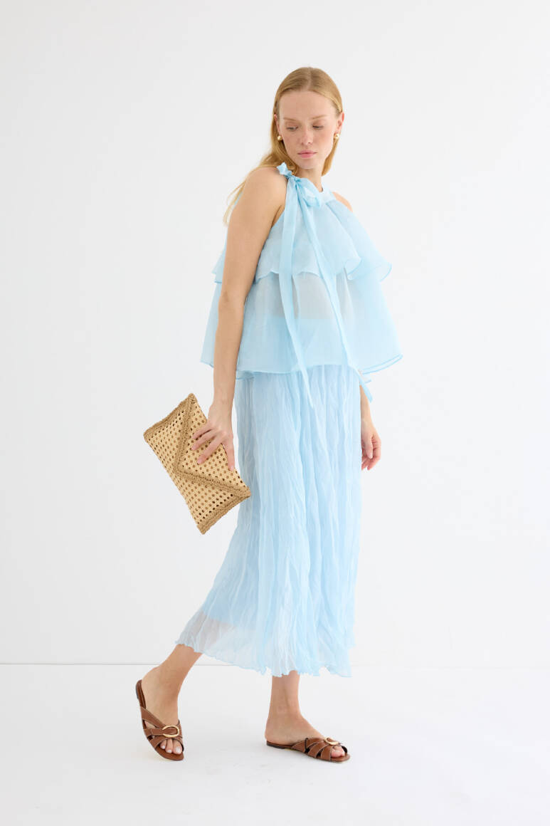 Zarif ve feminen bir görünüm sunan hafif yapılı şifon bluz. Kat kat fırfır detaylarıyla hareket kazandırılmıştır. Omuzdan bağlamalı tasarımıyla romantik bir stil yaratır. Günlük şıklıkta ya da özel anlarda rahatlıkla tercih edilebilir. Astarsızdır.