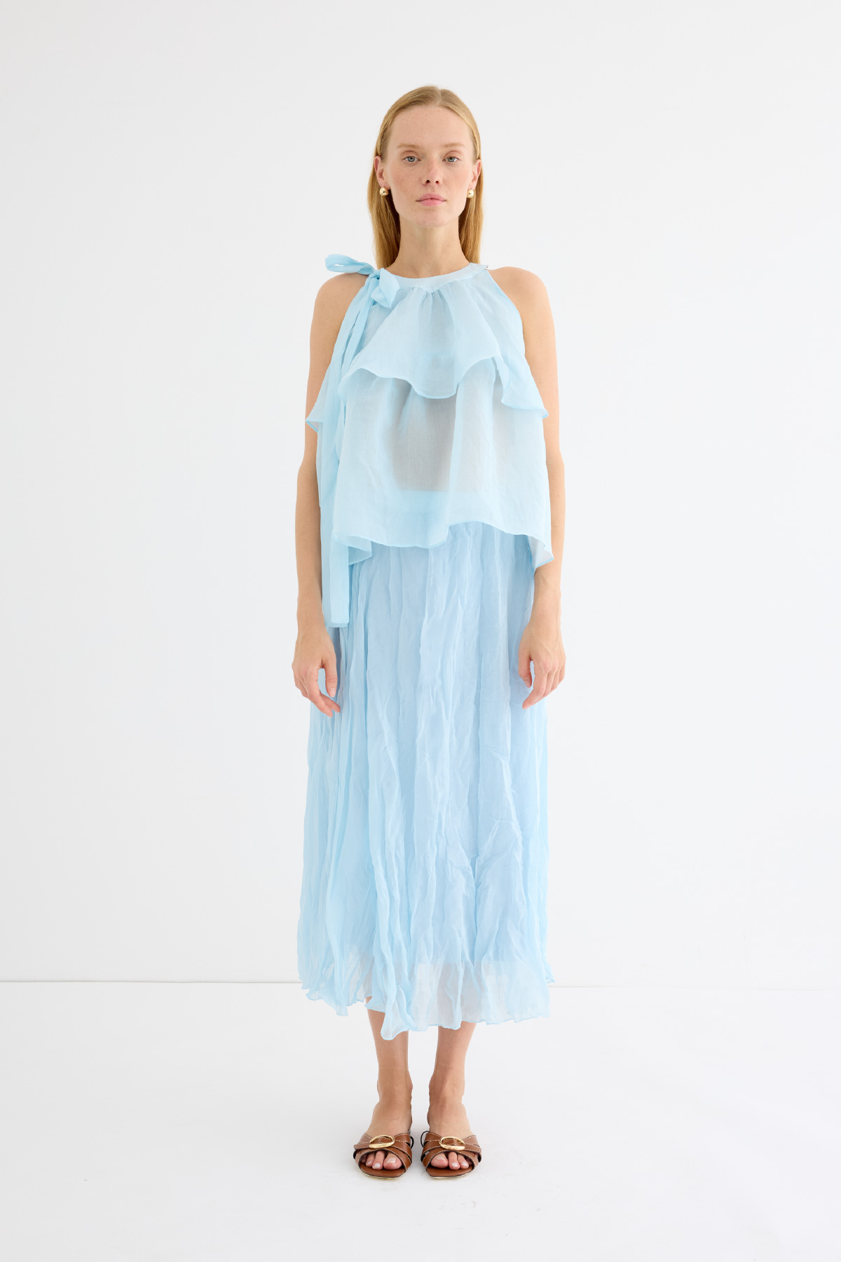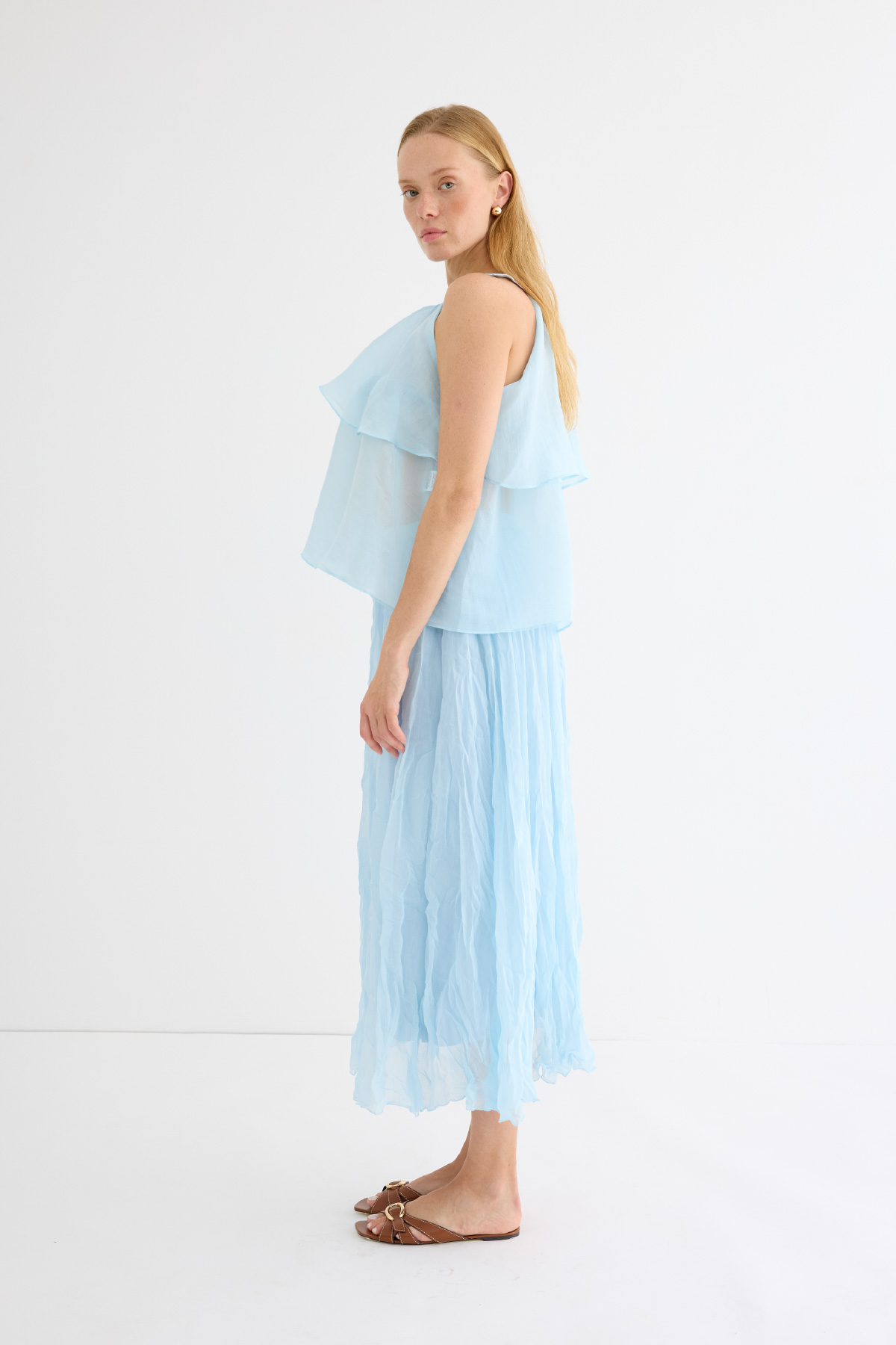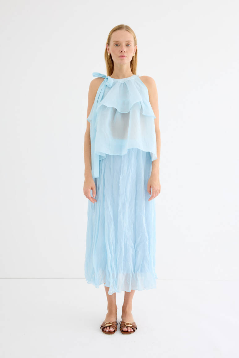 Zarif ve feminen bir görünüm sunan hafif yapılı şifon bluz. Kat kat fırfır detaylarıyla hareket kazandırılmıştır. Omuzdan bağlamalı tasarımıyla romantik bir stil yaratır. Günlük şıklıkta ya da özel anlarda rahatlıkla tercih edilebilir. Astarsızdır.