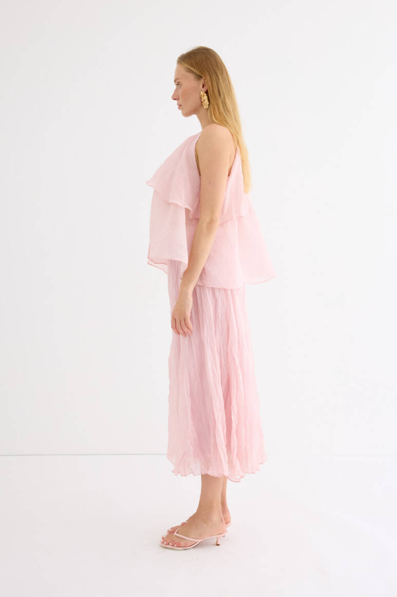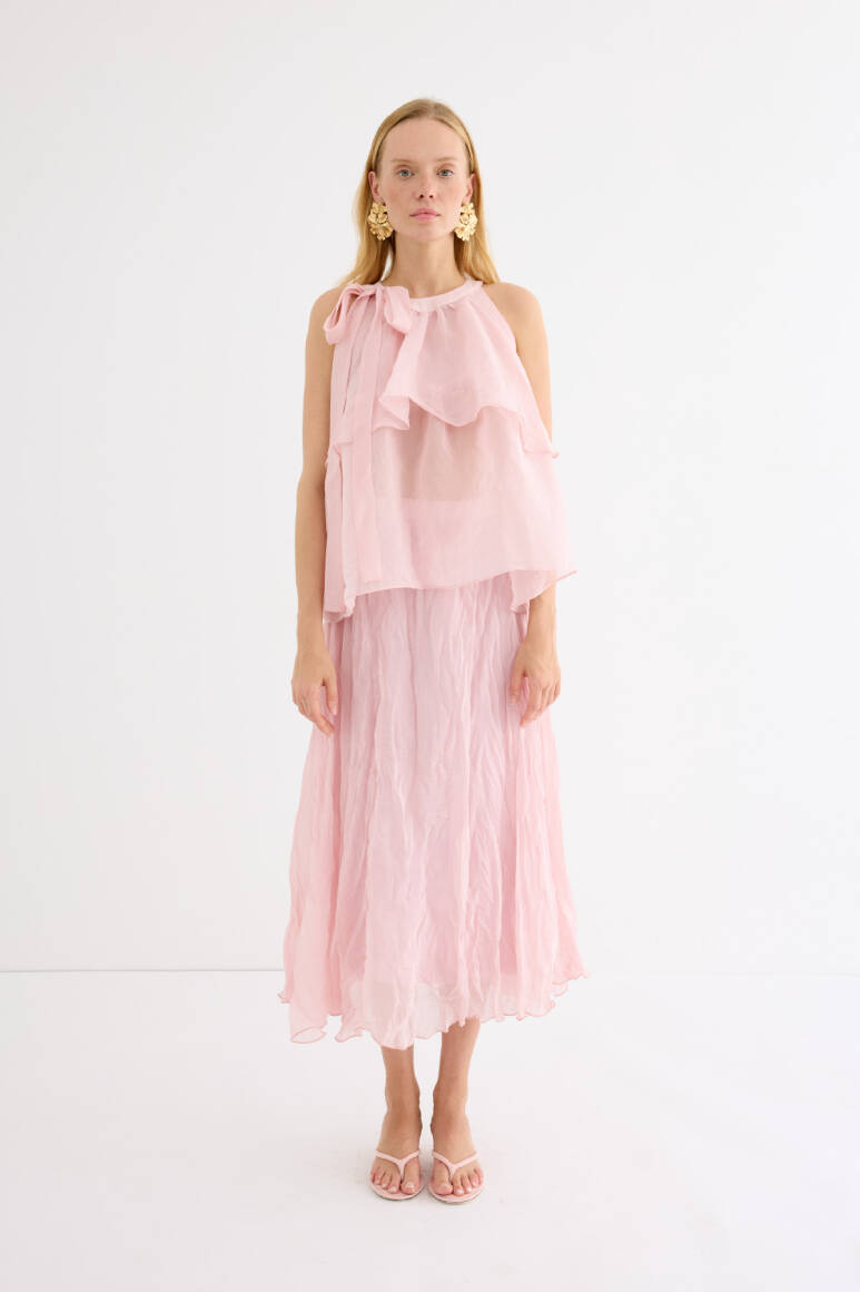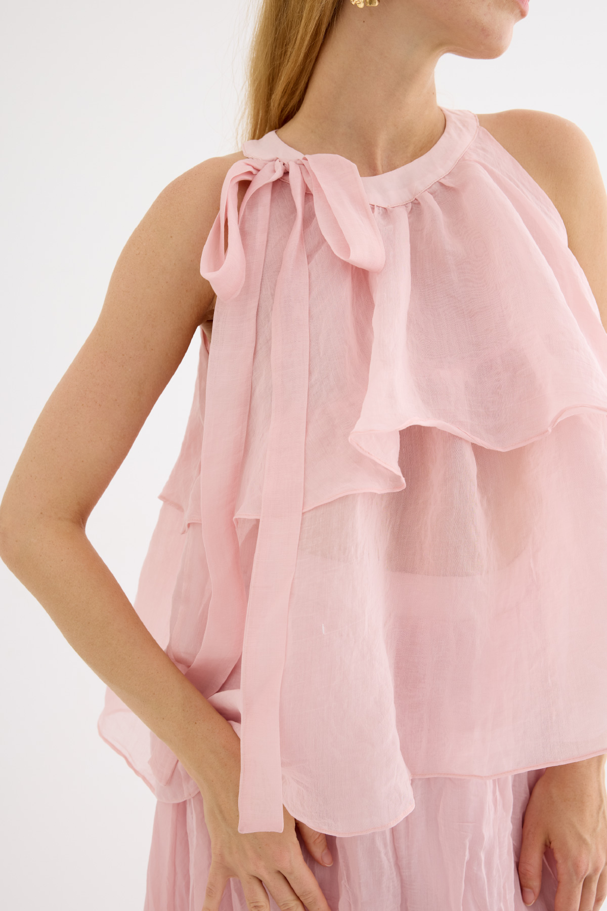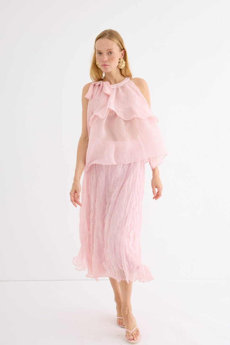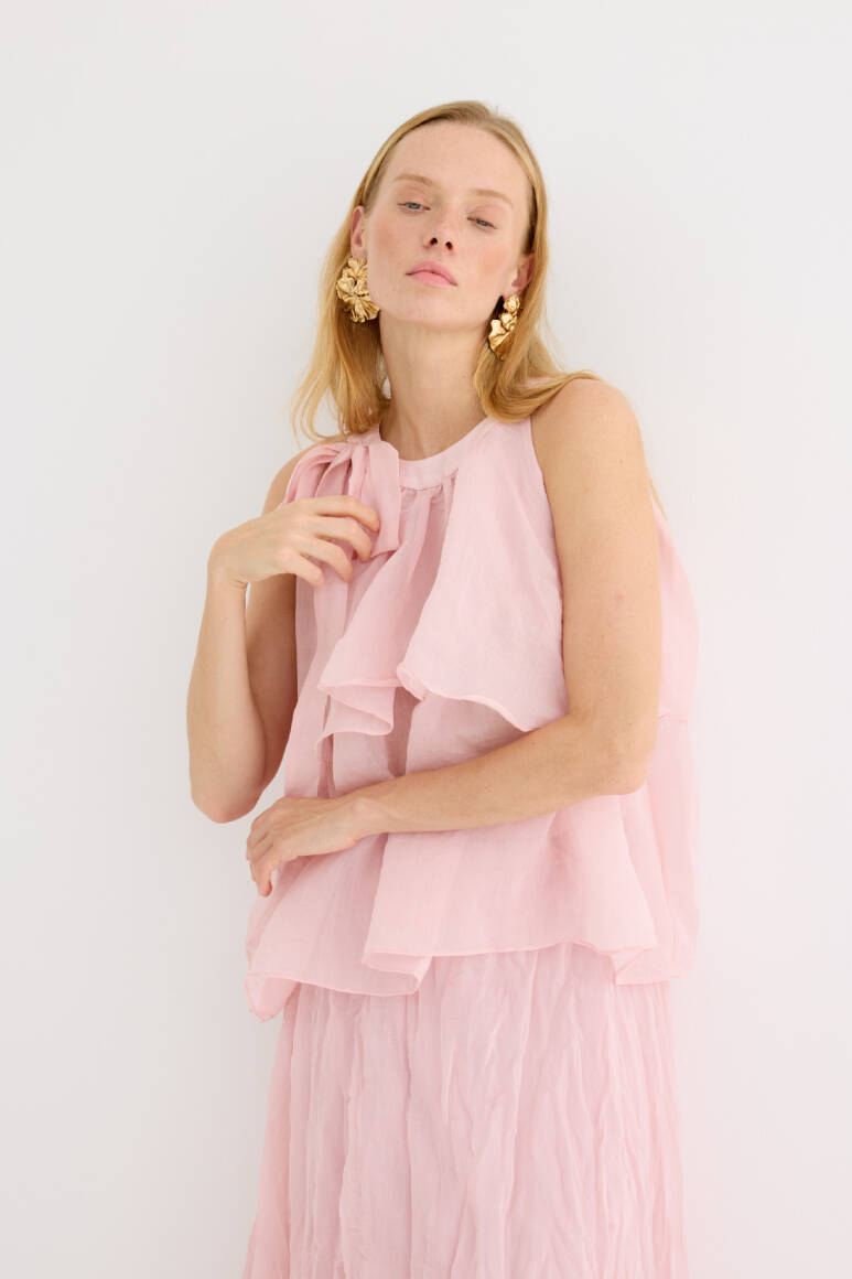 Zarif ve feminen bir görünüm sunan hafif yapılı şifon bluz. Kat kat fırfır detaylarıyla hareket kazandırılmıştır. Omuzdan bağlamalı tasarımıyla romantik bir stil yaratır. Günlük şıklıkta ya da özel anlarda rahatlıkla tercih edilebilir. Astarsızdır.