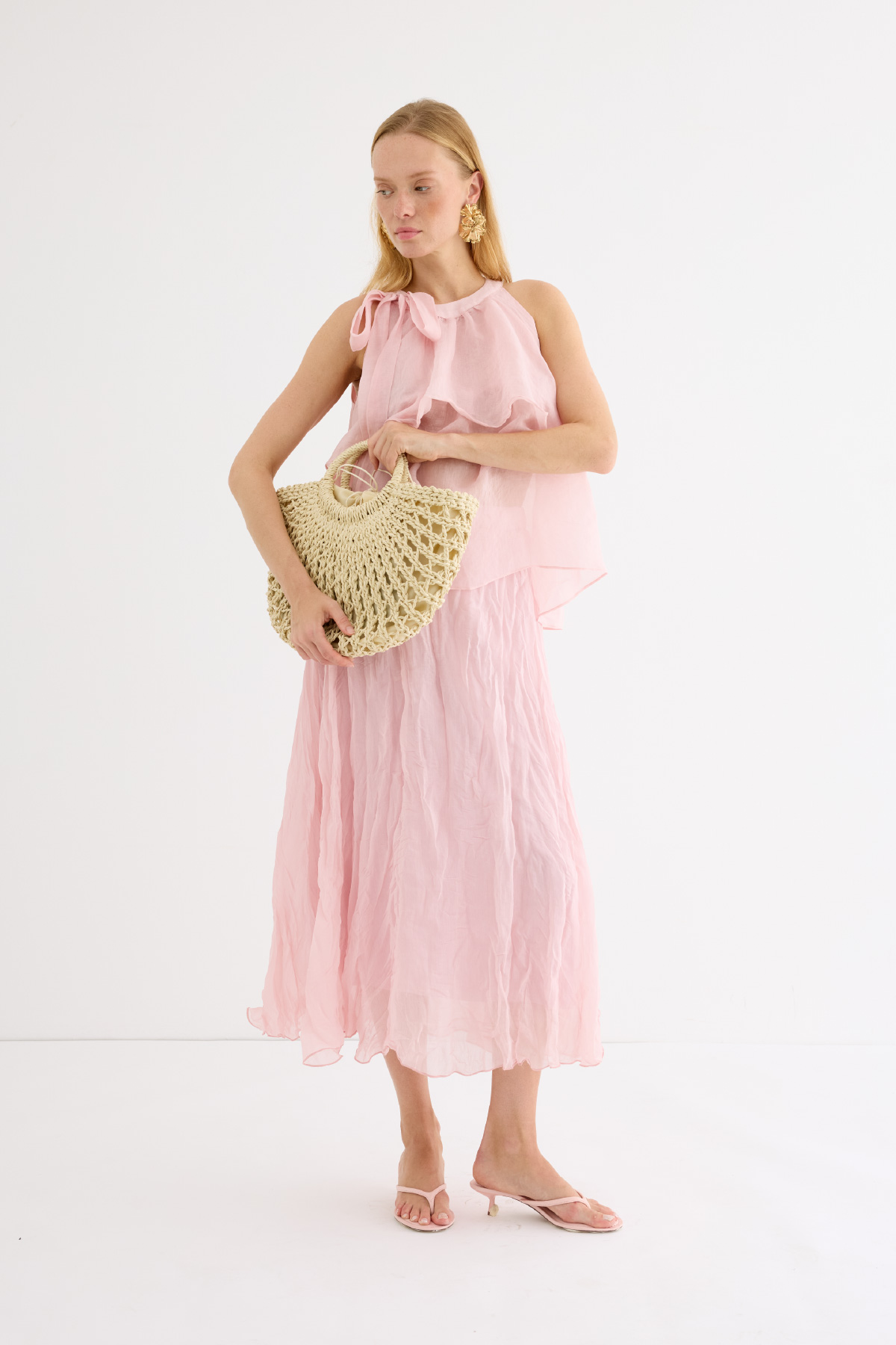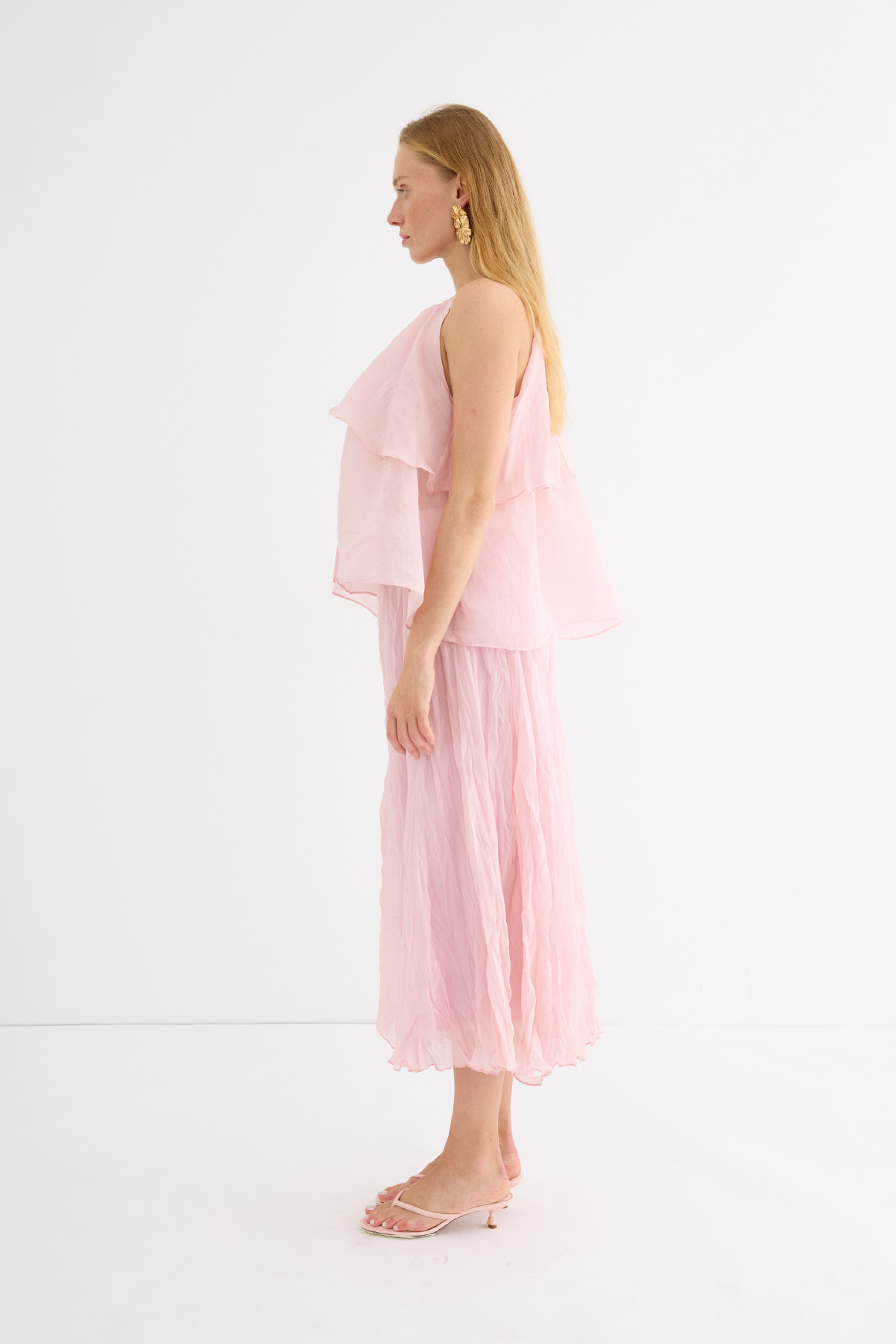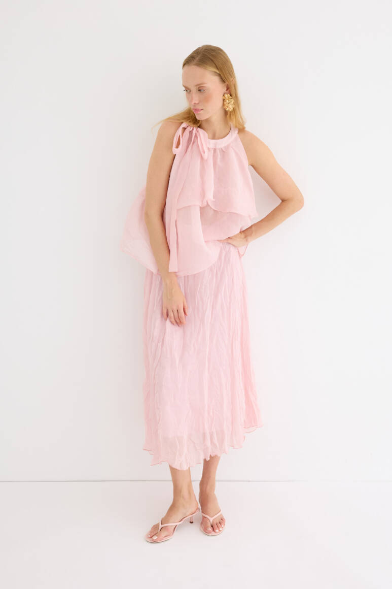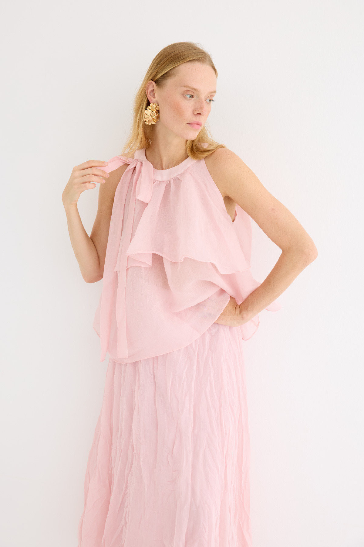 Zarif ve feminen bir görünüm sunan hafif yapılı şifon bluz. Kat kat fırfır detaylarıyla hareket kazandırılmıştır. Omuzdan bağlamalı tasarımıyla romantik bir stil yaratır. Günlük şıklıkta ya da özel anlarda rahatlıkla tercih edilebilir. Astarsızdır.