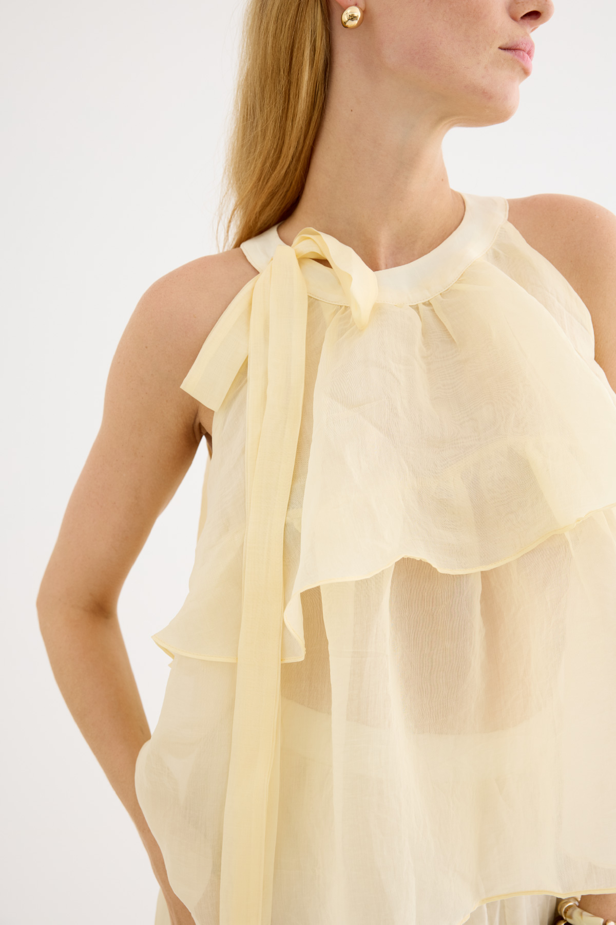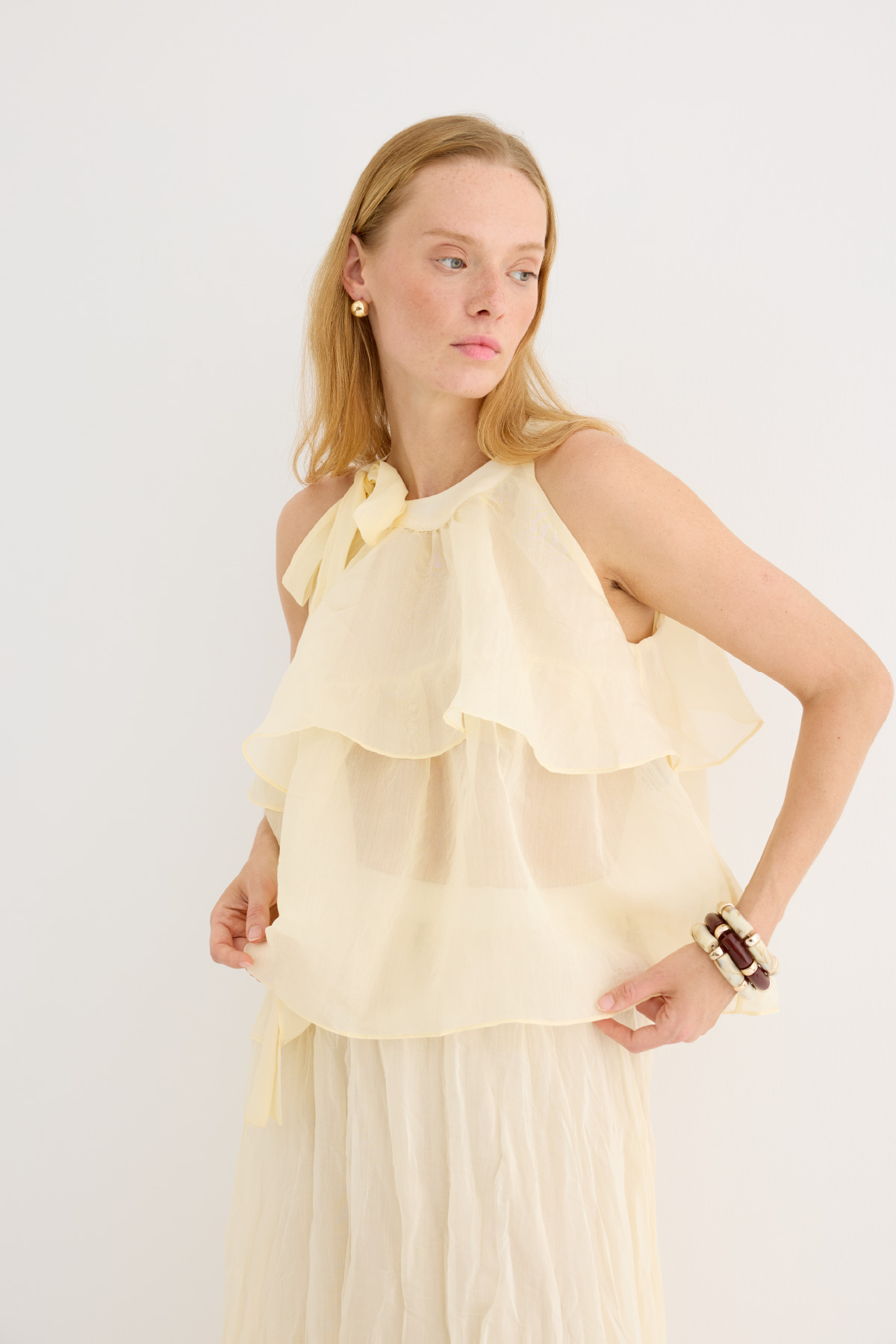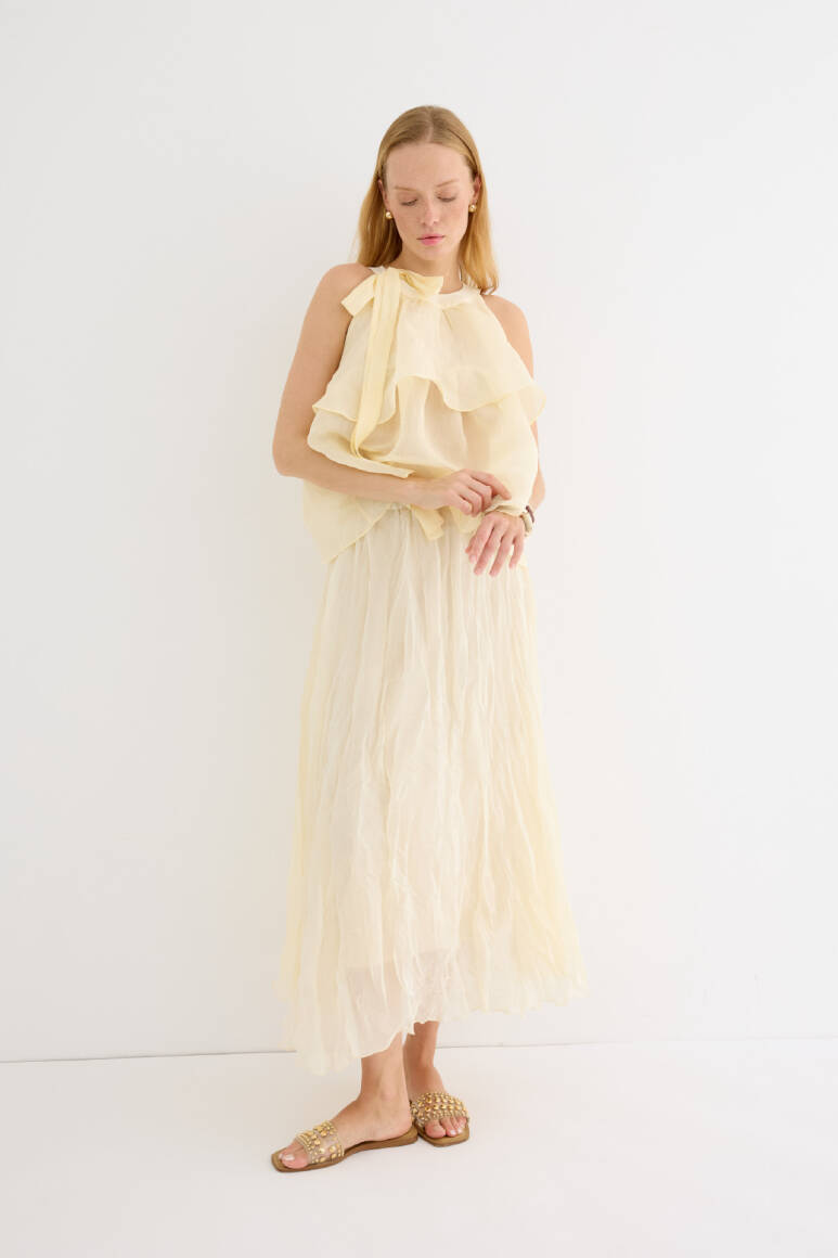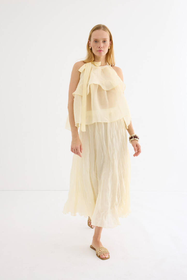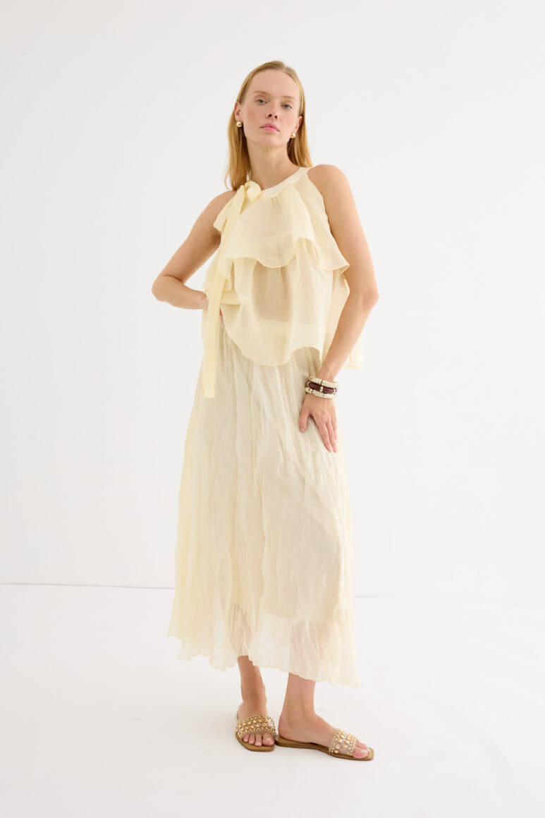 Zarif ve feminen bir görünüm sunan hafif yapılı şifon bluz. Kat kat fırfır detaylarıyla hareket kazandırılmıştır. Omuzdan bağlamalı tasarımıyla romantik bir stil yaratır. Günlük şıklıkta ya da özel anlarda rahatlıkla tercih edilebilir. Astarsızdır.