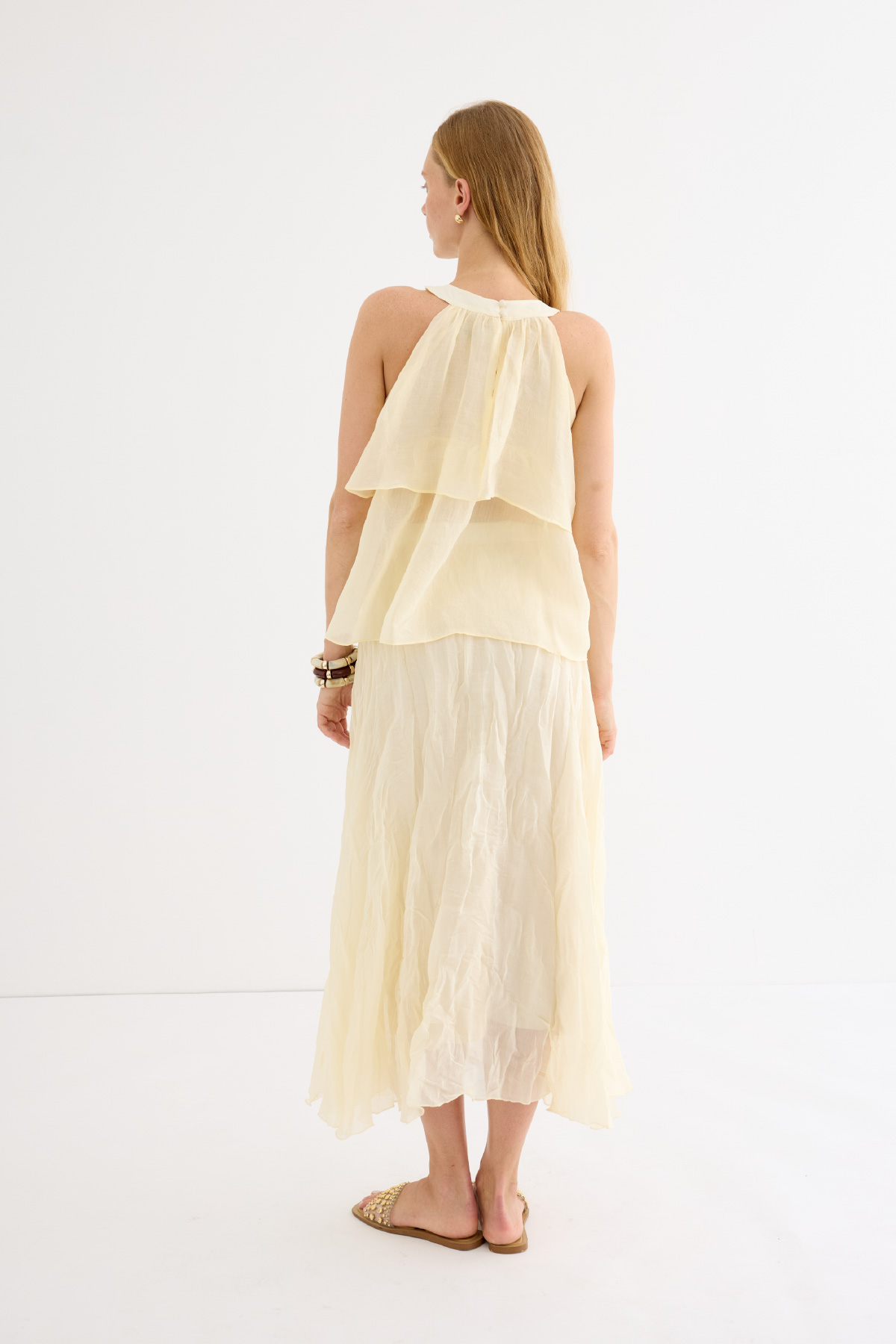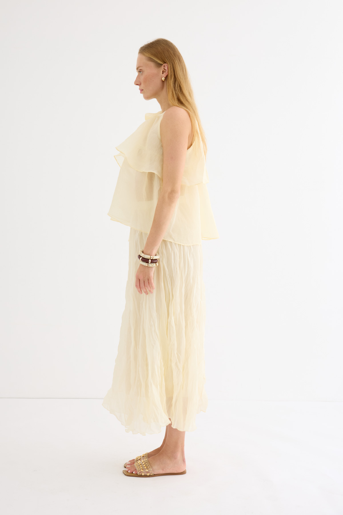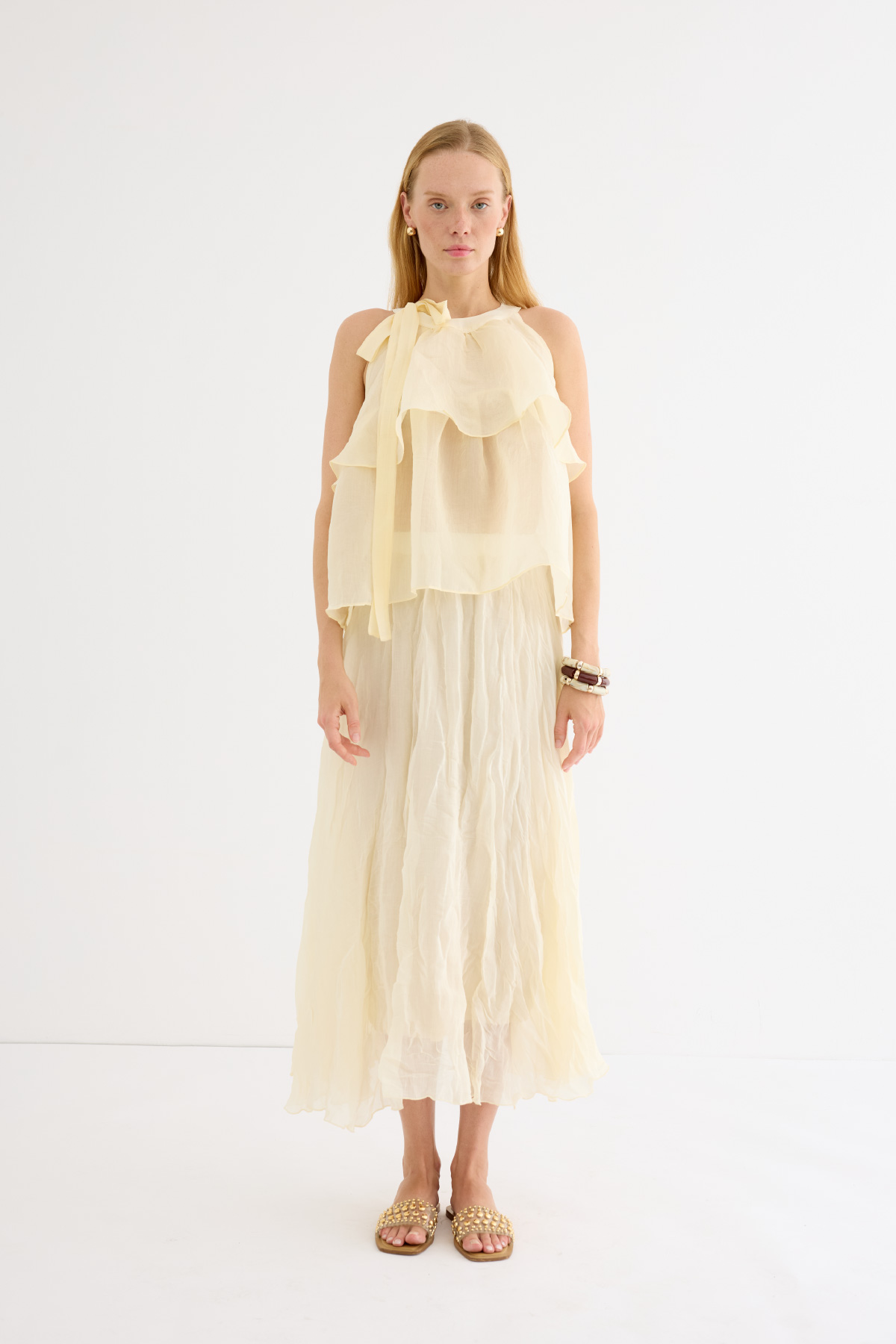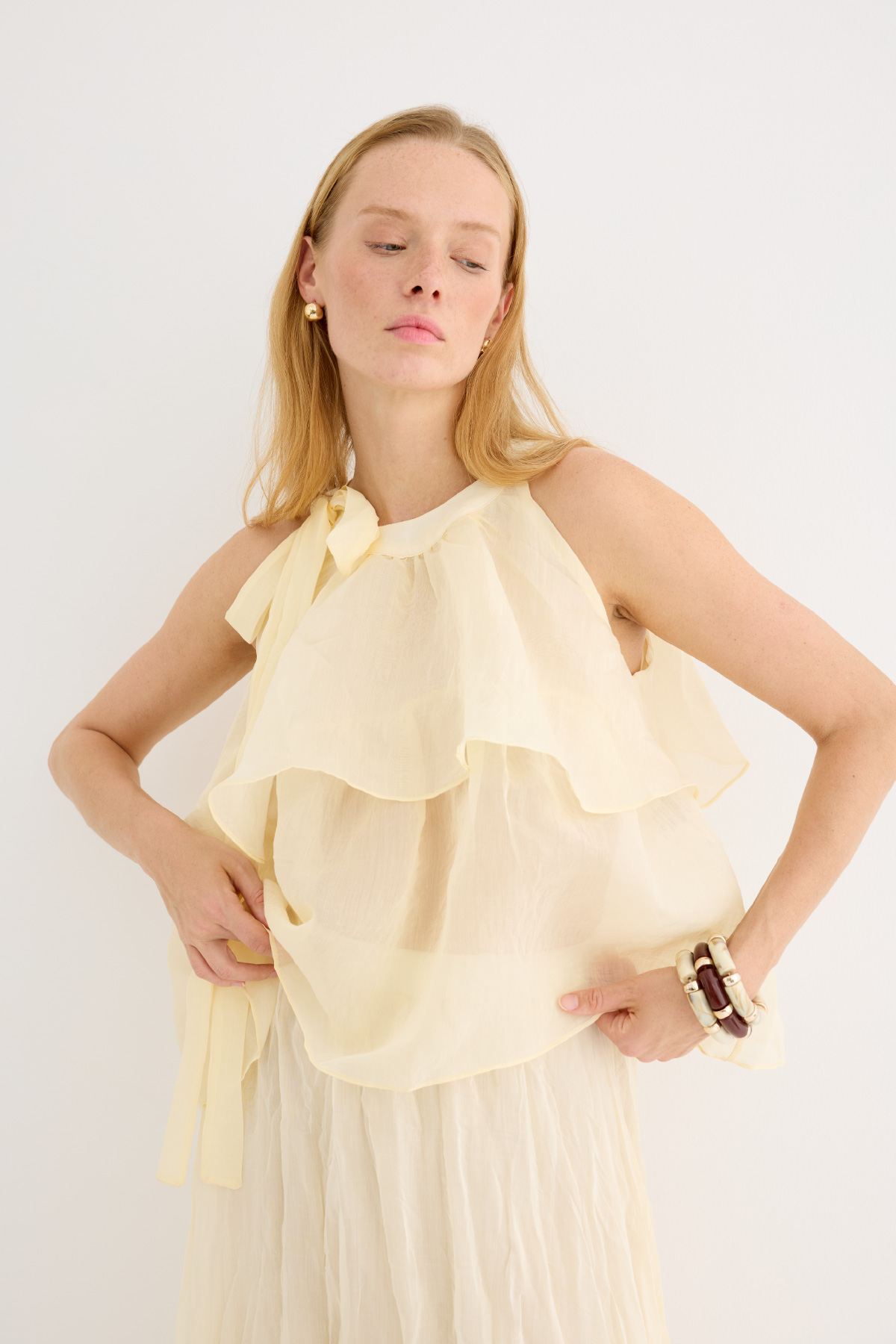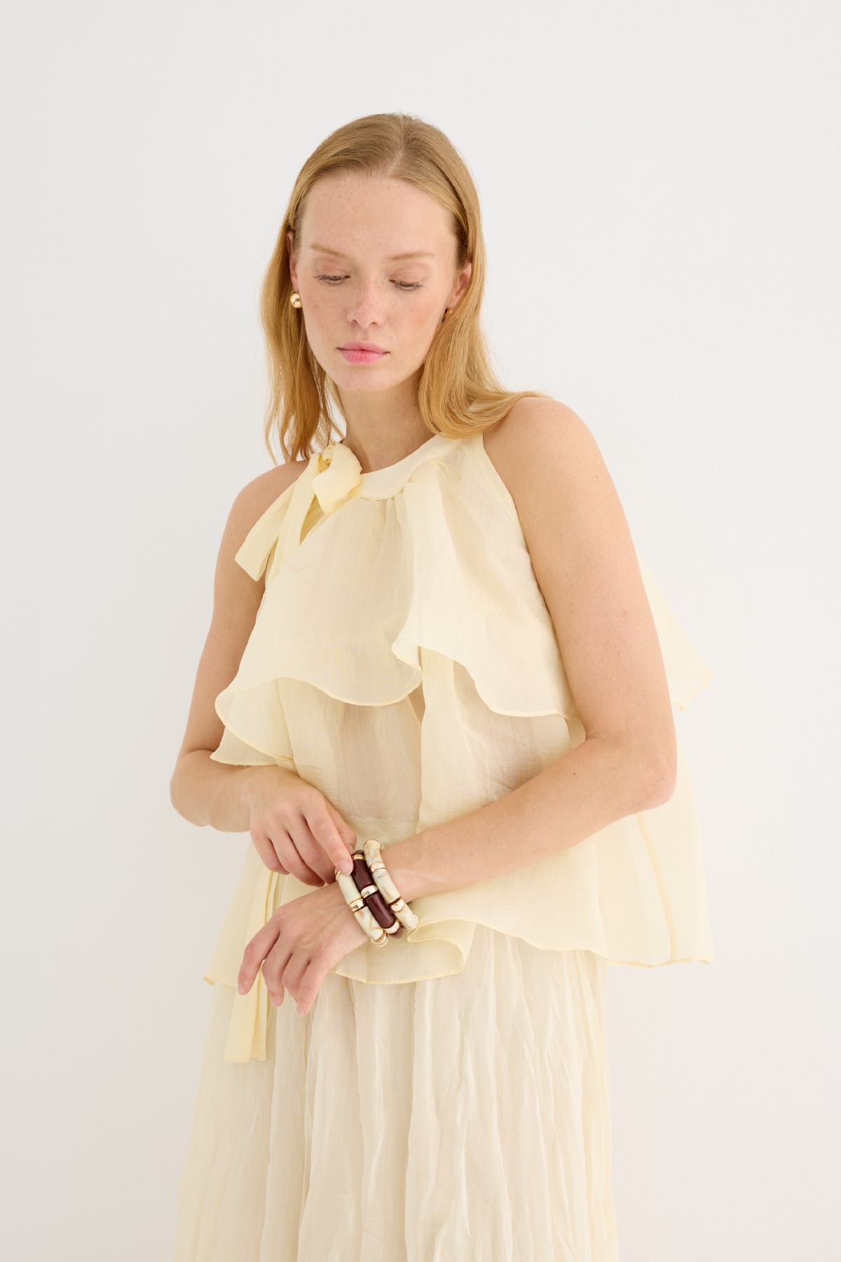 Zarif ve feminen bir görünüm sunan hafif yapılı şifon bluz. Kat kat fırfır detaylarıyla hareket kazandırılmıştır. Omuzdan bağlamalı tasarımıyla romantik bir stil yaratır. Günlük şıklıkta ya da özel anlarda rahatlıkla tercih edilebilir. Astarsızdır.
