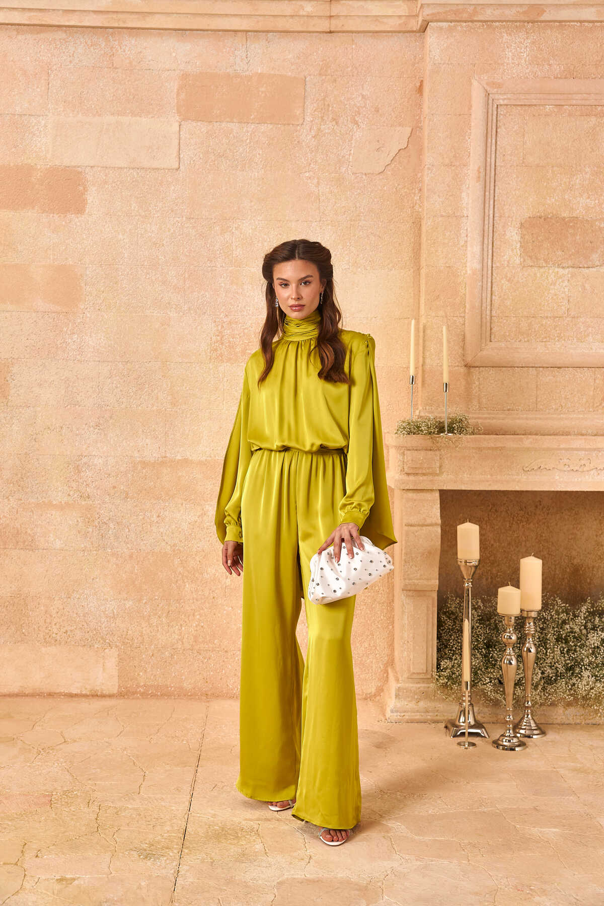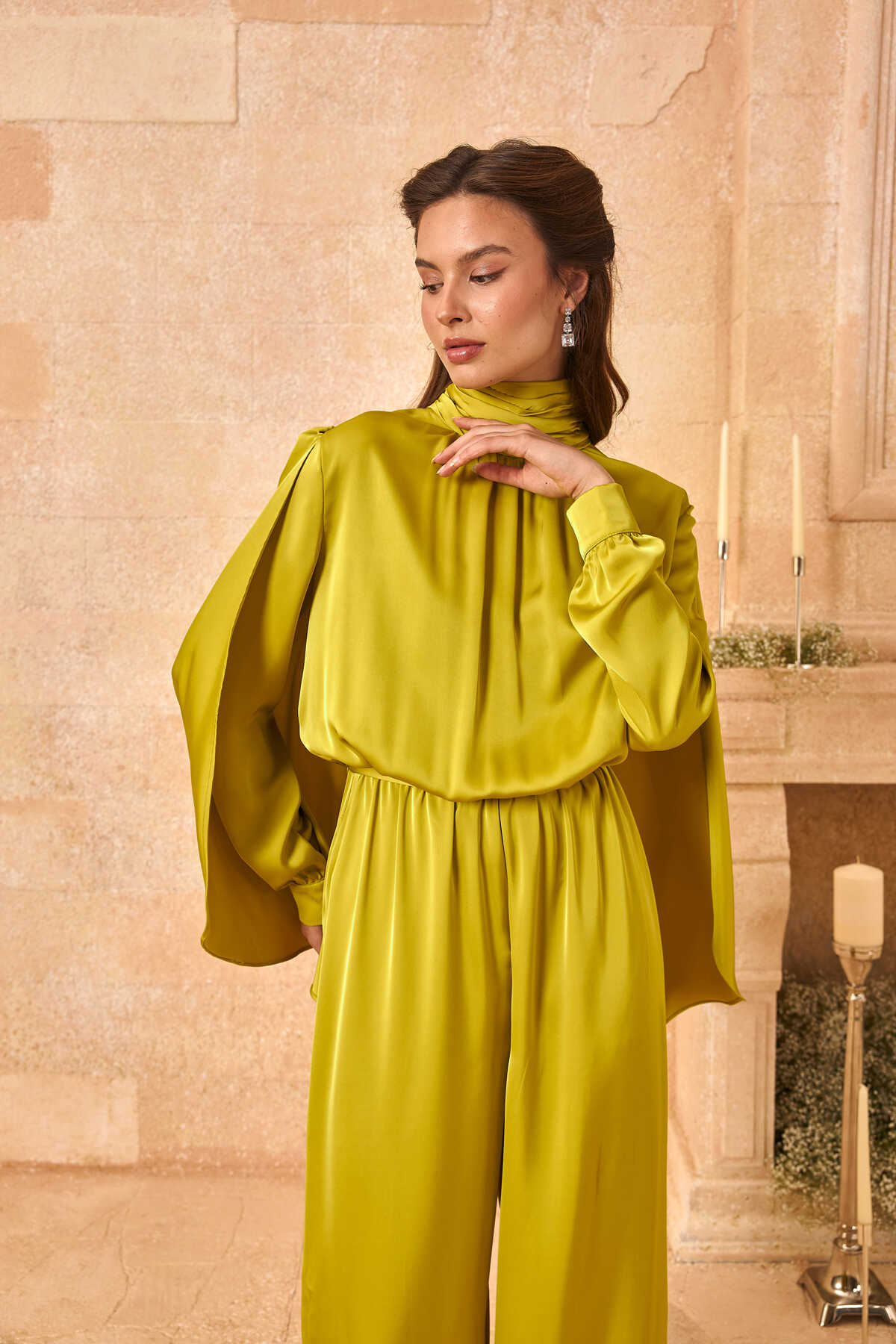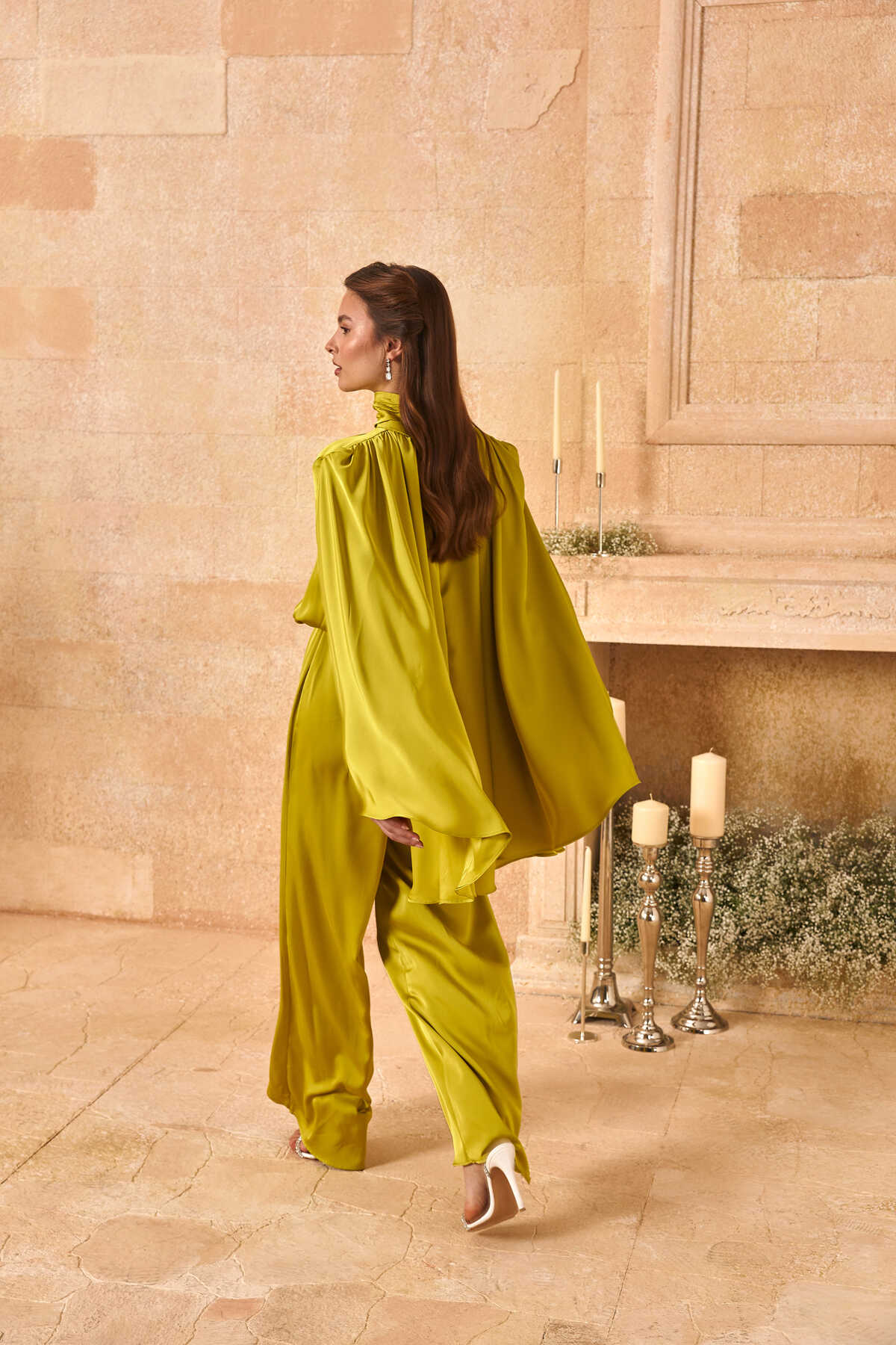 Pelerinli Saten Abiye Tulum Olive Yeşil - 6
