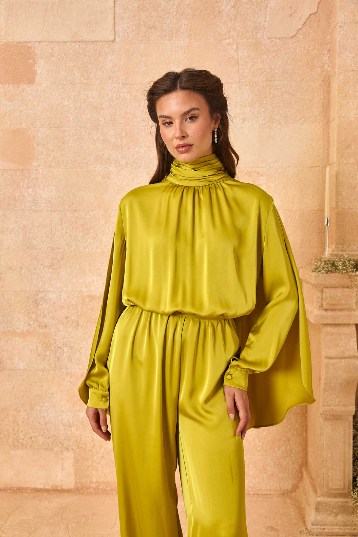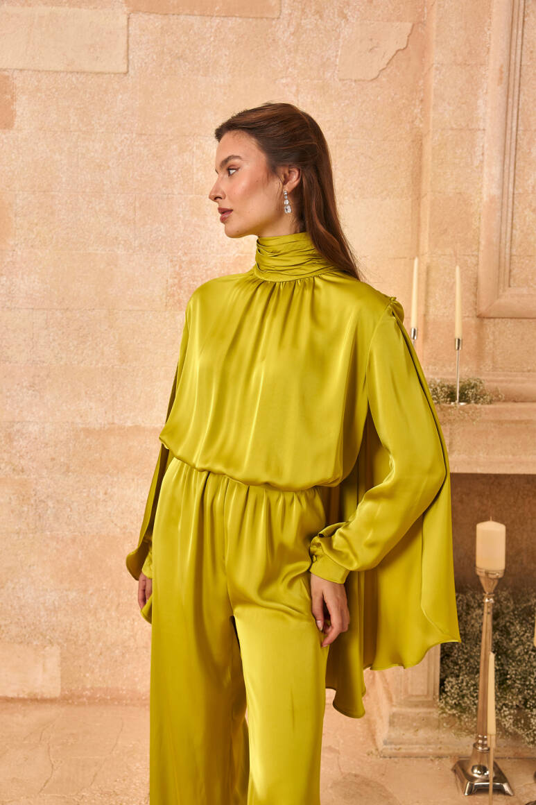 Pelerinli Saten Abiye Tulum Olive Yeşil