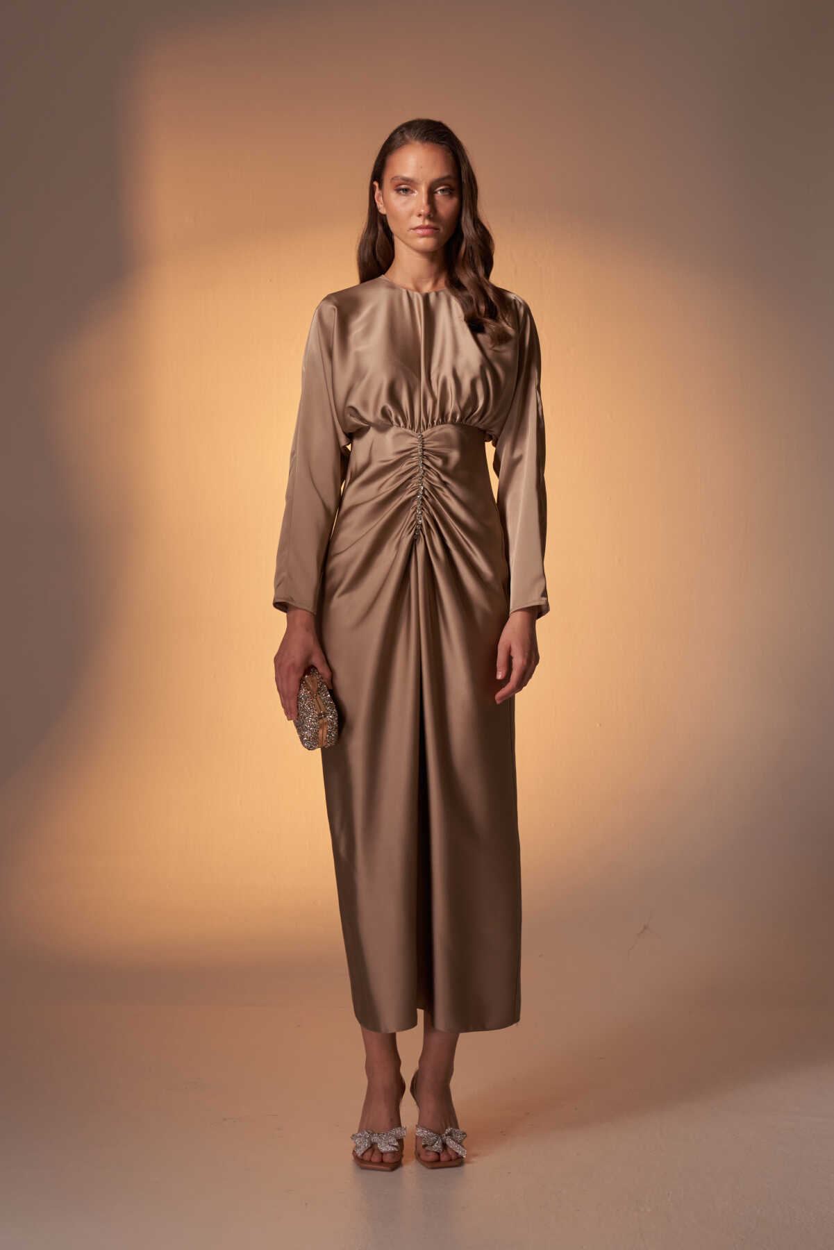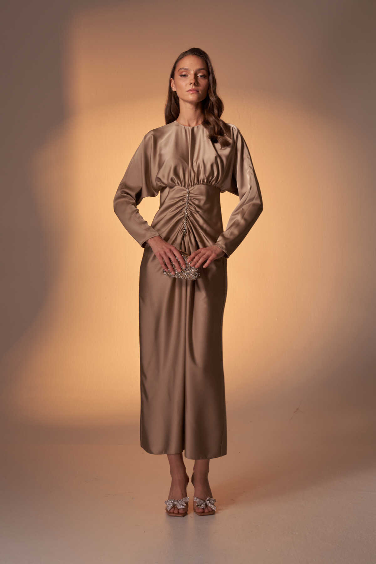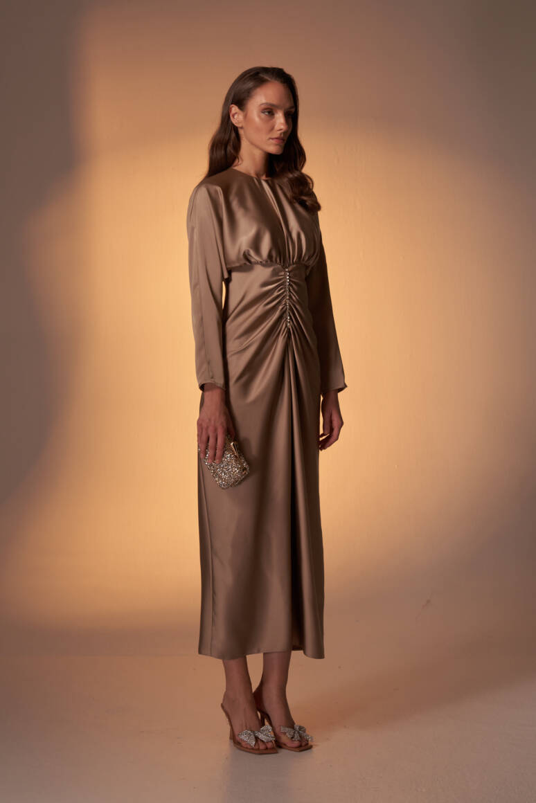 Perla Taşlı Saten Abiye Elbise Vizon - 1