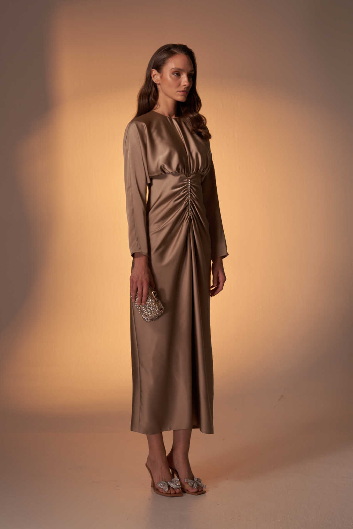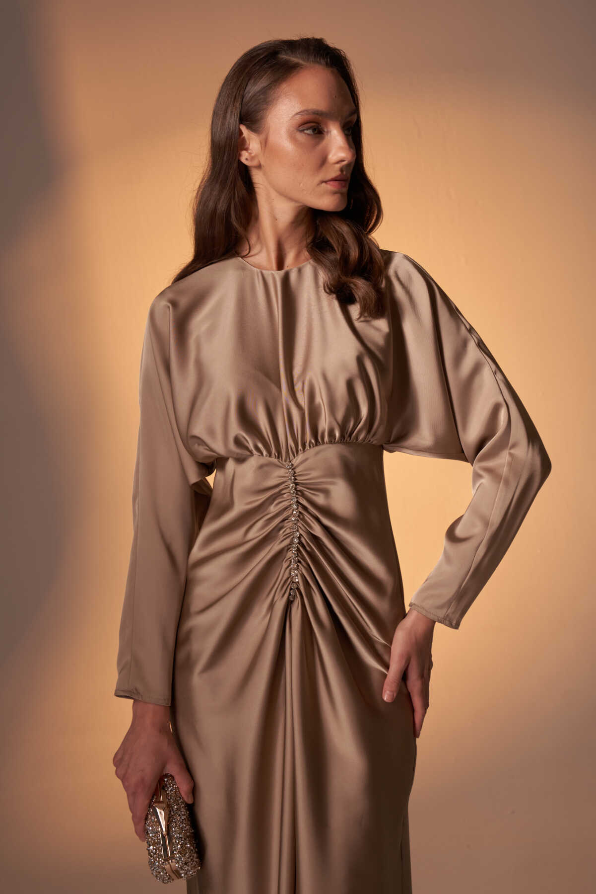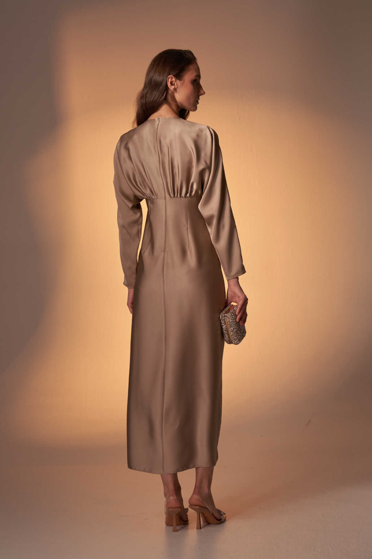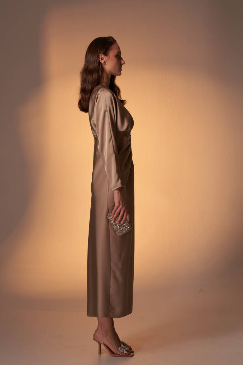 Perla Taşlı Saten Abiye Elbise Vizon - 4