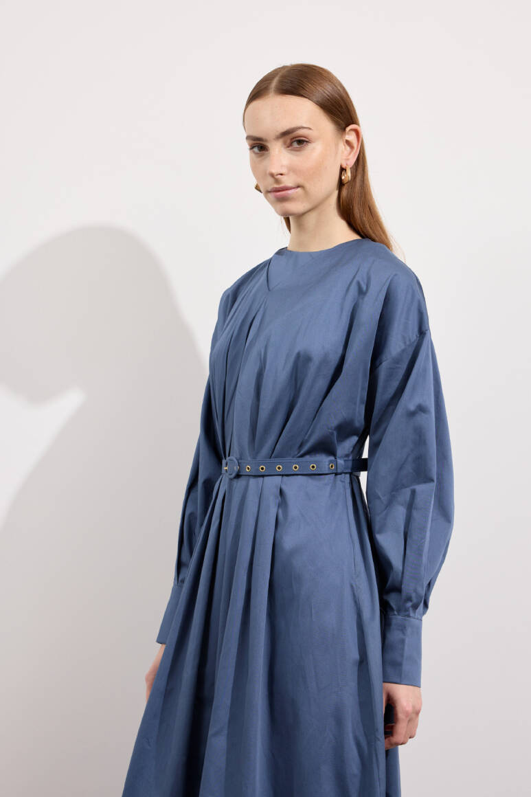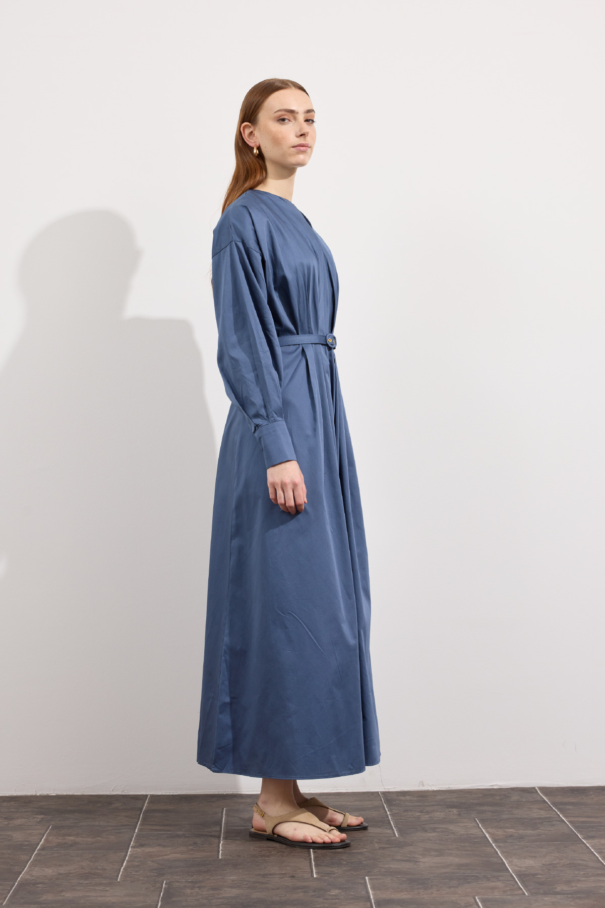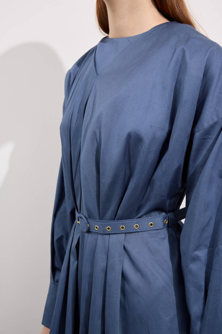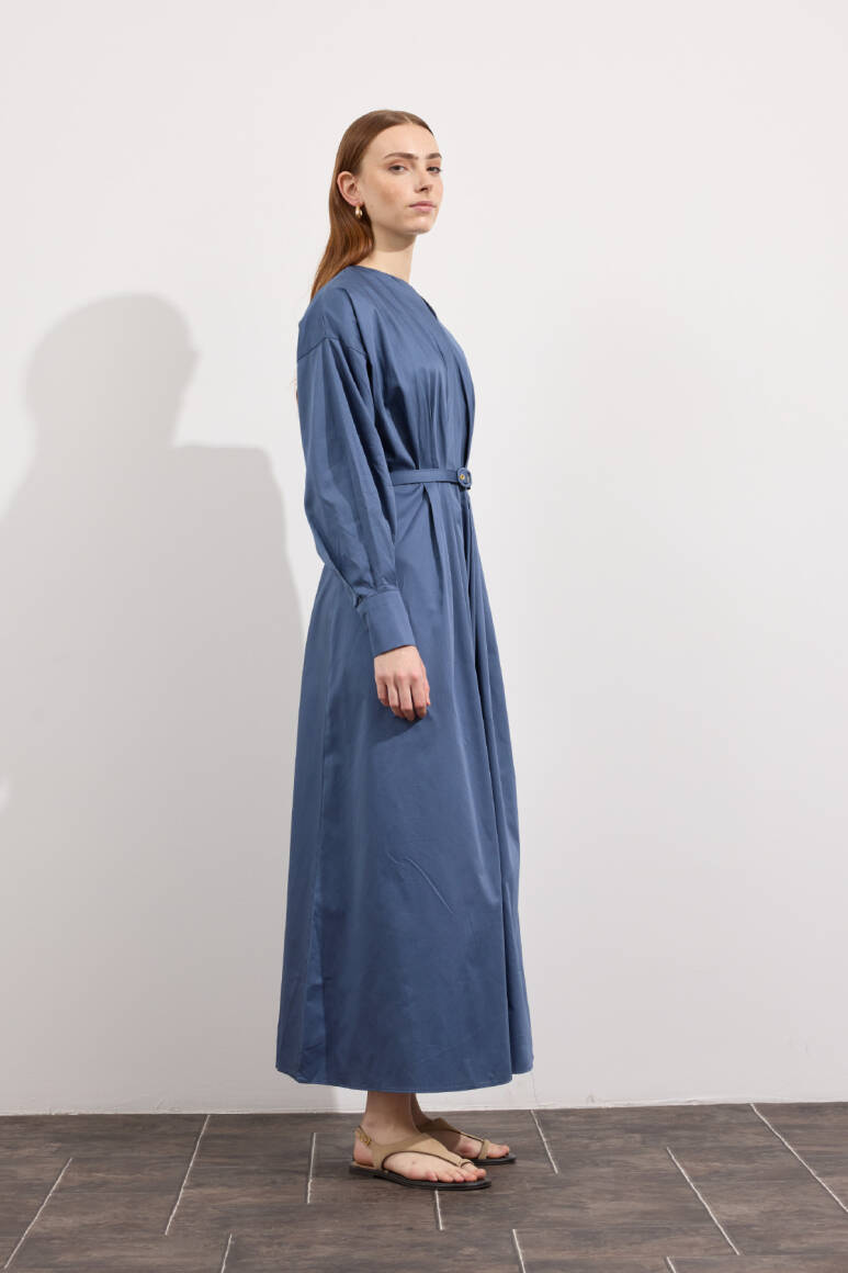 V yakalı, ekstra yaka parçalı, pile formda ön gövde tasarımı, bel kısmı tokalı kaplama kemerle desteklenmiş, uzun kollu ve manşet düğmeli, dökümlü, rahat kesim elbise.