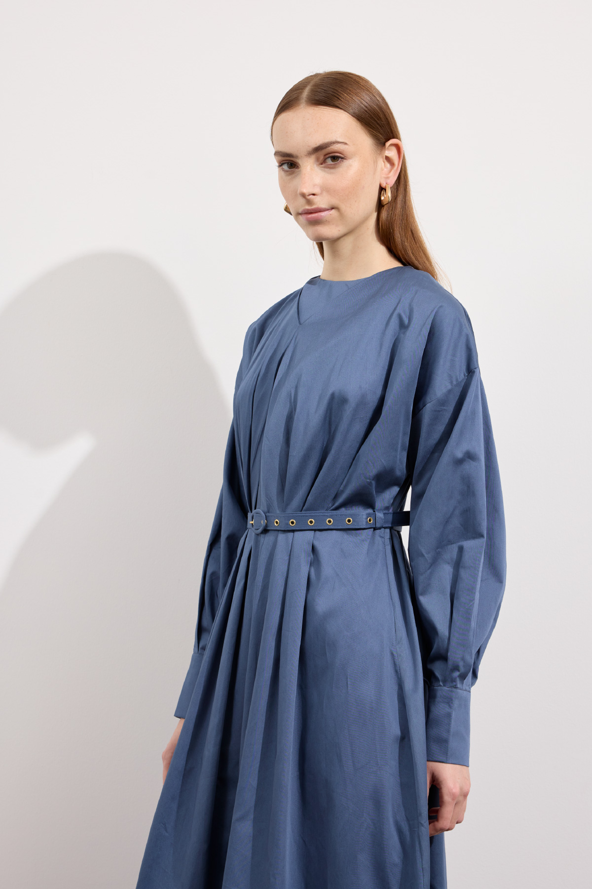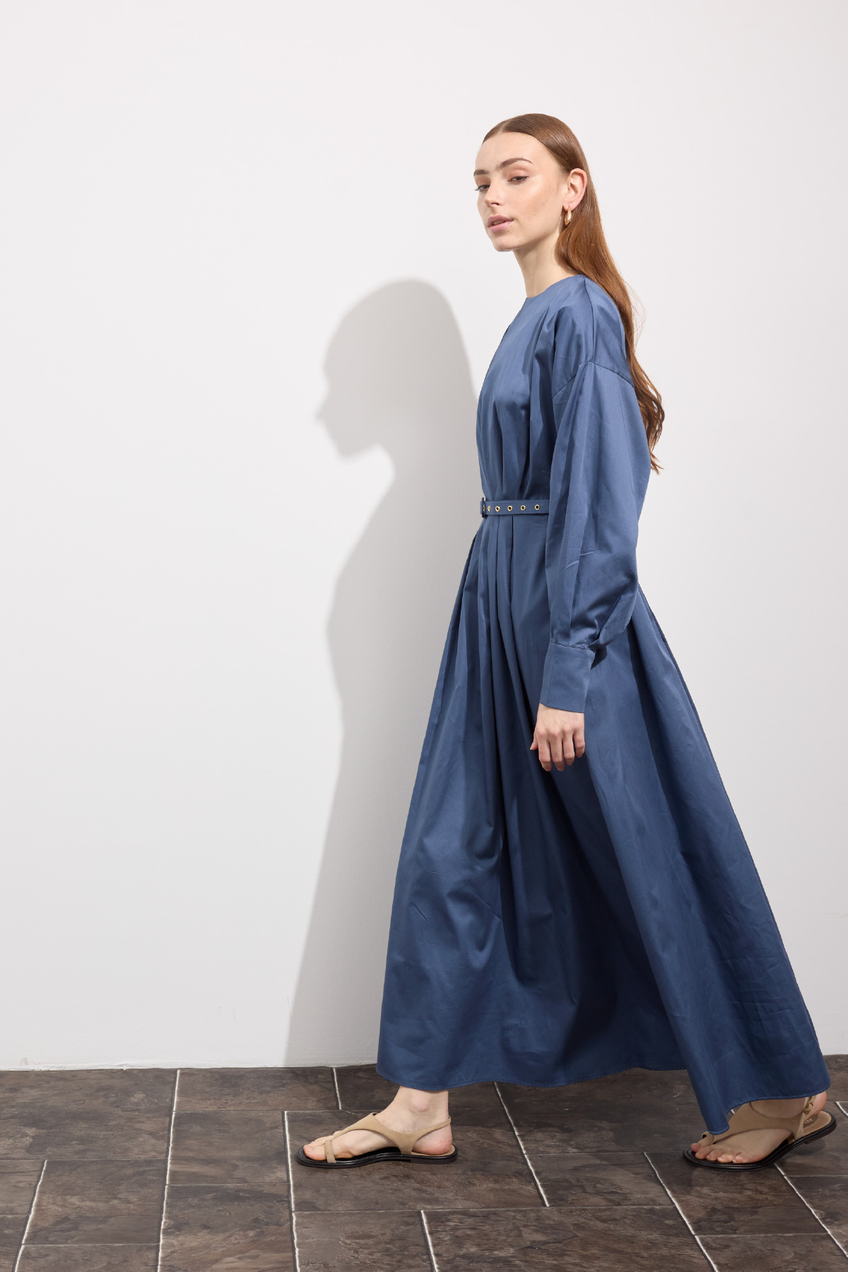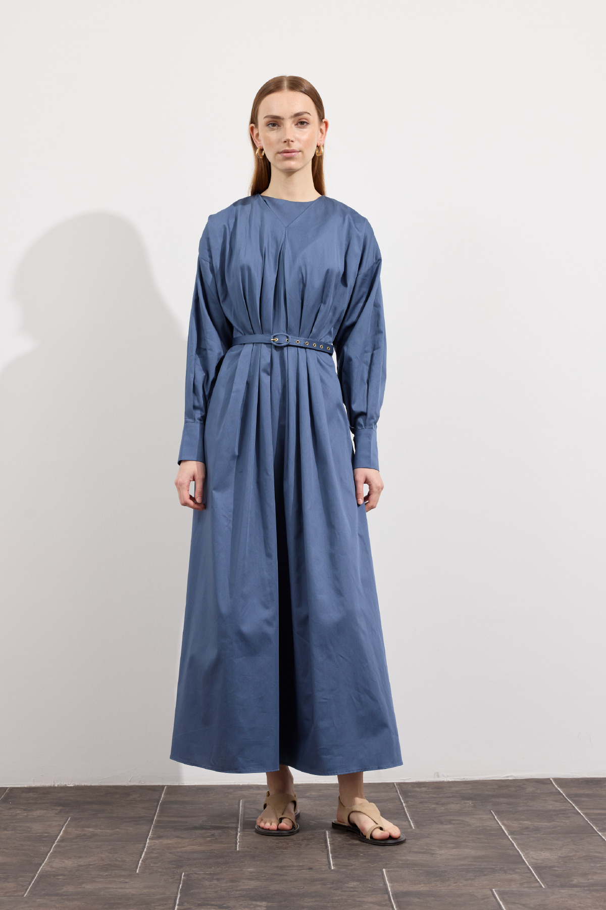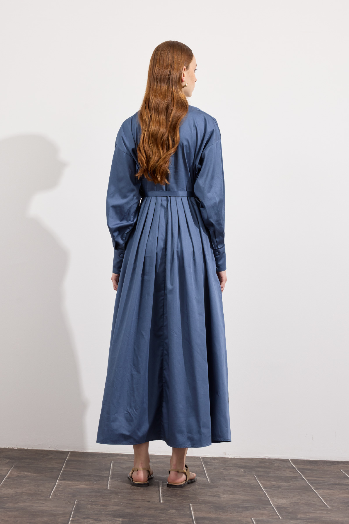 Pileli Kaplama Kemerli Elbise İndigo Mavi