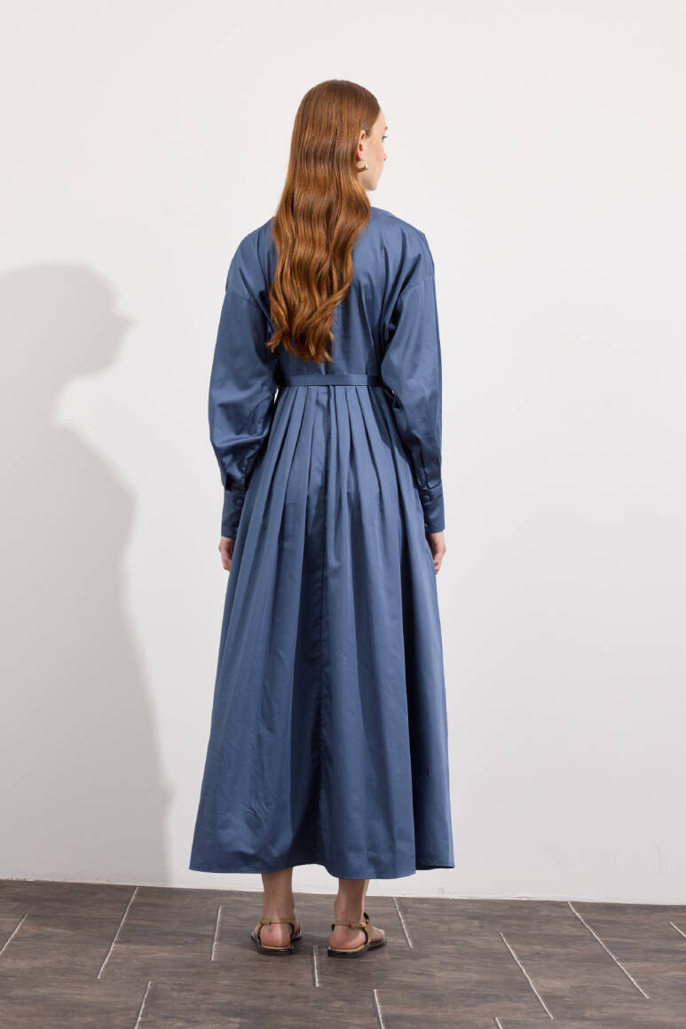 Pileli Kaplama Kemerli Elbise İndigo Mavi - 6