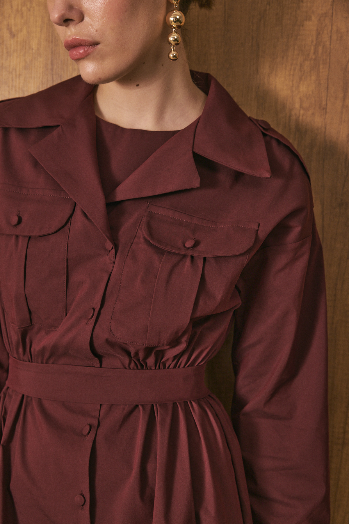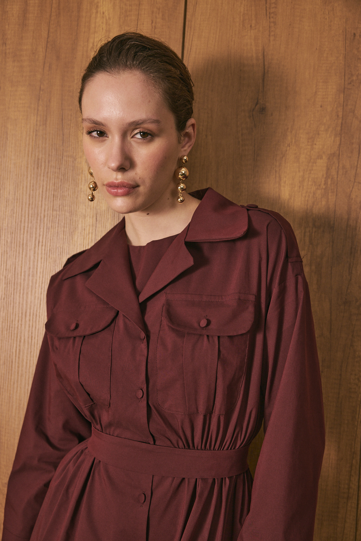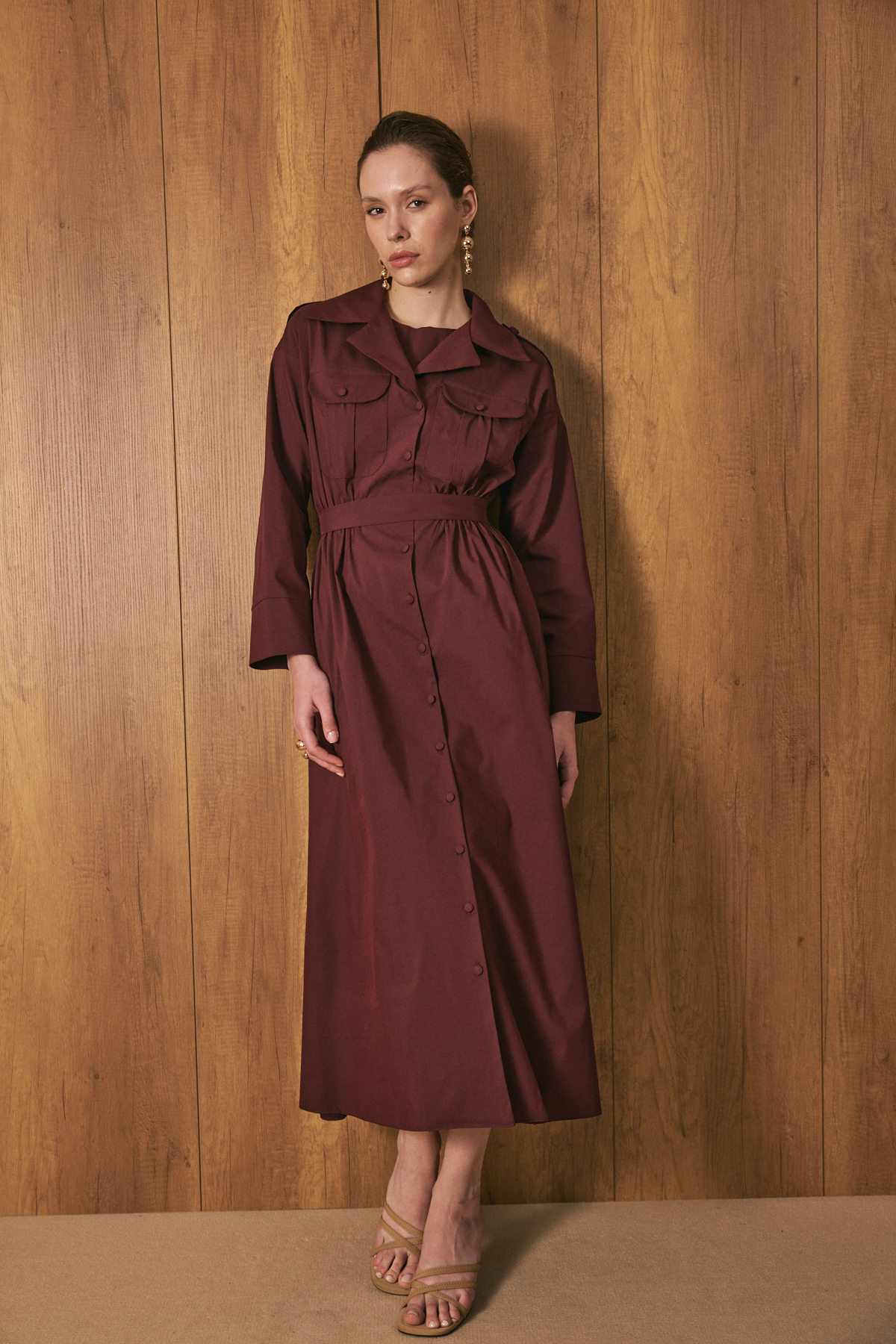 Gömlek yaka ve tam boy düğme kapama, uzun kollu, ön cep kapak detaylı, beli lastikli