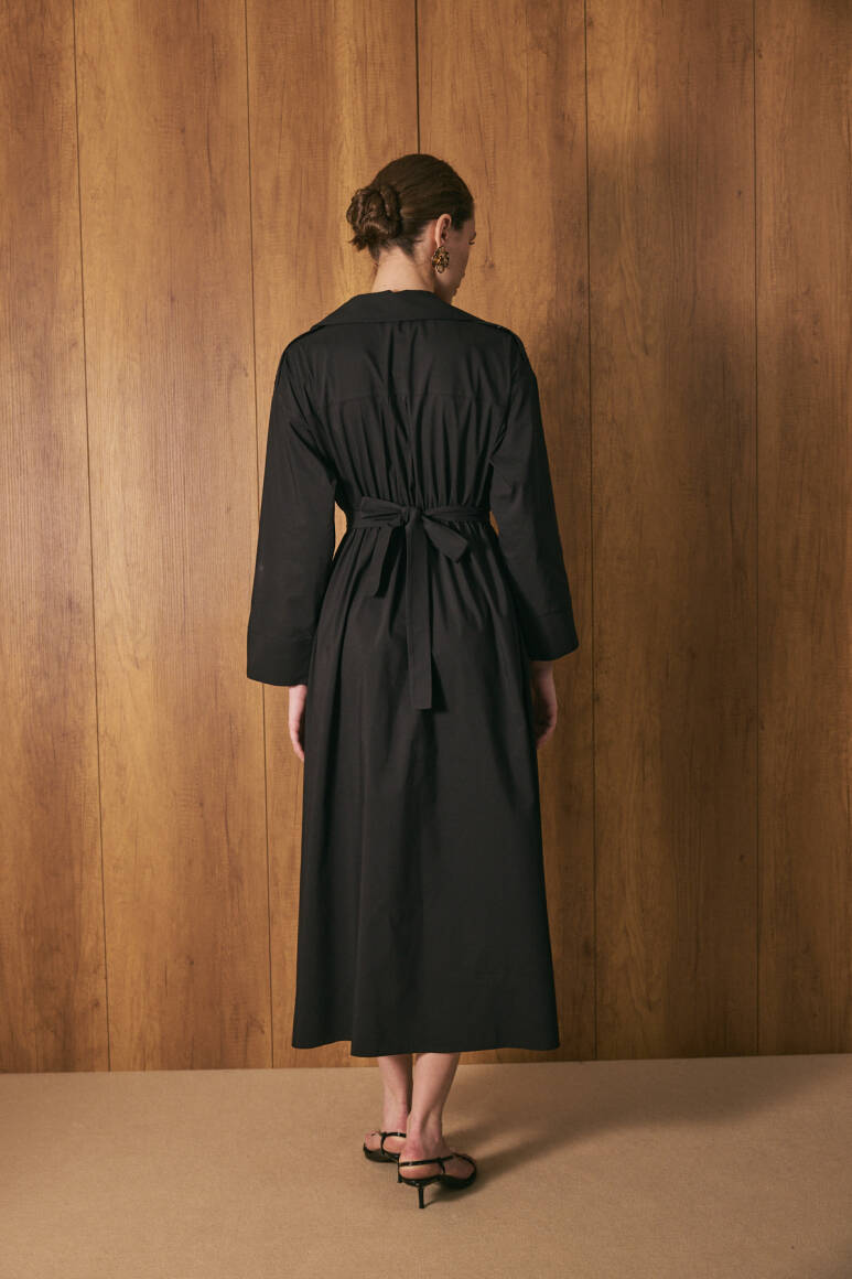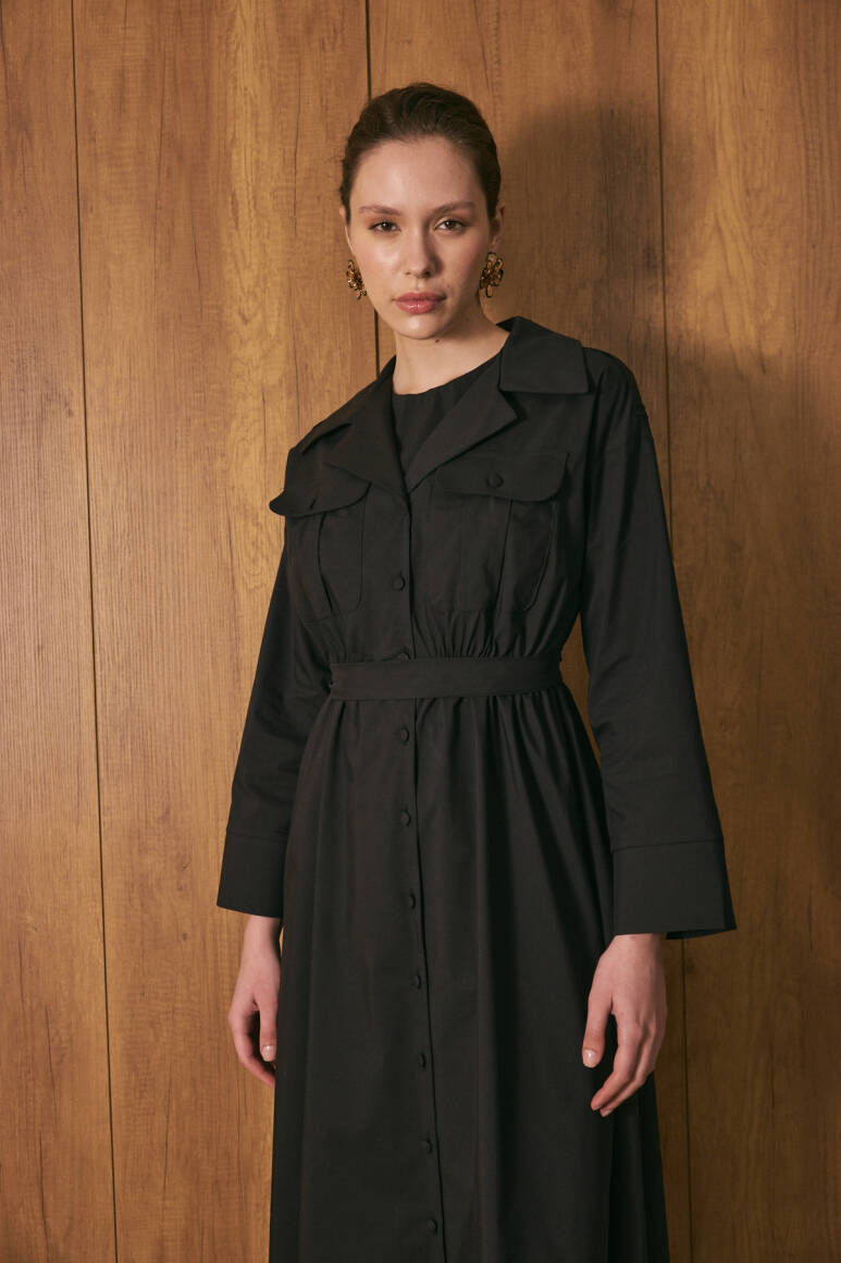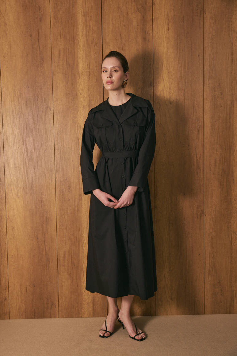 Gömlek yaka ve tam boy düğme kapama, uzun kollu, ön cep kapak detaylı, beli lastikli