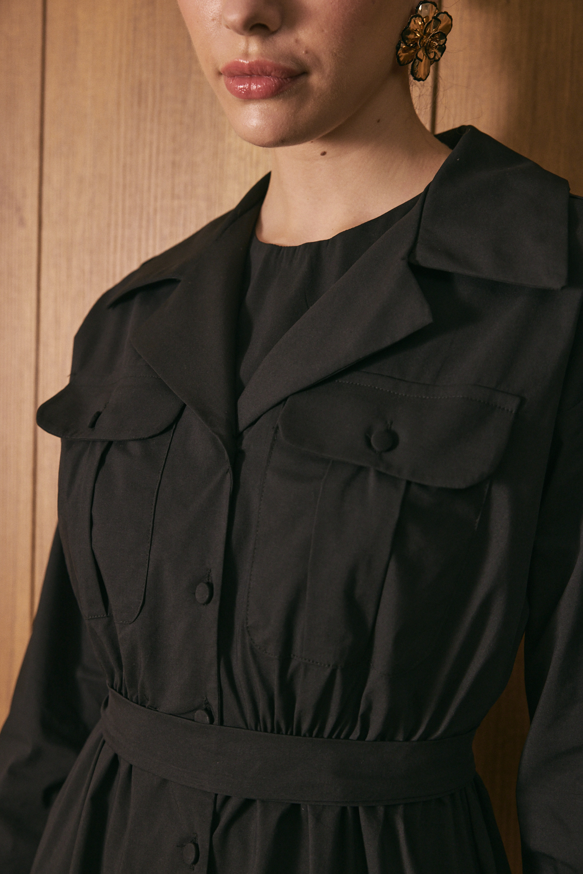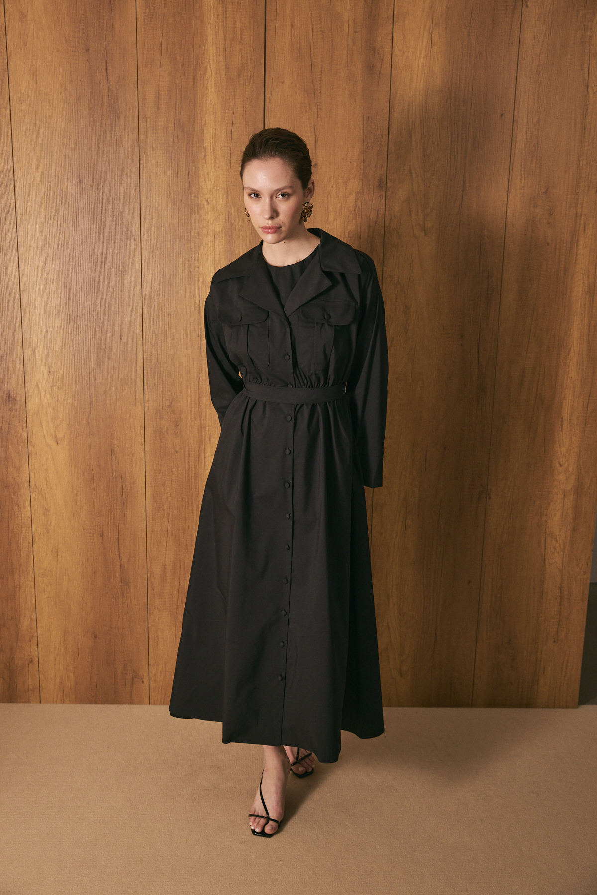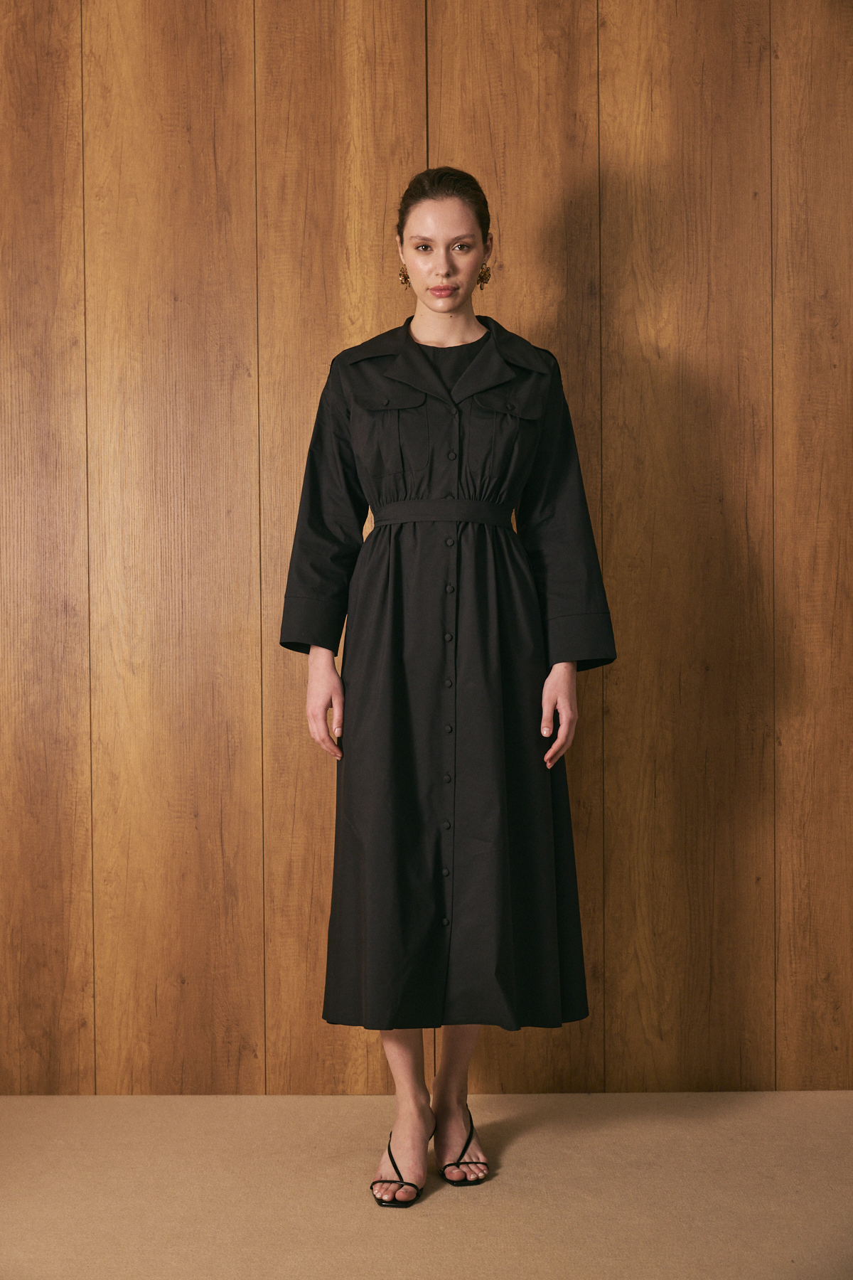 Gömlek yaka ve tam boy düğme kapama, uzun kollu, ön cep kapak detaylı, beli lastikli