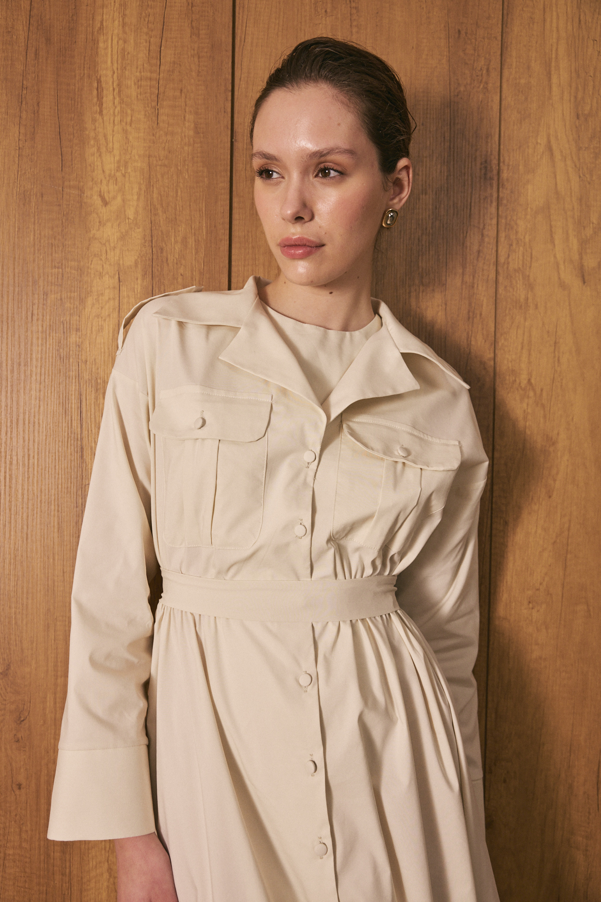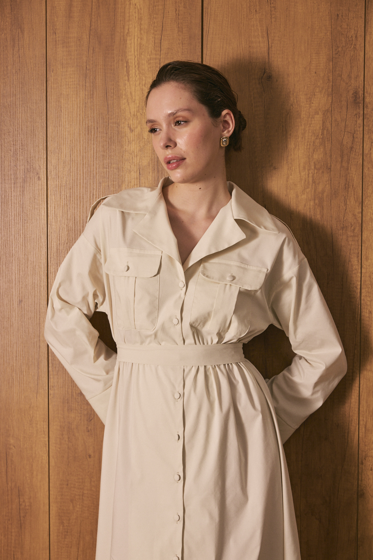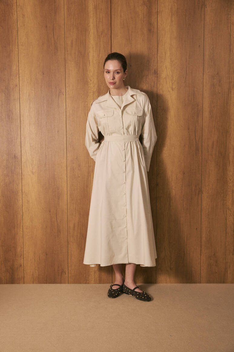 Gömlek yaka ve tam boy düğme kapama, uzun kollu, ön cep kapak detaylı, beli lastikli