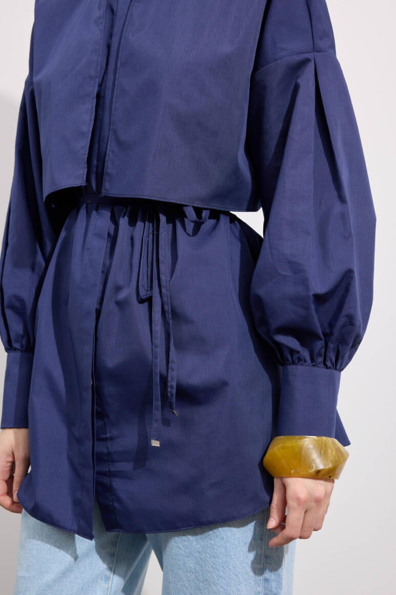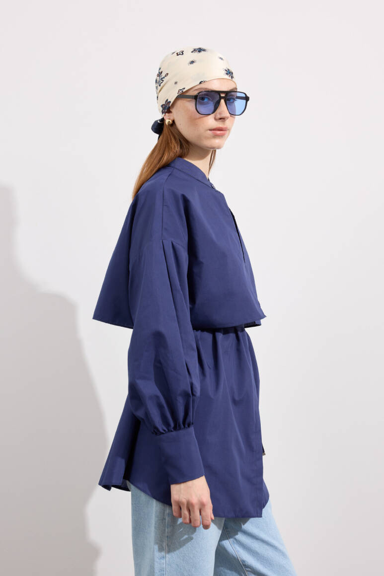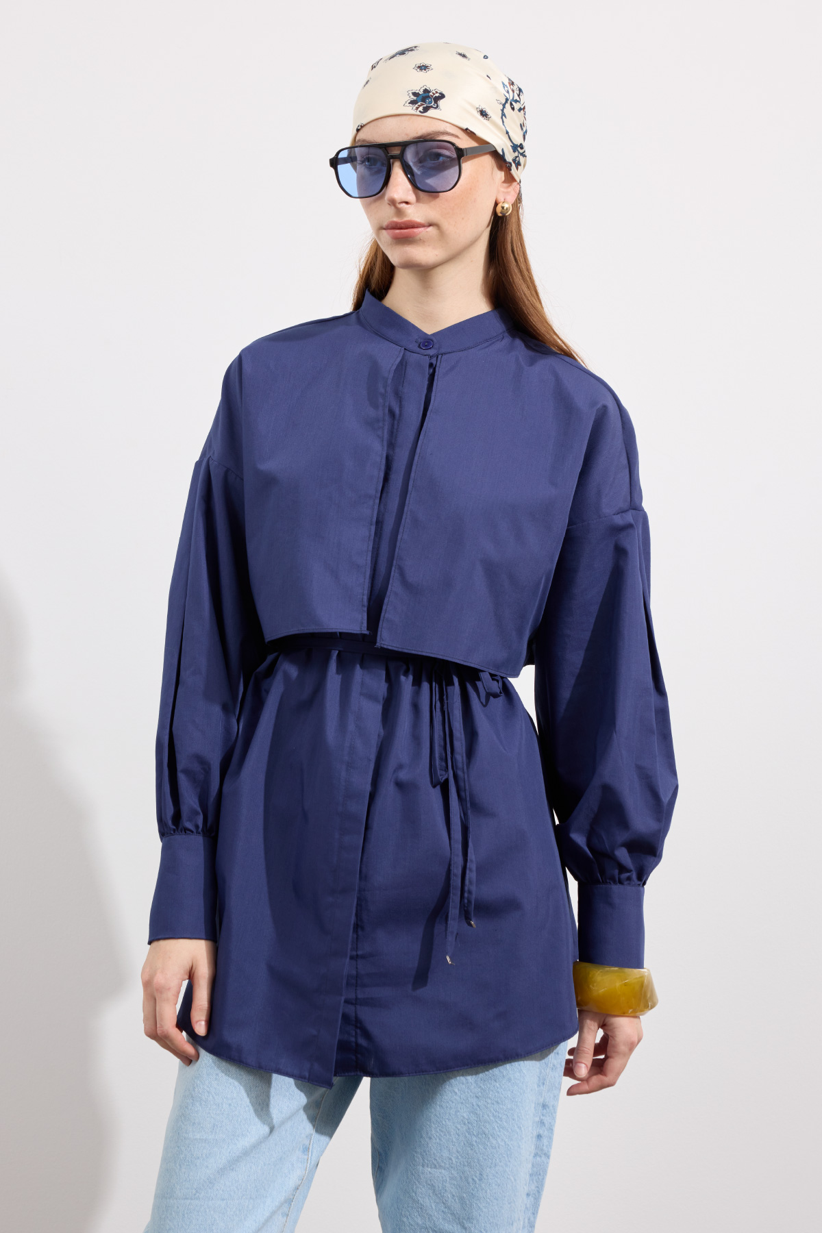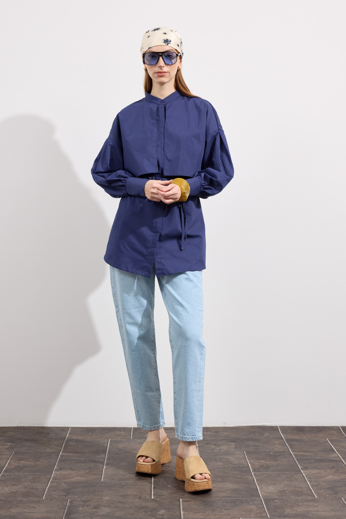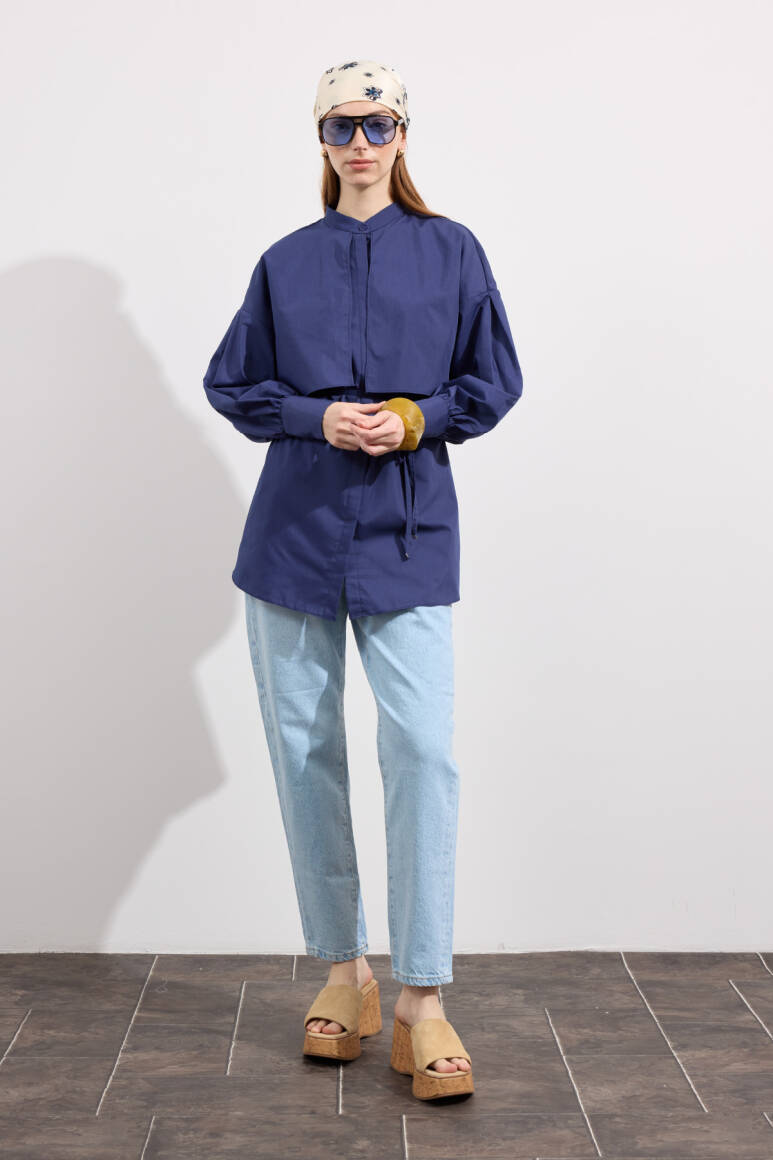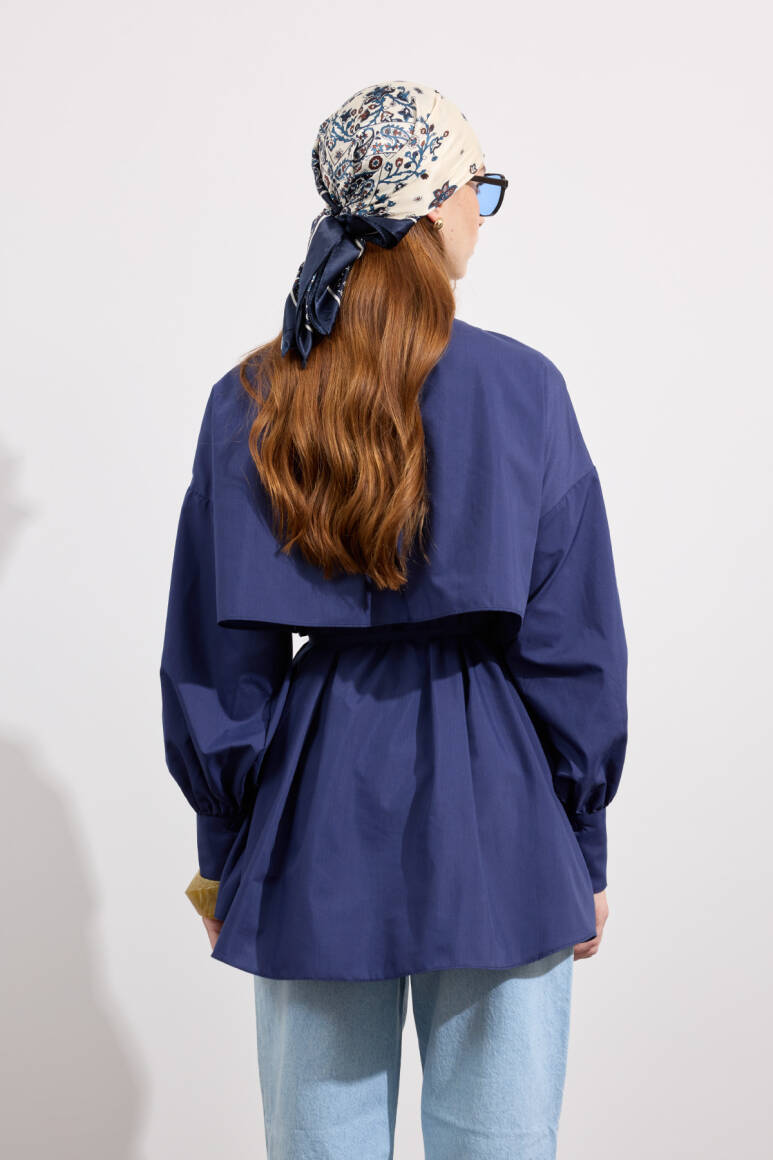 Rüzgarlık detaylı, spor görünümlü, rahat kesim, ip biye kuşak detaylı, pat kapamalı düğmeli, kol ucu manşetli düğmeli.