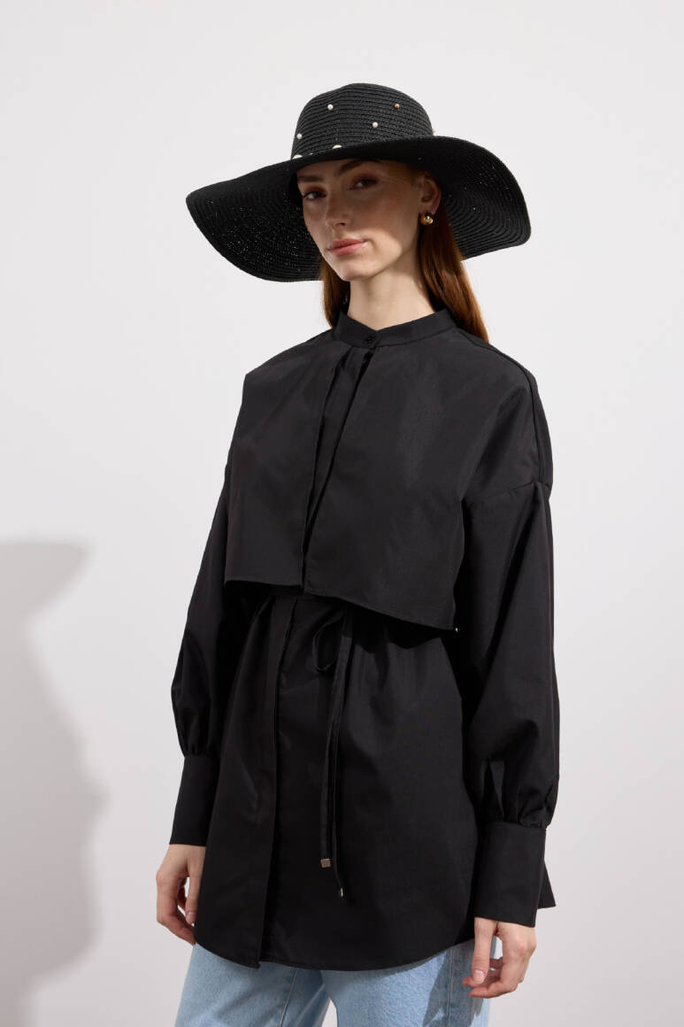 Rüzgarlık detaylı, spor görünümlü, rahat kesim, ip biye kuşak detaylı, pat kapamalı düğmeli, kol ucu manşetli düğmeli.