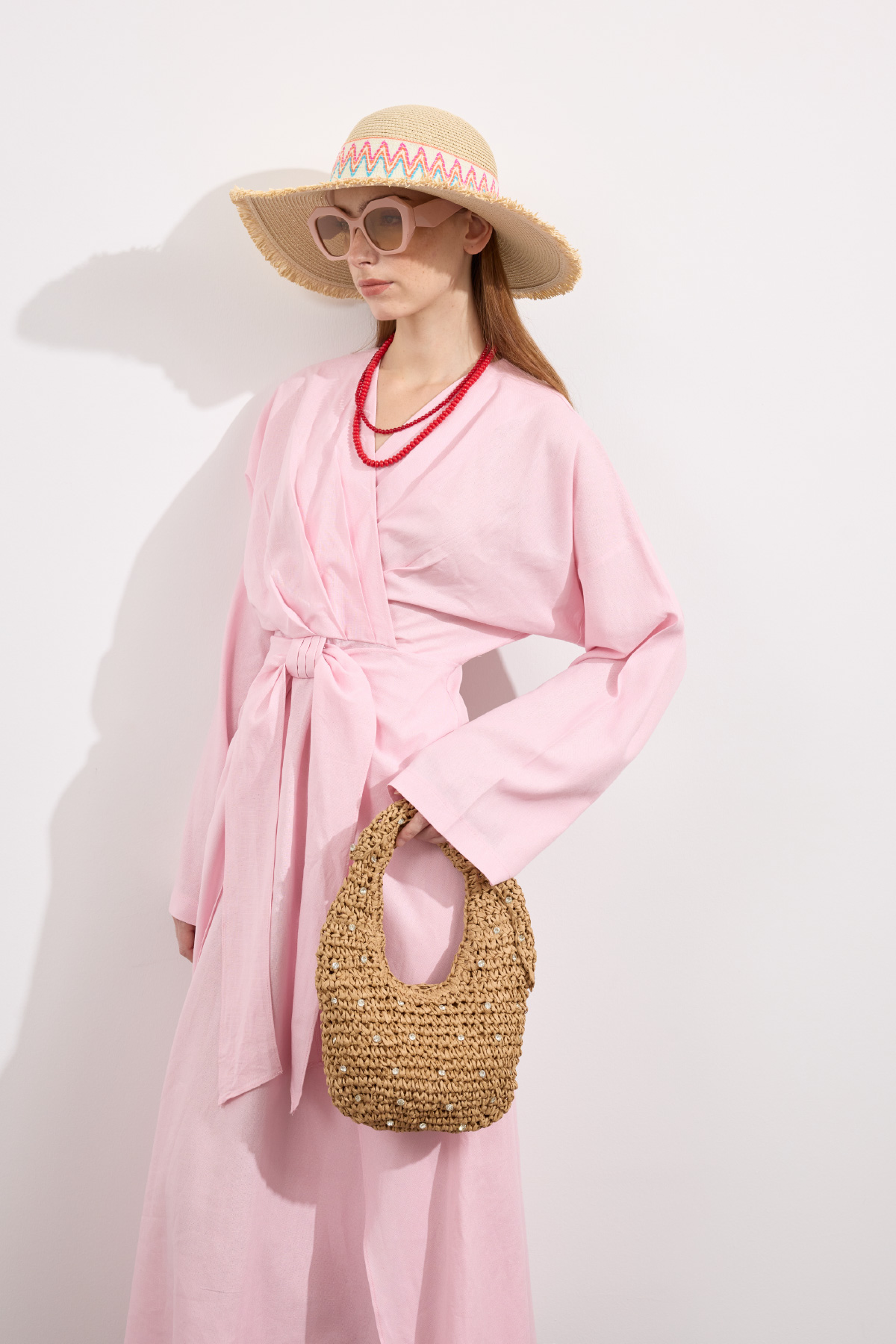 Doğal hasır dokusu ve kenar püskülleriyle bohem bir hava sunar.