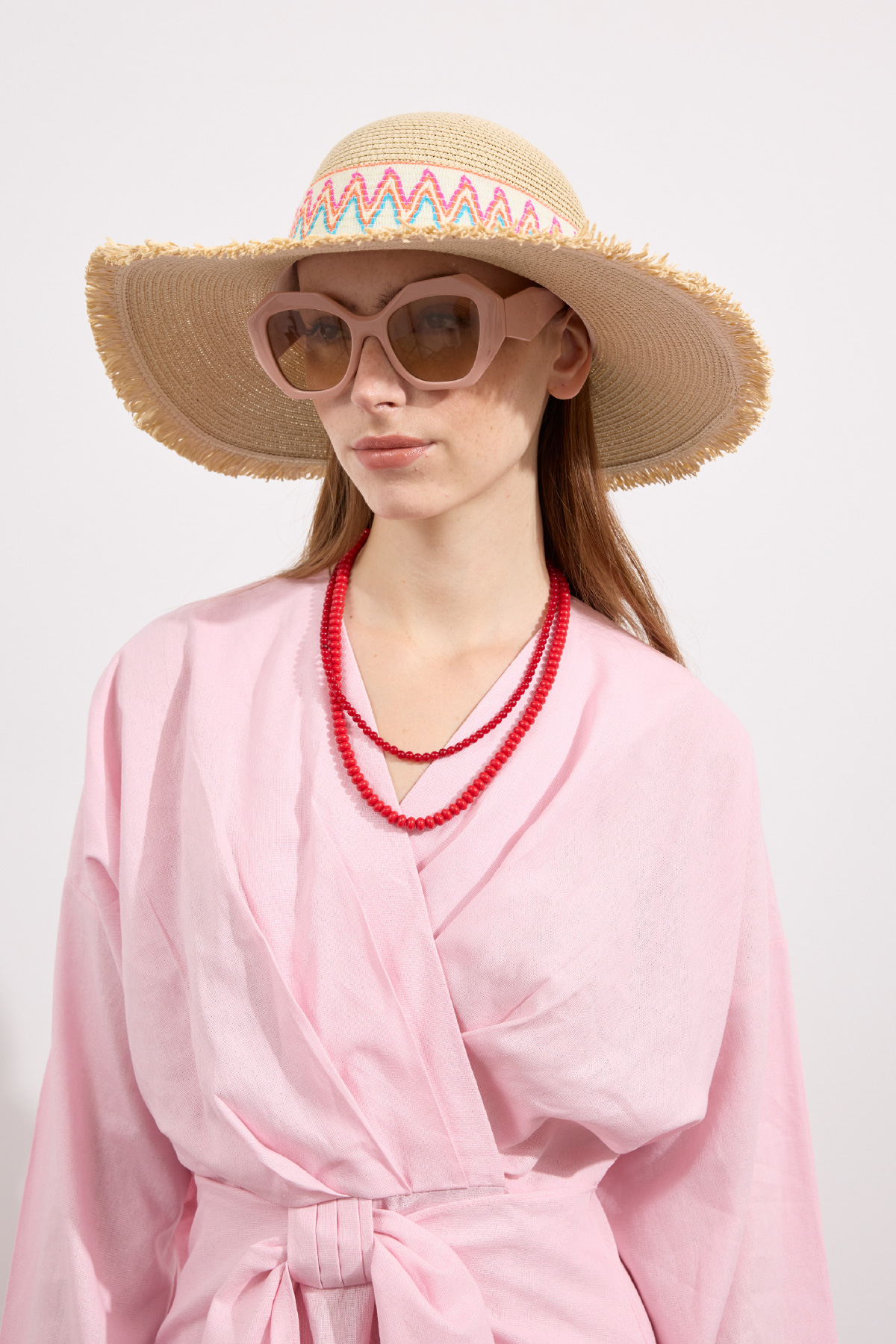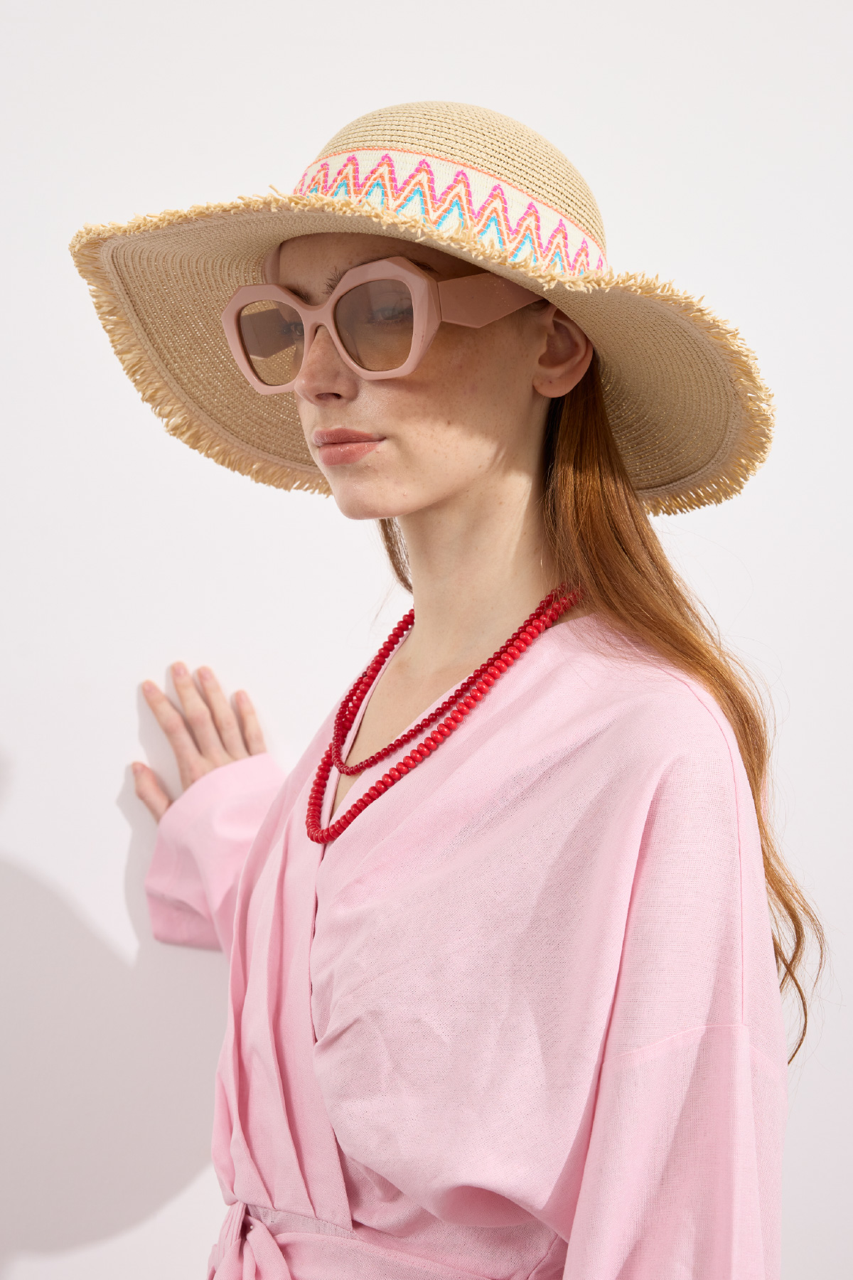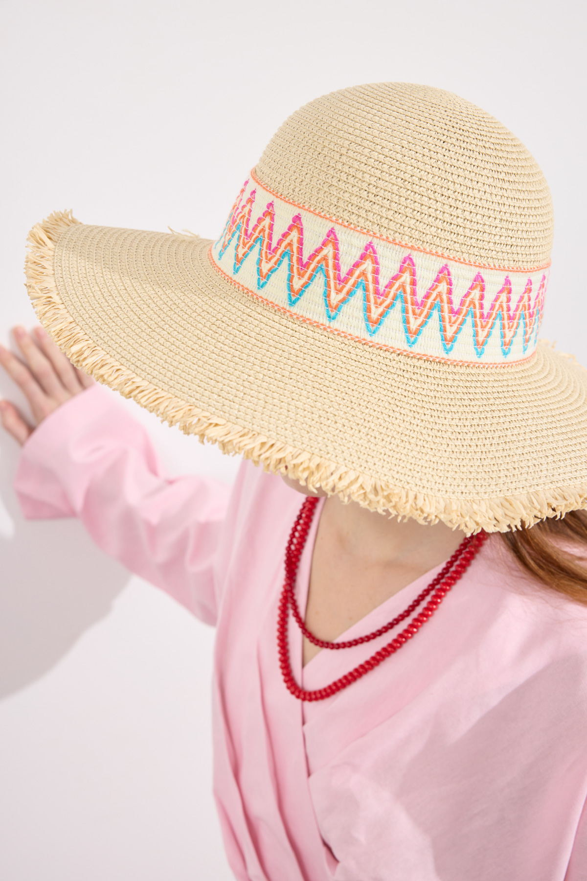 Renkli etnik desenli bandı ile yaz kombinlerine canlılık katar. Geniş siperliği sayesinde hem şık hem de koruyucu bir kullanım sağlar.