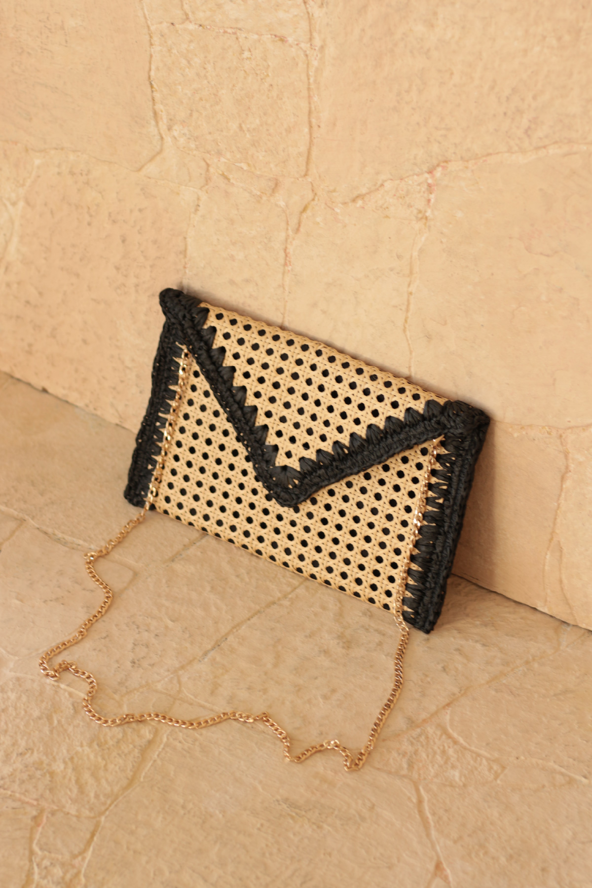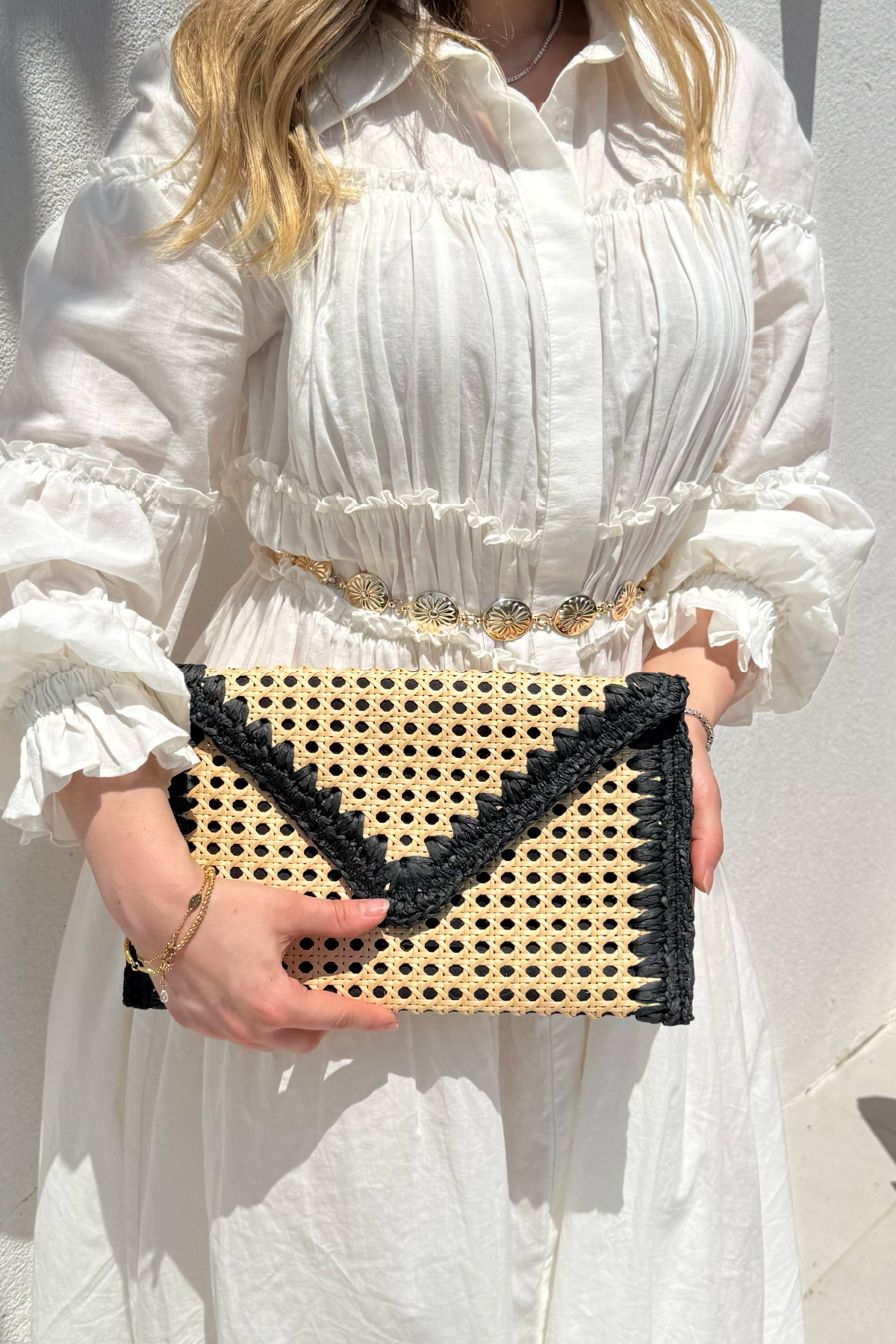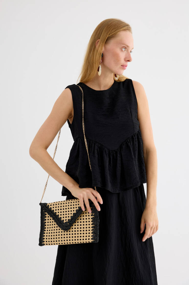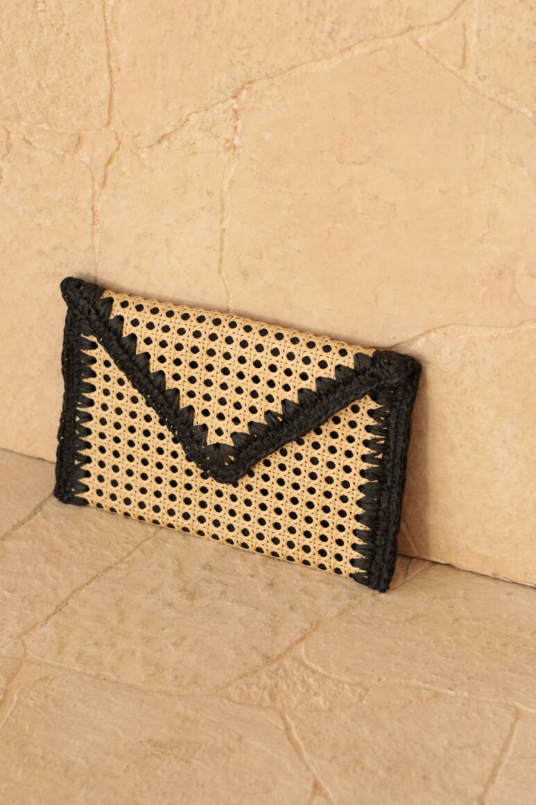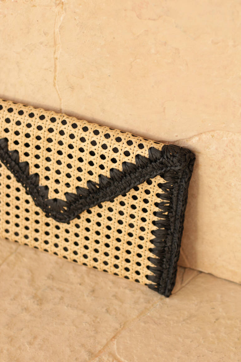 Bohem şıklığı ve doğallığı bir araya getiren bu hasır zarf çanta, yaz kombinlerinize zarif ve sade bir dokunuş katıyor. El işçiliğiyle hazırlanmış örgü detayları ve doğal malzemesiyle hem plaj stiline hem şehir şıklığına uyum sağlar. Minimal tasarımı sayesinde hem gündüz hem gece kullanımına uygundur.
