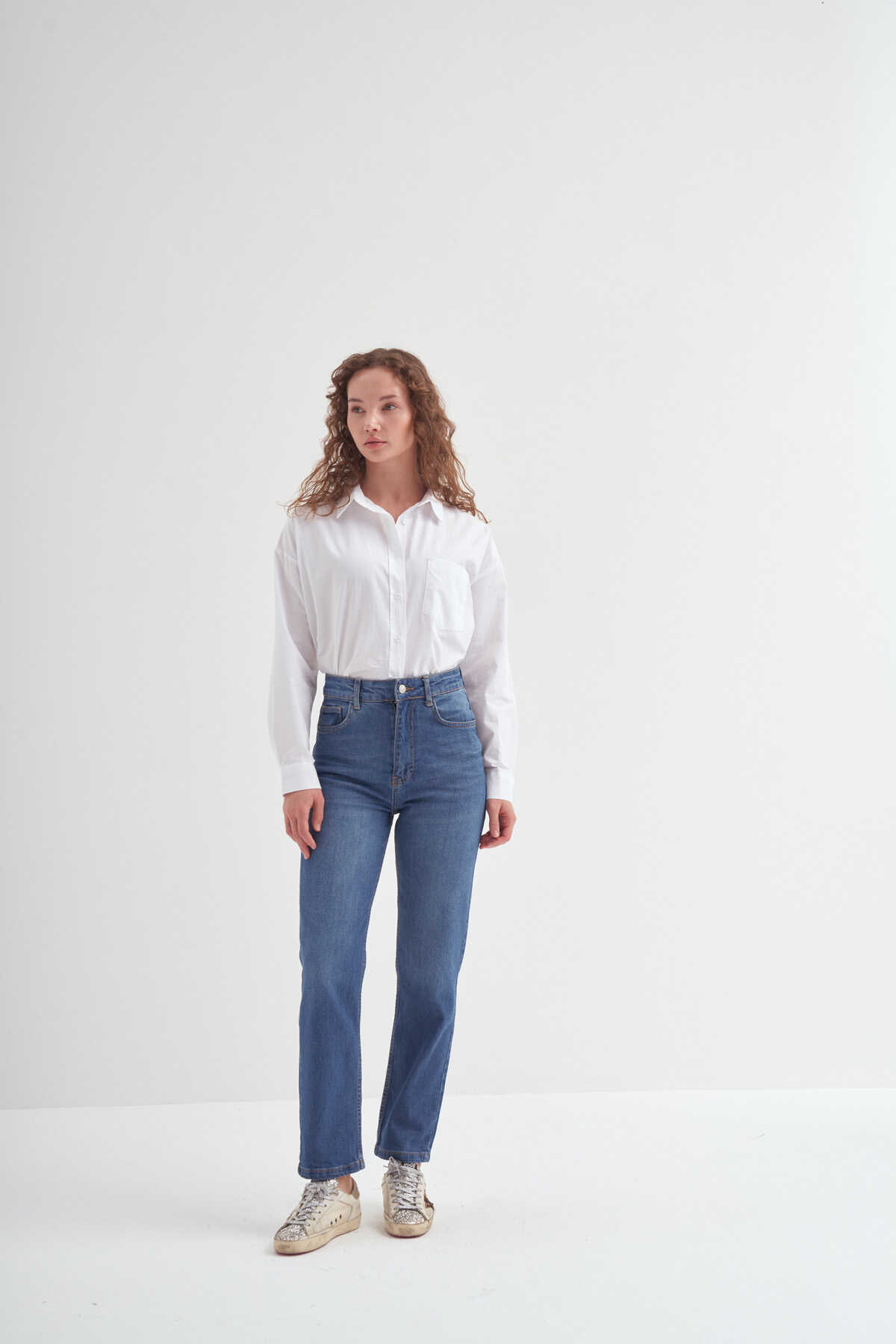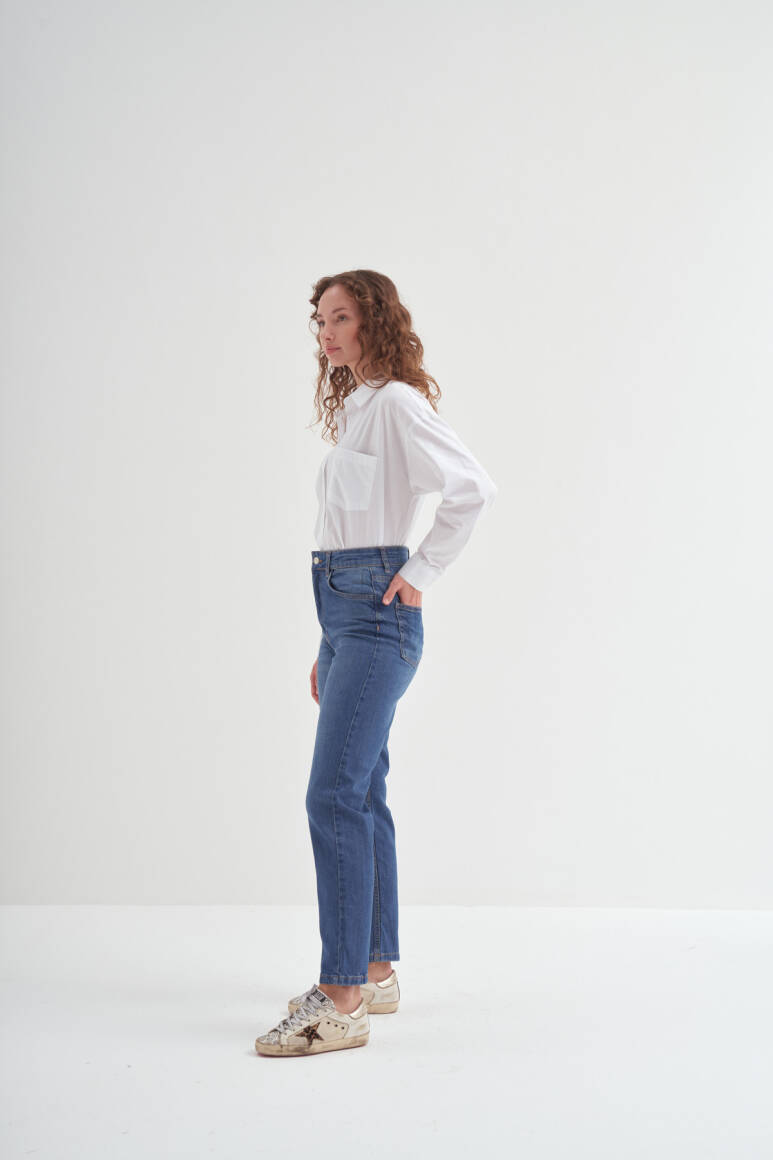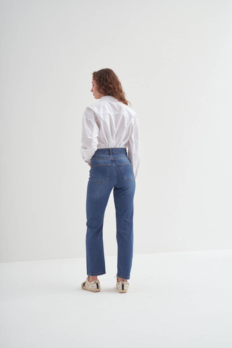 Yüksek bel jean. cepli tasarımlı, önü fermuarlı ve üstü düğmeli.