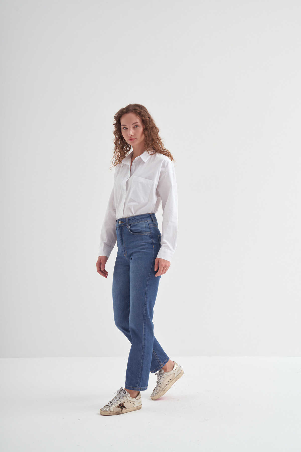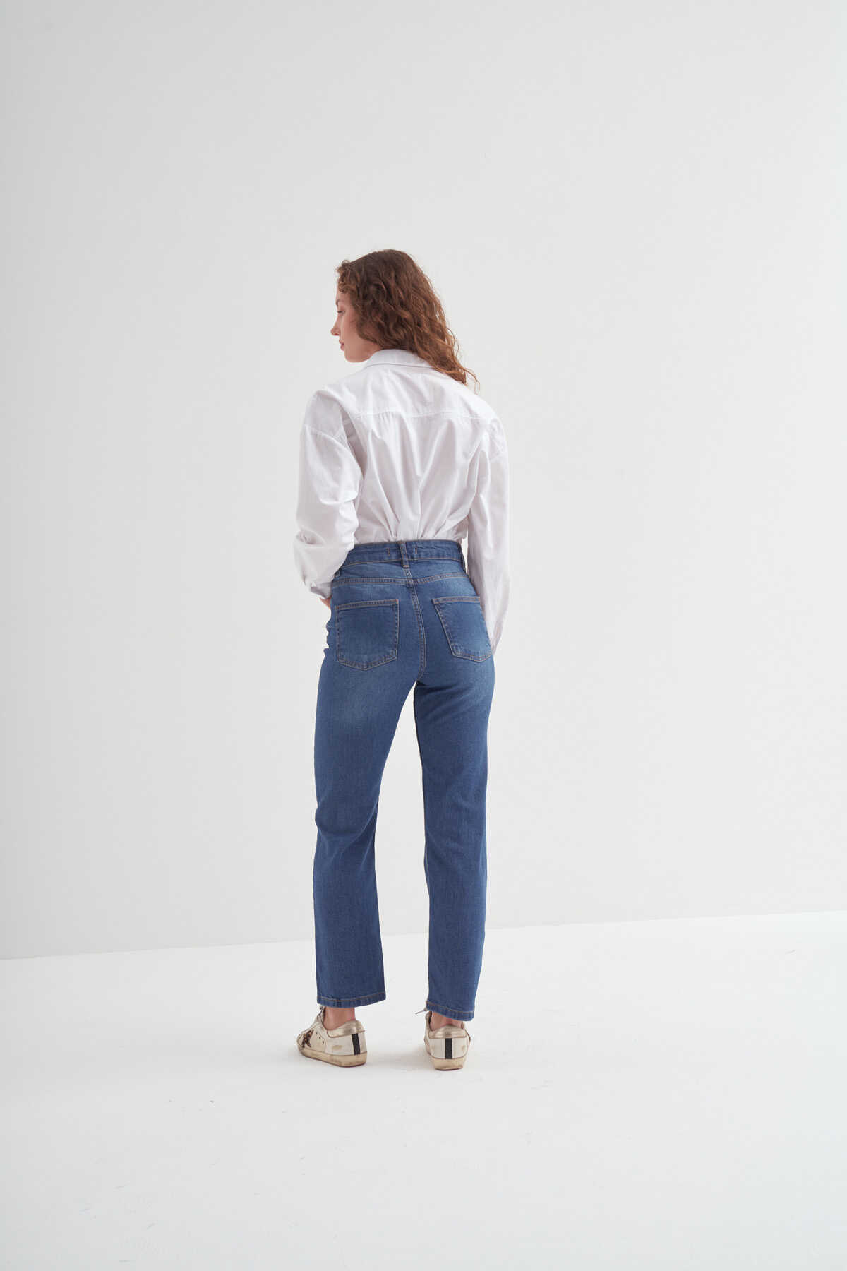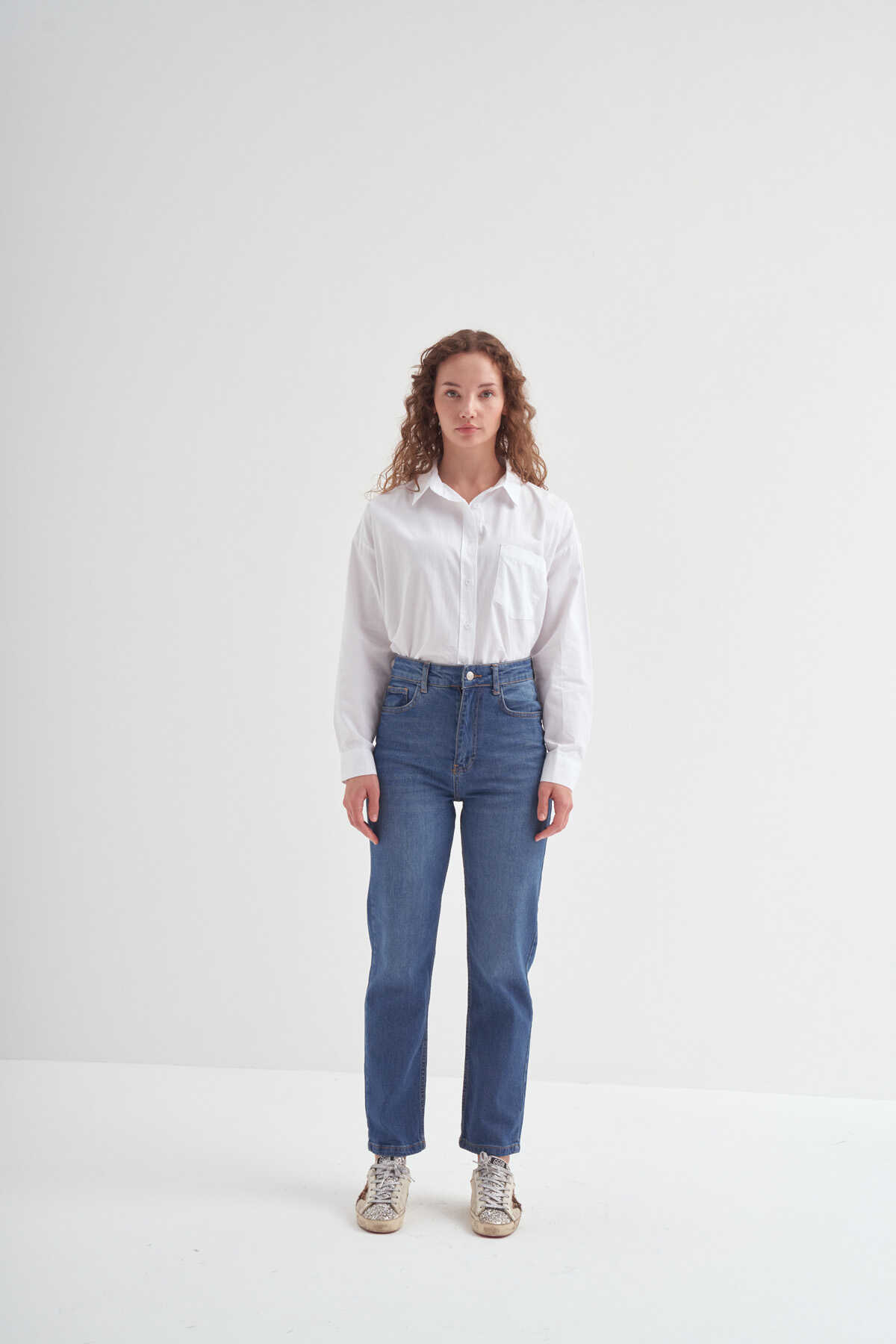 Yüksek bel jean. cepli tasarımlı, önü fermuarlı ve üstü düğmeli.