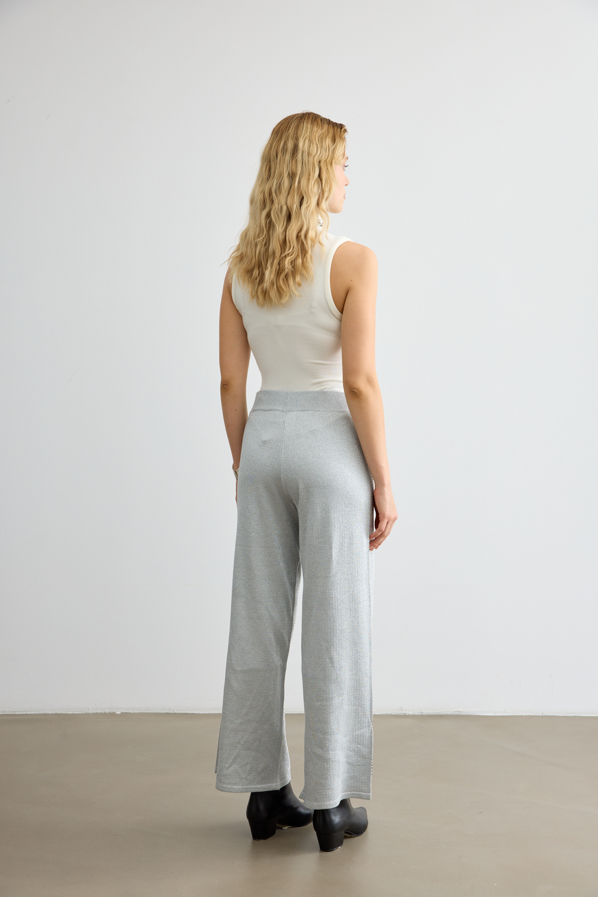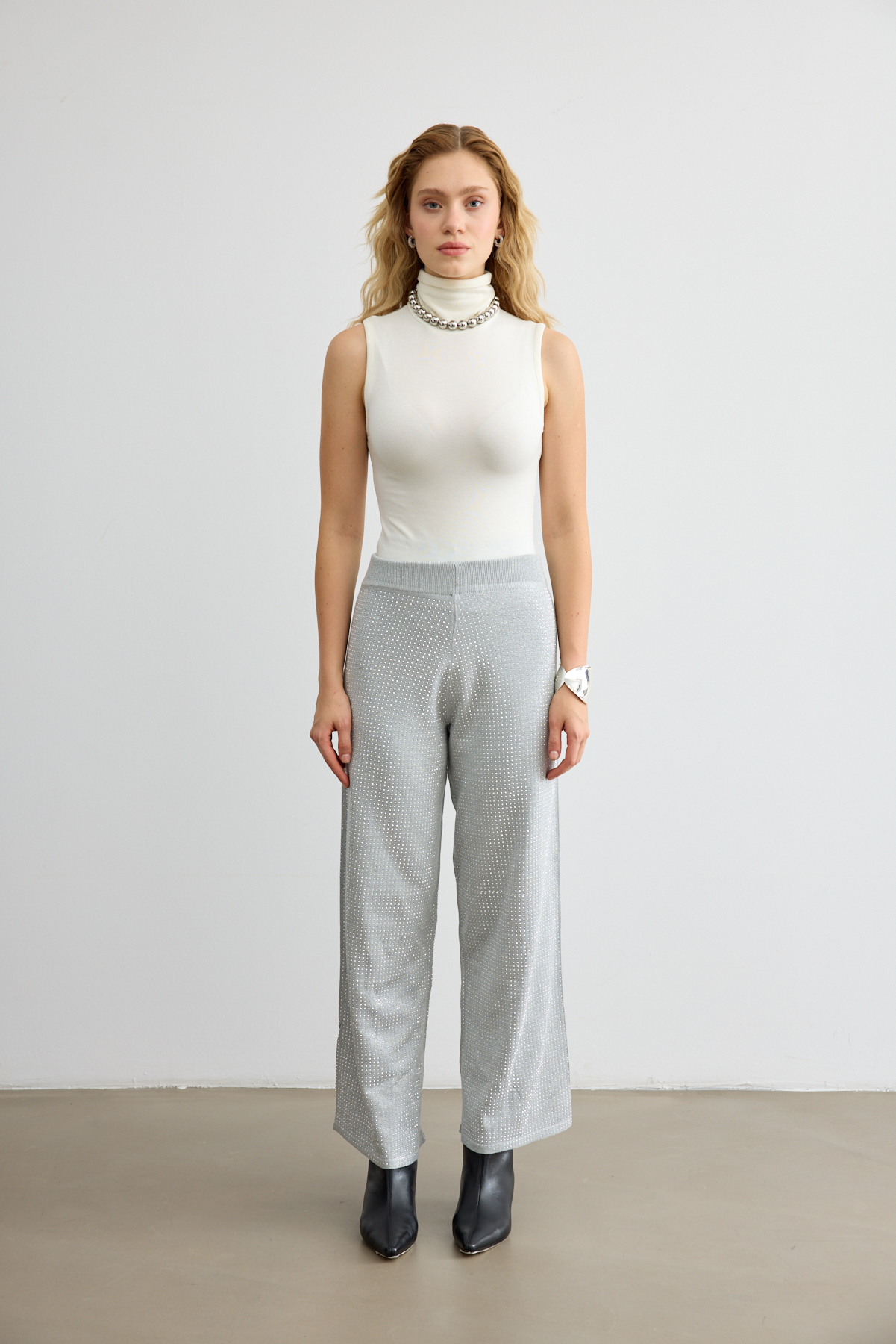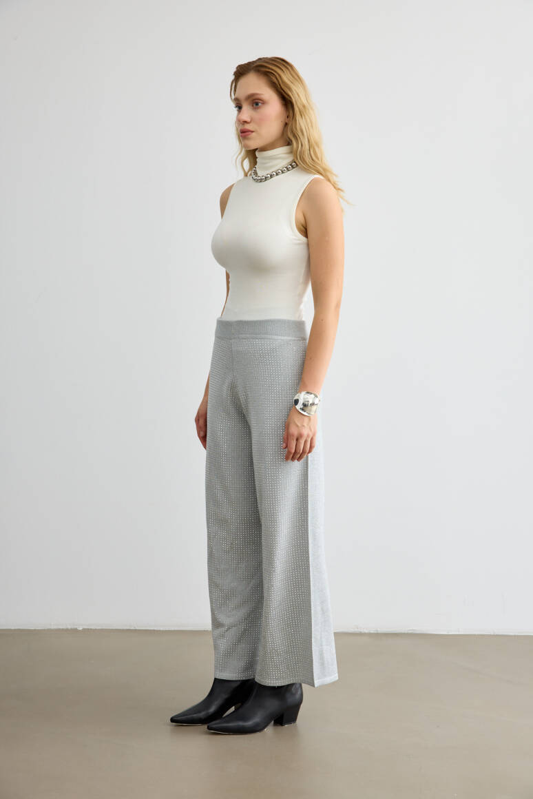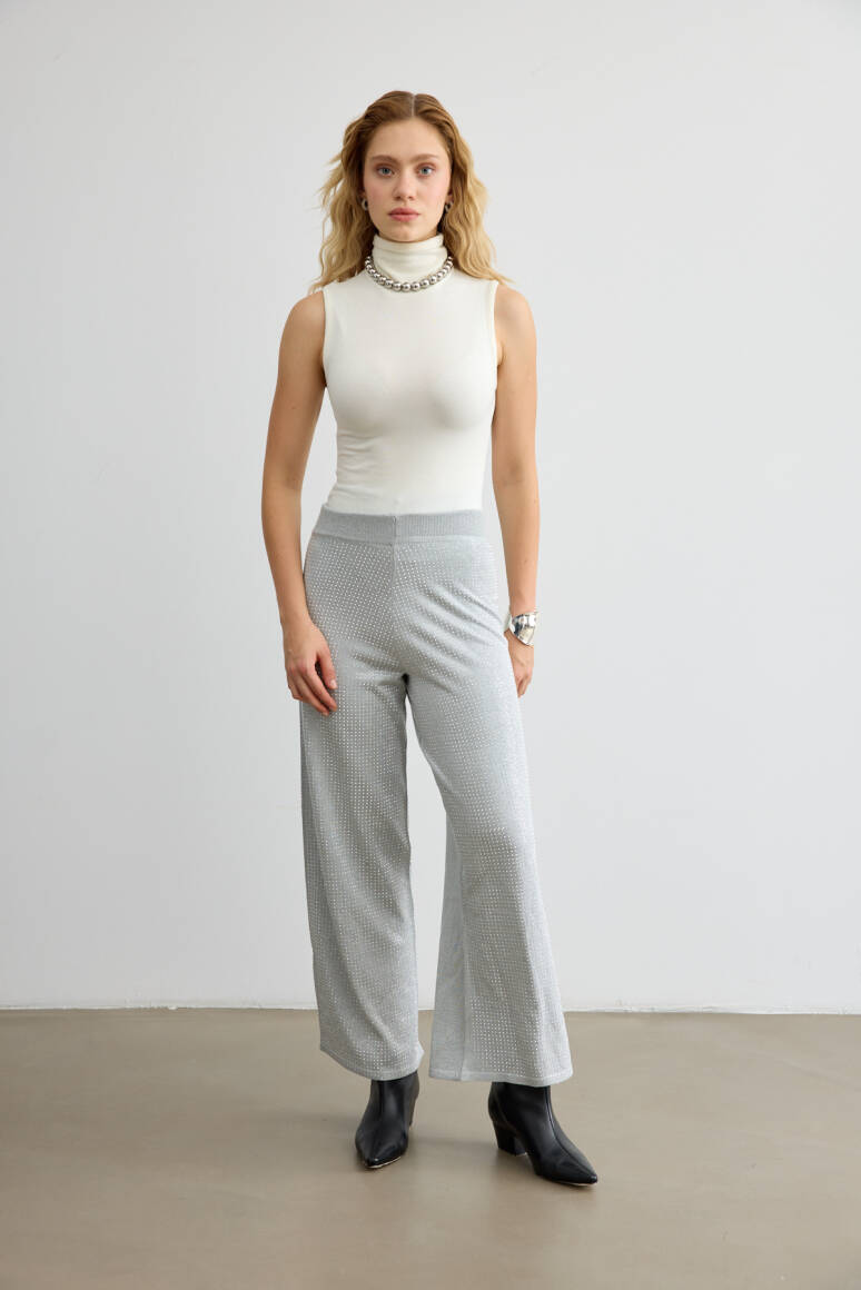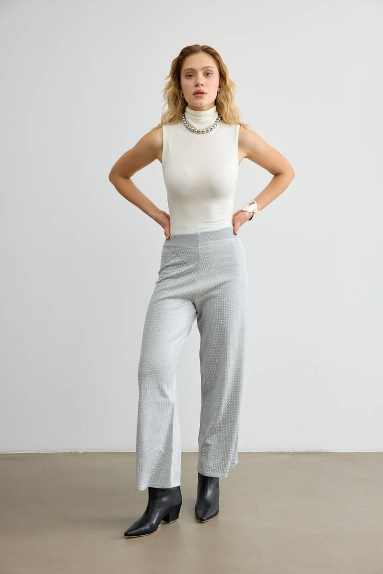 Rahat kalıbı ve ışıltılı taş detaylarıyla dikkat çeken triko pantolon. Hem gündüz hem gece görünümlerine modern bir dokunuş katar.
