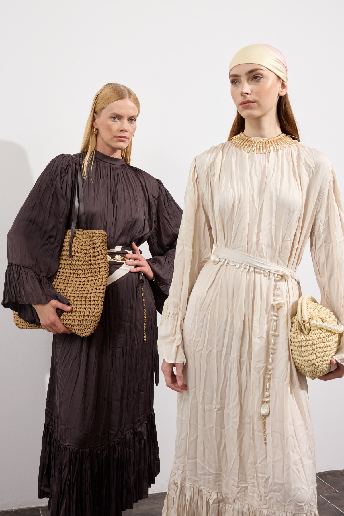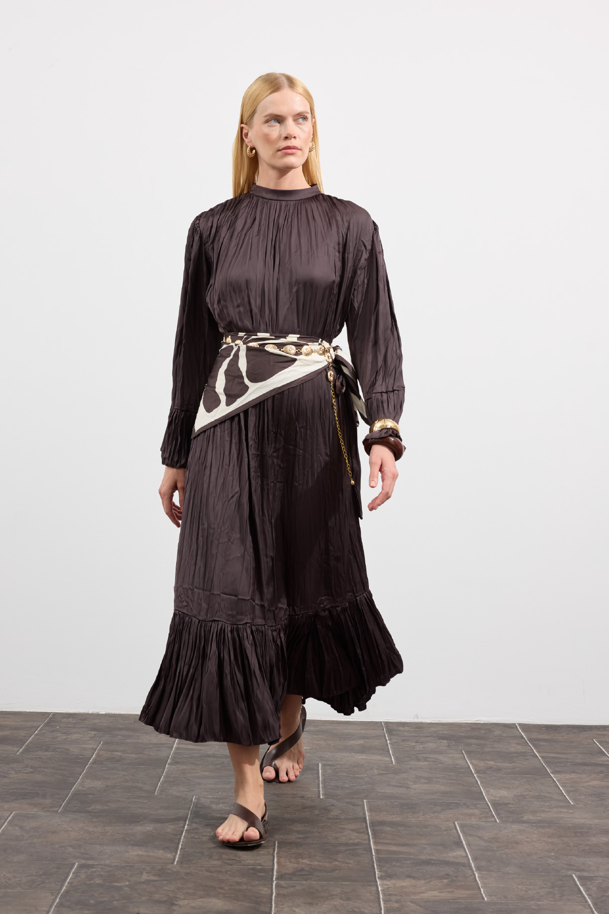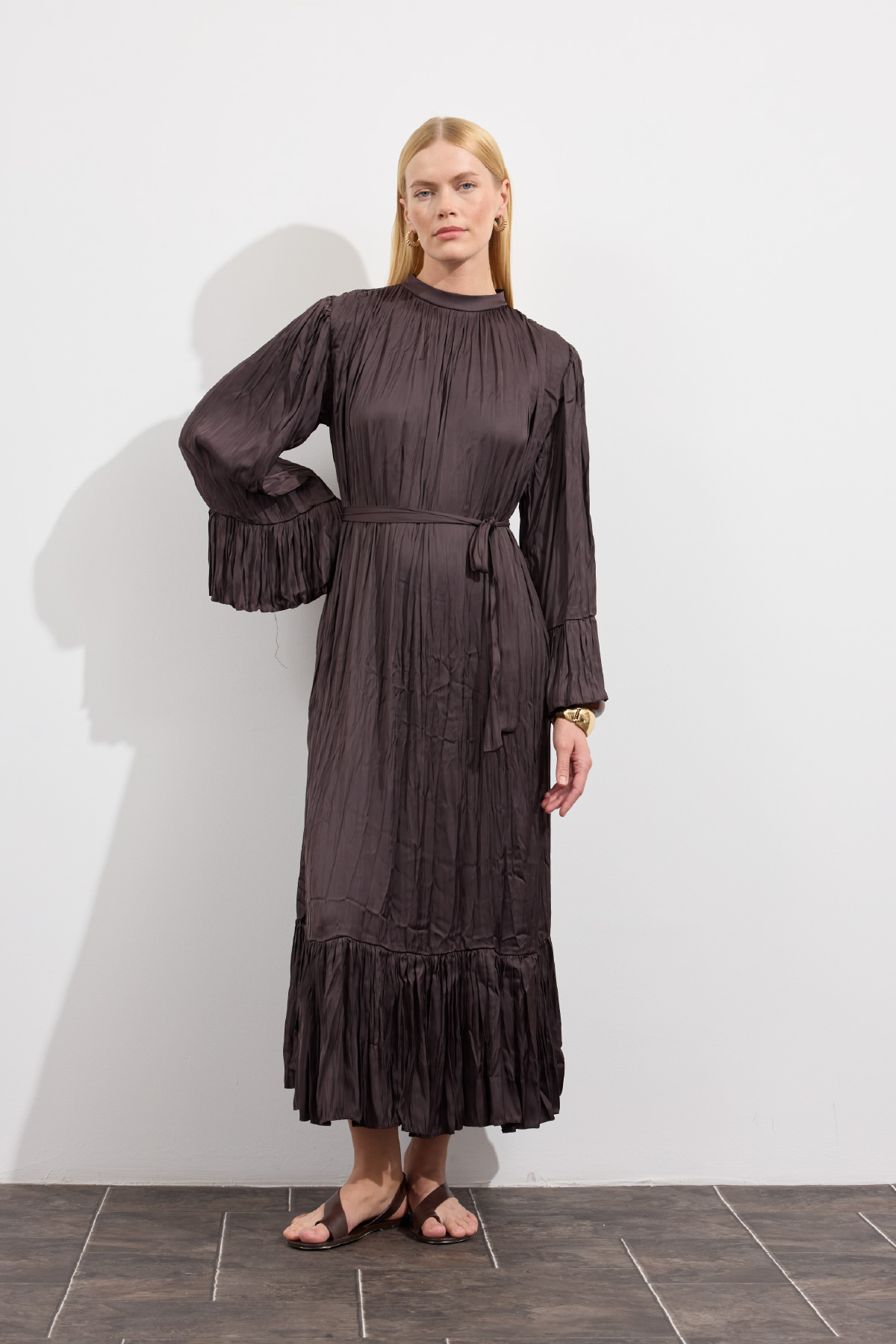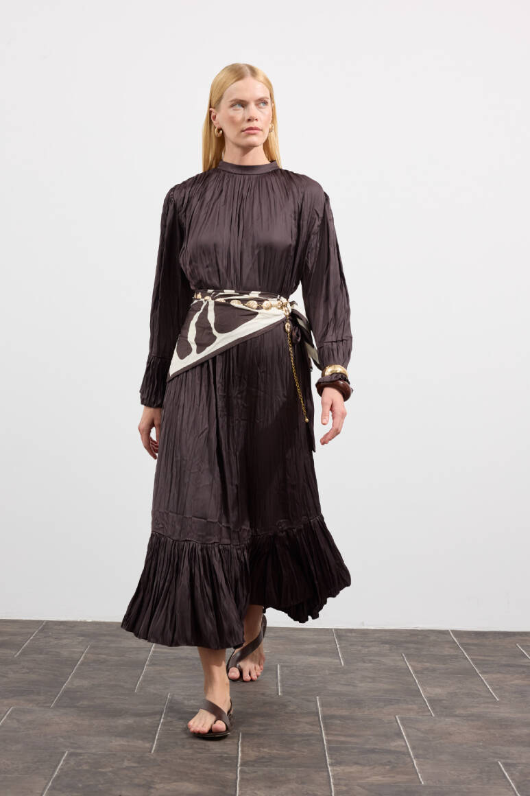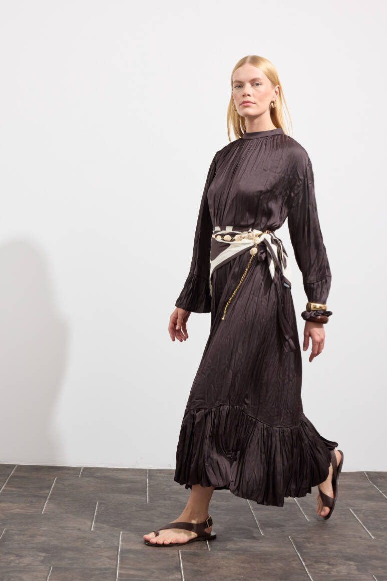 Zarif tasarım, yaka ve omuzdan gelen dökümlü büzgü detaylı, kuşaklı, kol ve etek ucu büzgü volanlı, crush efektli, ipek görünümlü, rahat ve geniş formlu.