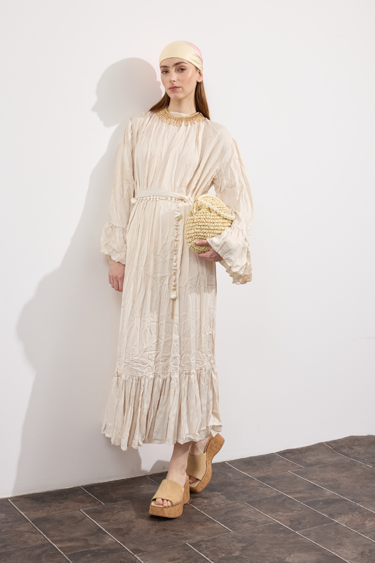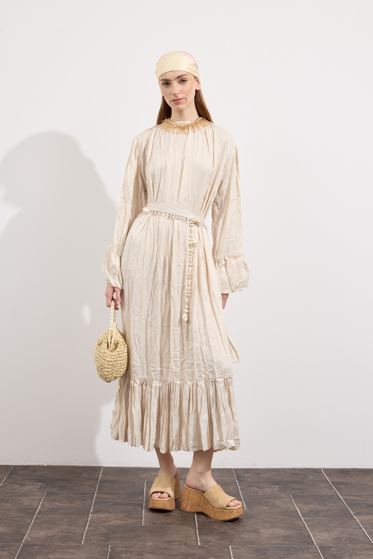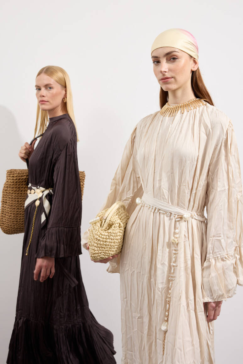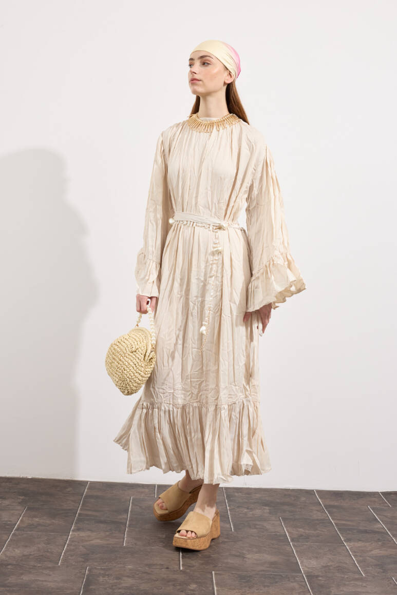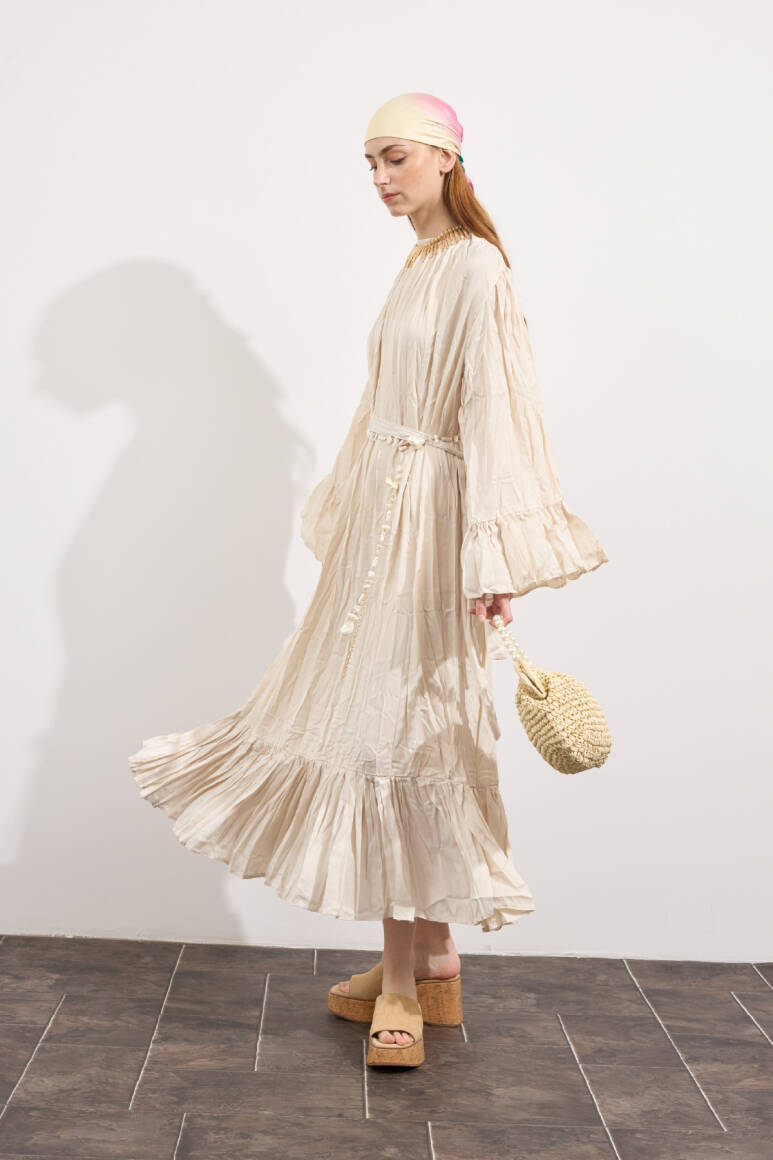 Zarif tasarım, yaka ve omuzdan gelen dökümlü büzgü detaylı, kuşaklı, kol ve etek ucu büzgü volanlı, crush efektli, ipek görünümlü, rahat ve geniş formlu.
