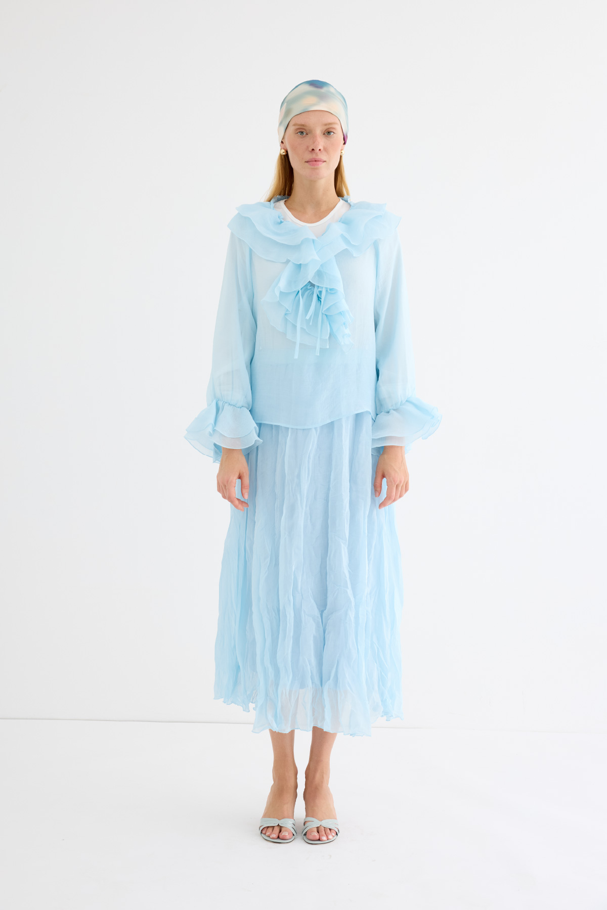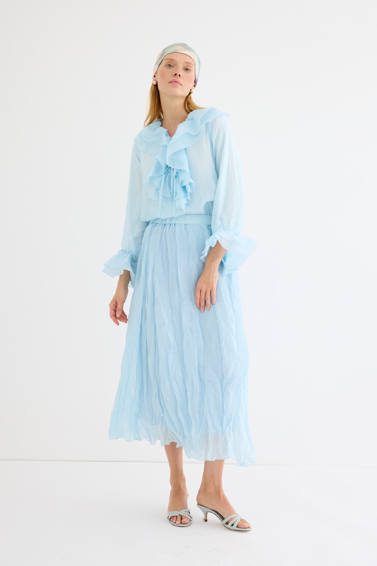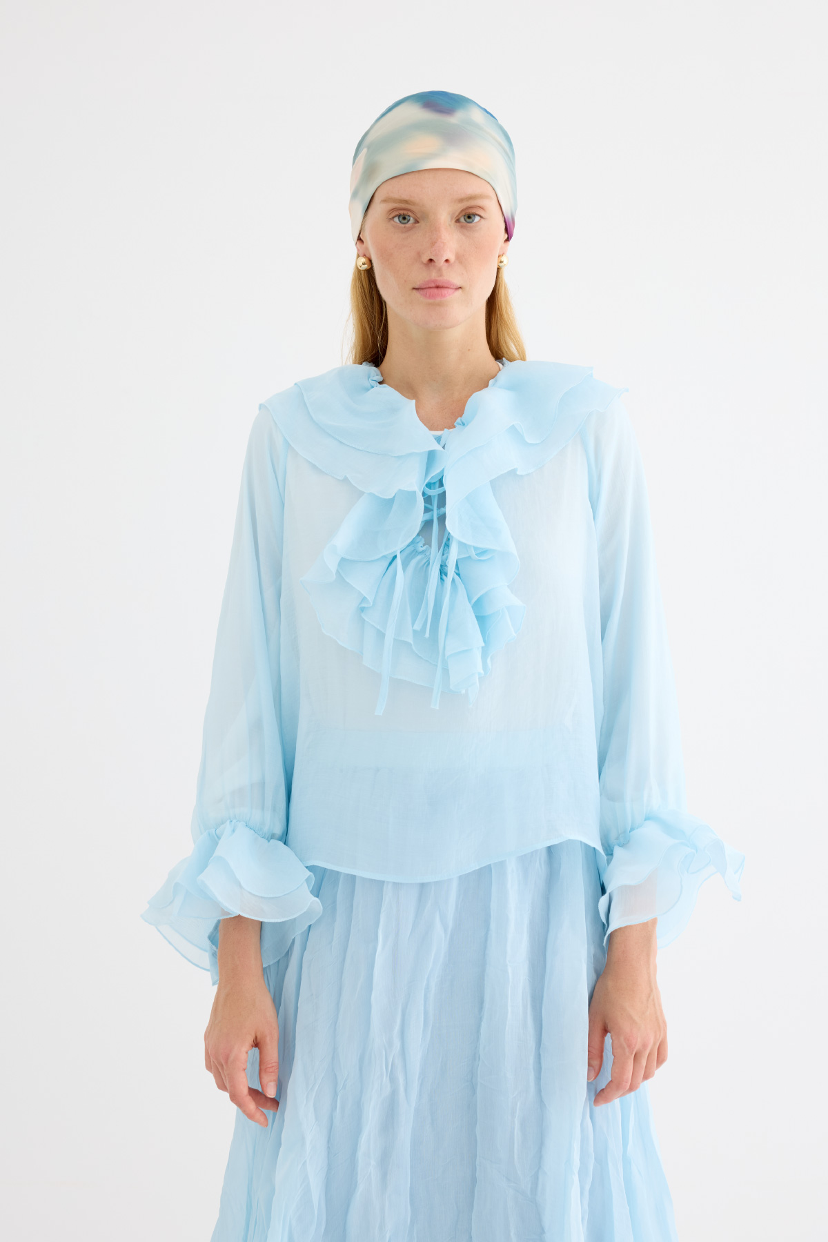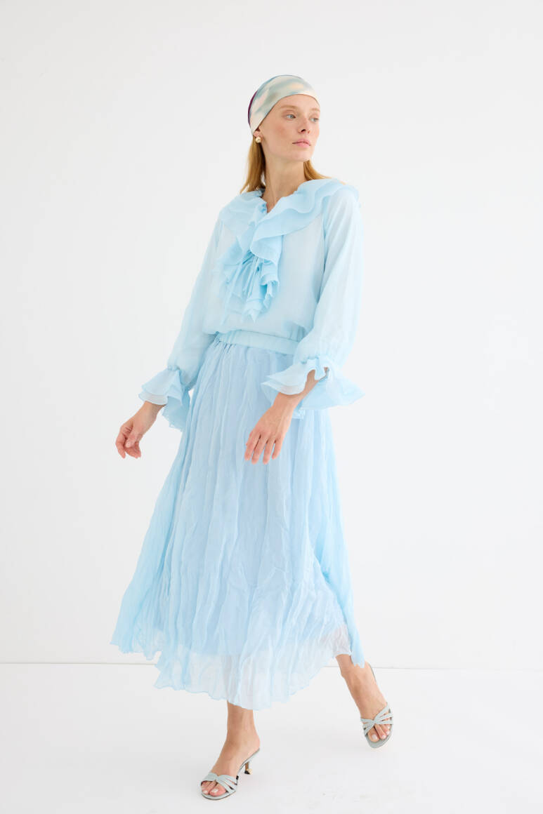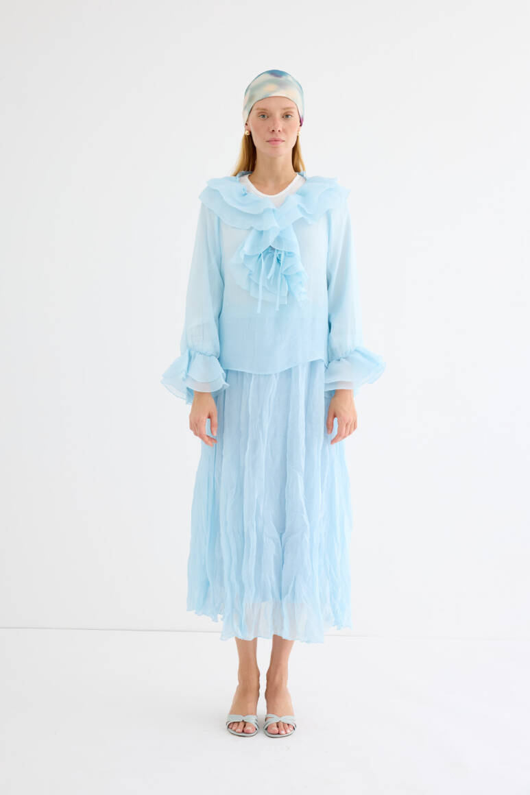 Romantizmin ve zarafetin buluştuğu bluz. Şifonun narin dokusu ve kat kat fırfır detayları, her kombine sofistike bir hava katıyor. Bağlamalı yaka detayı, modern bir dokunuş sağlarken, hem gündüz hem de gece şıklığını yakalar