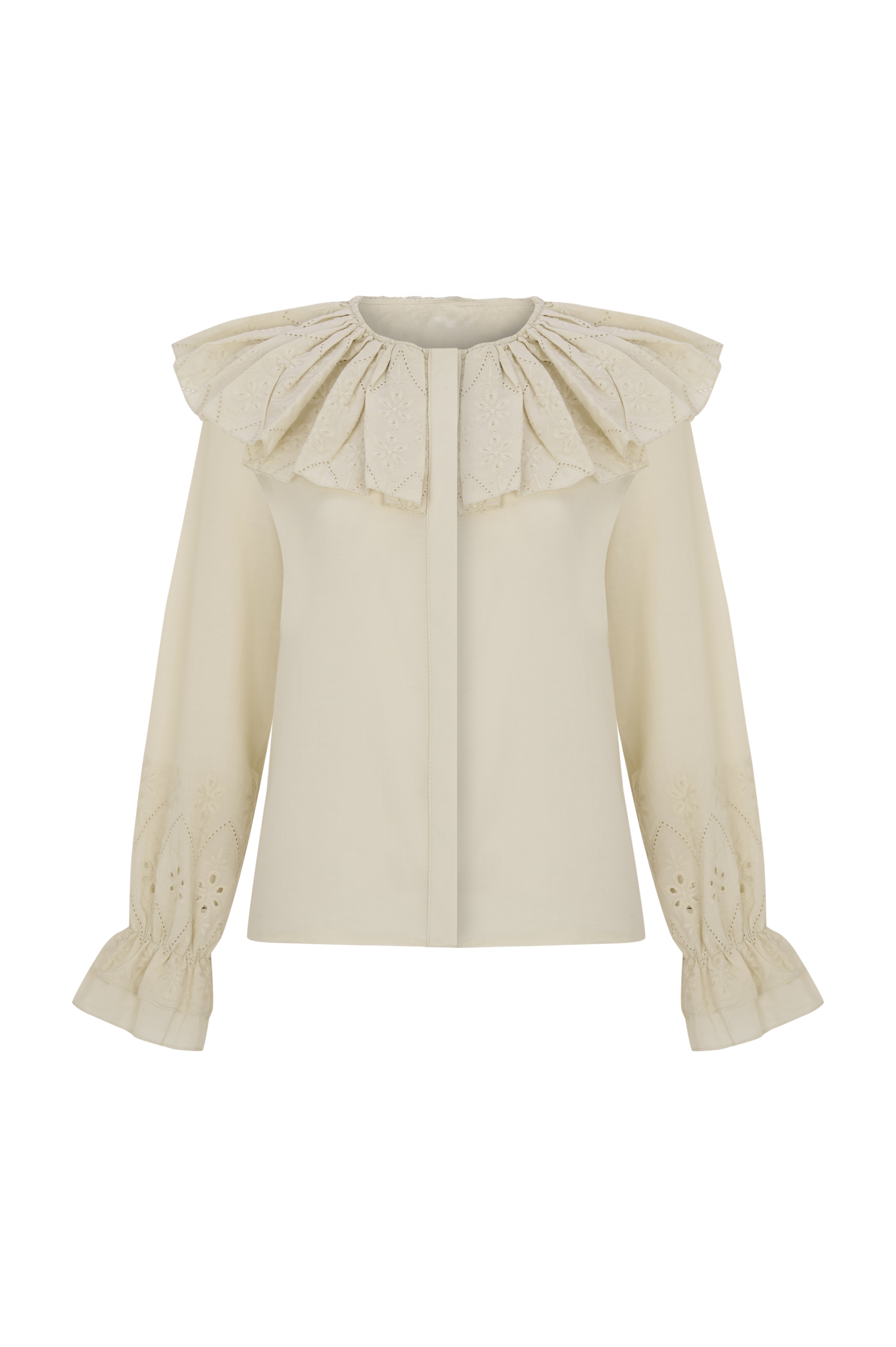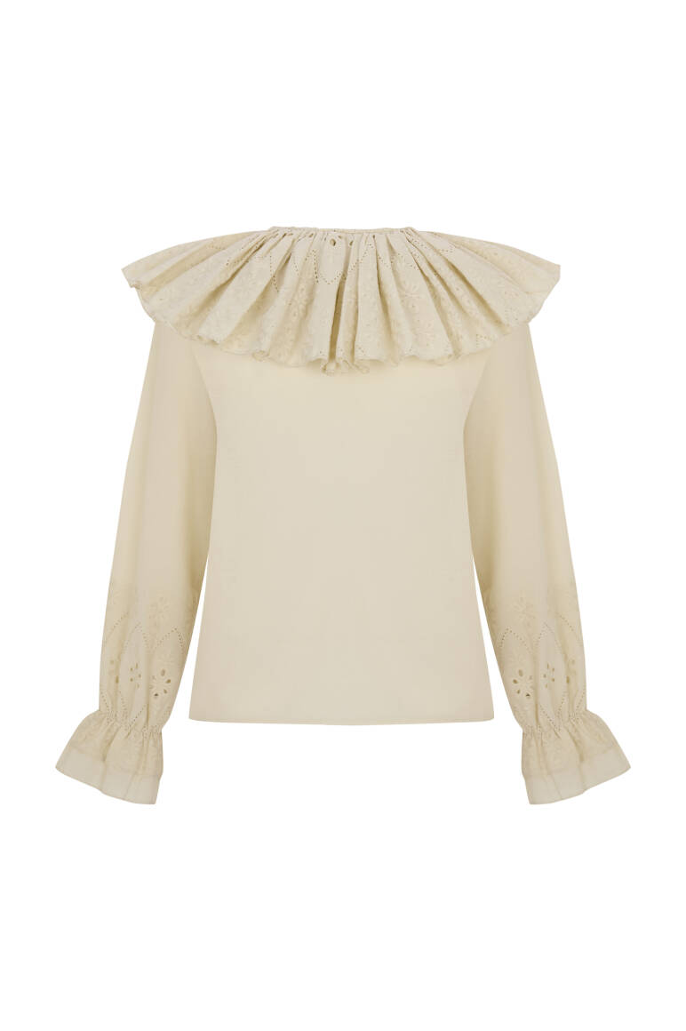 Zarif brode detayları ve fırfır süslemeli yakasıyla feminen bir şıklık sunan bu lacivert gömlek, sofistike görünümüyle stilinizi bir üst seviyeye taşıyor. %100 pamuk dokusu sayesinde gün boyu nefes alabilir ve konforlu bir kullanım sağlar.