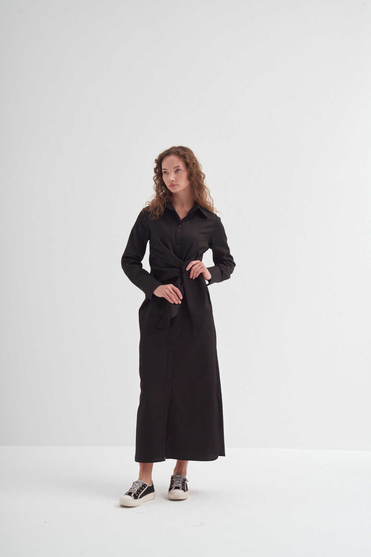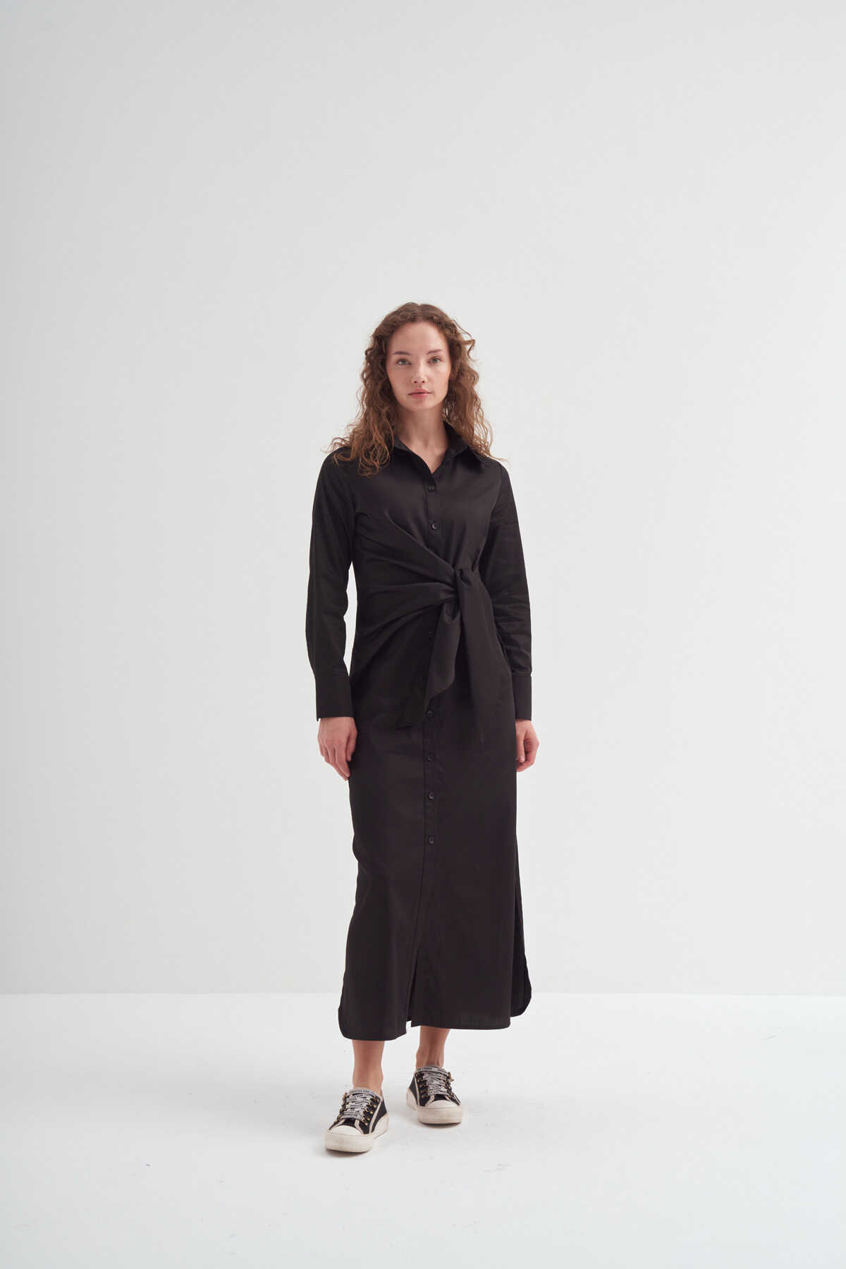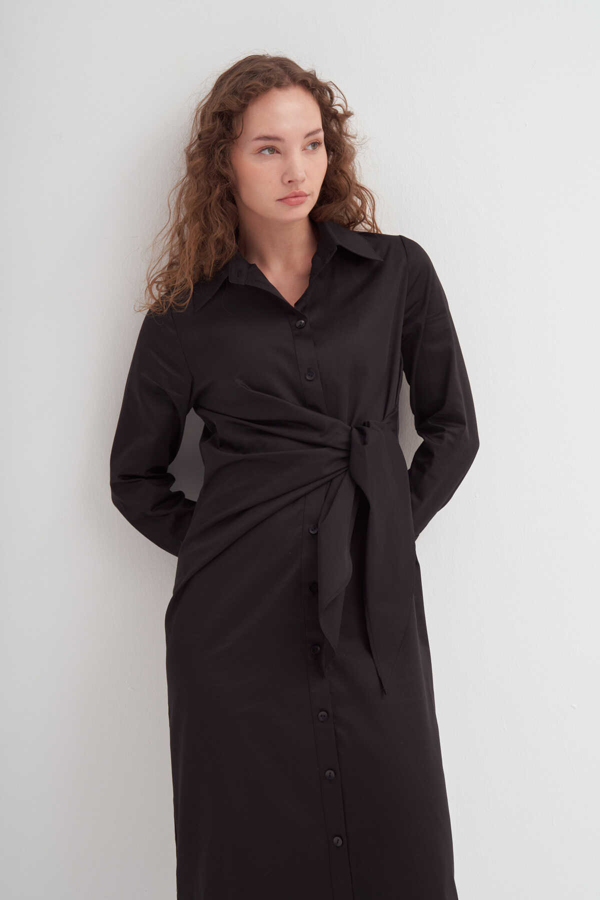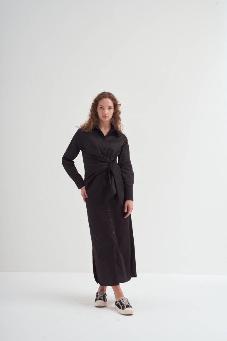 Yandan Düğümlü Gömlek Elbise Siyah