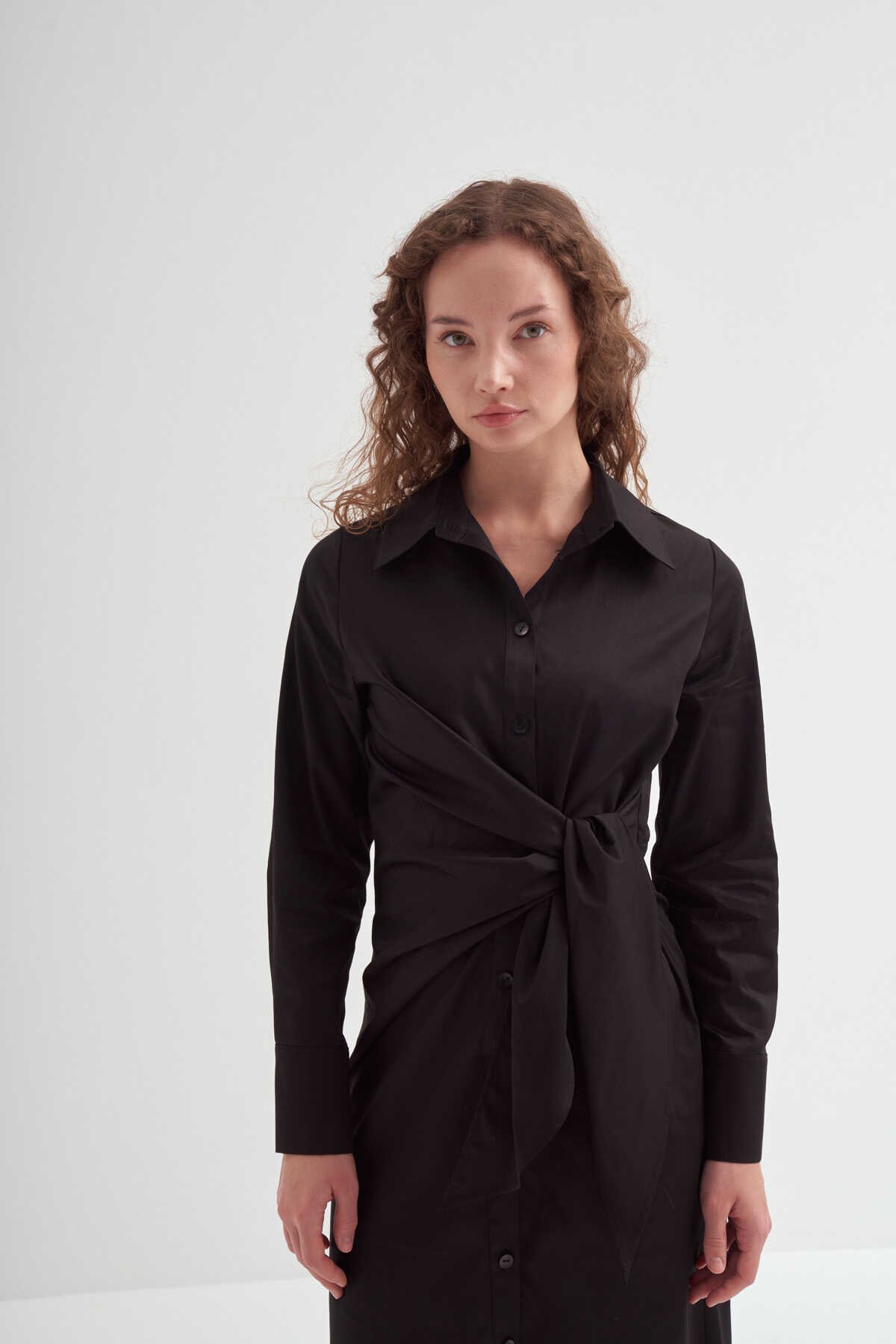 • Bağlama detaylı, uzun kollu, kusursuz özel formlu, %100 Pamuk saten, gömlek elbise
