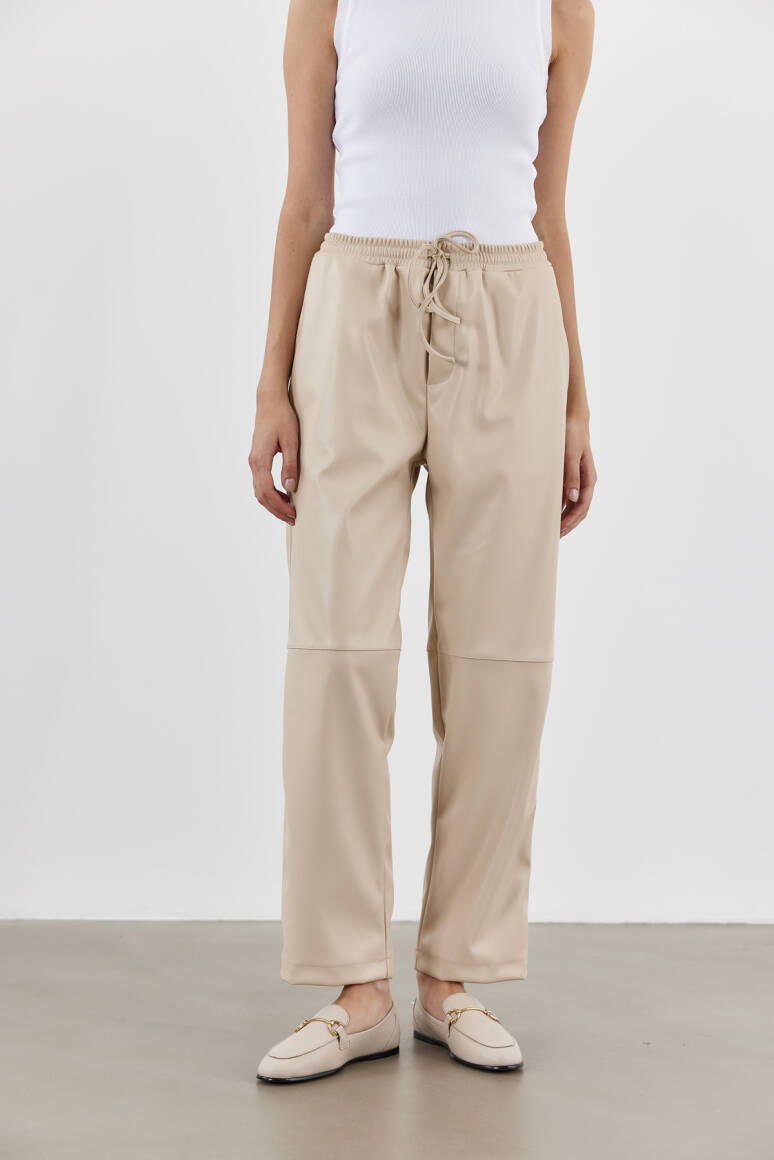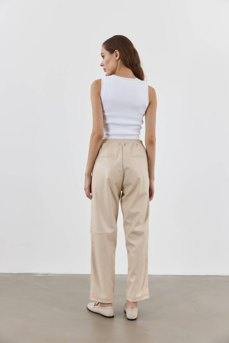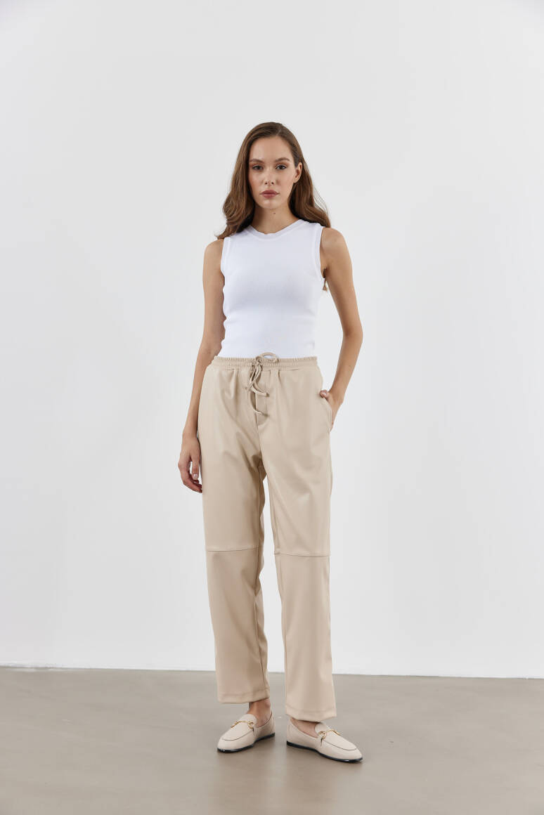 Yüksek bel, ayarlanabilir bağcıklı, cepli deri pantolon